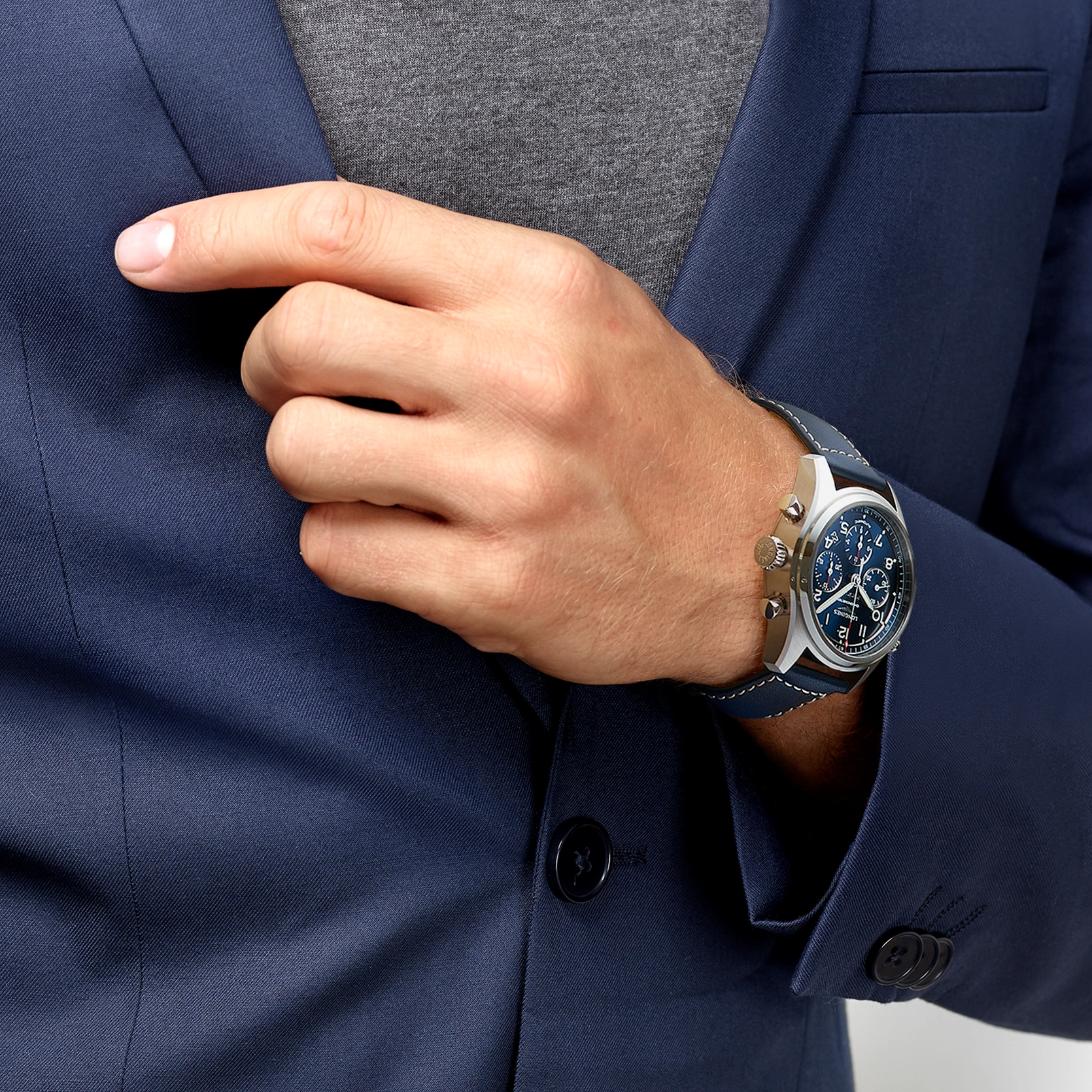 Ref. L3.820.4.93.0 - Chronograph Datum, Mechanisches Uhrwerk mit Automatikaufzug, Frequenz von 28.800 Halbschwingungen pro Stunde, Gangreserve von ca. 66 Stunden, mit Unruhfeder aus monokristallinem Silizium. Verschraubte Krone, Wasserdicht bis zu einem Druck von 10 bar, Kratzfestes Saphirglas mit mehreren Antireflexschichten auf beiden Seiten. Zifferblatt: Blau mit "Sonnenstrahl" Dekor, Swiss Super-LumiNova®. Lederarmband Armband, Mit Schließe.