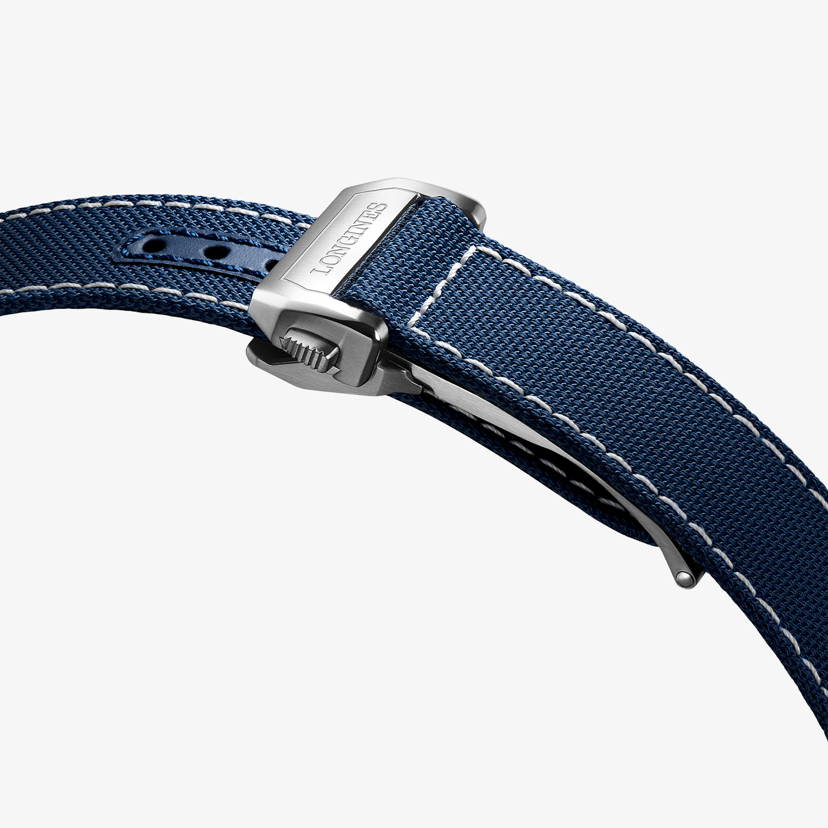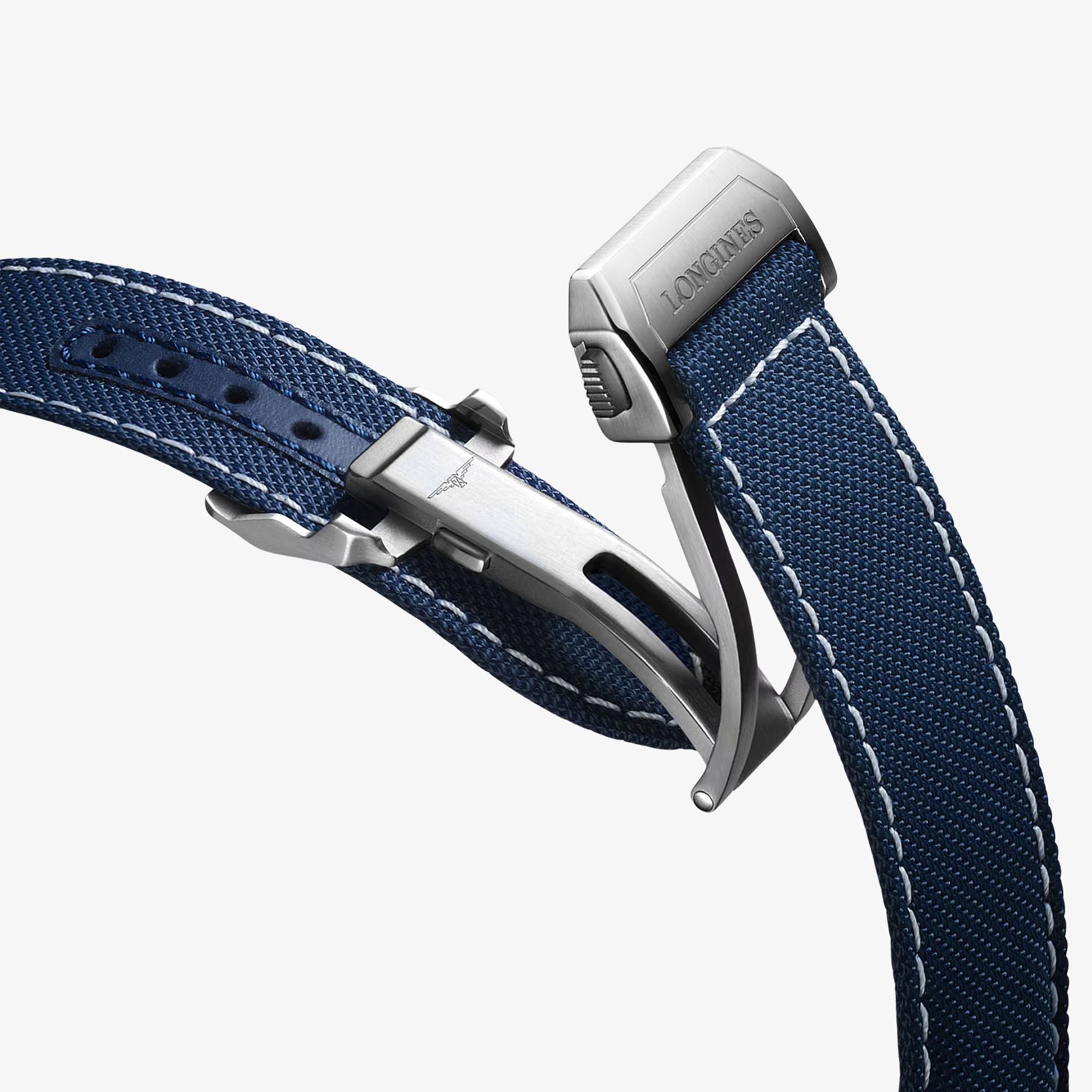 Ref. L3.821.4.93.2 - Chronograph Flyback, Mechanisches Uhrwerk mit Automatikaufzug, Frequenz von 28.800 Halbschwingungen pro Stunde, mit Unruhfeder aus monokristallinem Silizium, Gangreserve von ca. 68 Stunden. Beidseitig drehbare Lünette Verschraubte Krone, Wasserdicht bis zu einem Druck von 10 bar, Kratzfestes Saphirglas mit mehreren Antireflexschichten auf beiden Seiten. Zifferblatt: Blau mit "Sonnenstrahl" Dekor, Swiss Super-LumiNova®. Synthetik Armband, Mit doppelt gesicherte Faltschliesse mit Mikro-Verstellsystem.