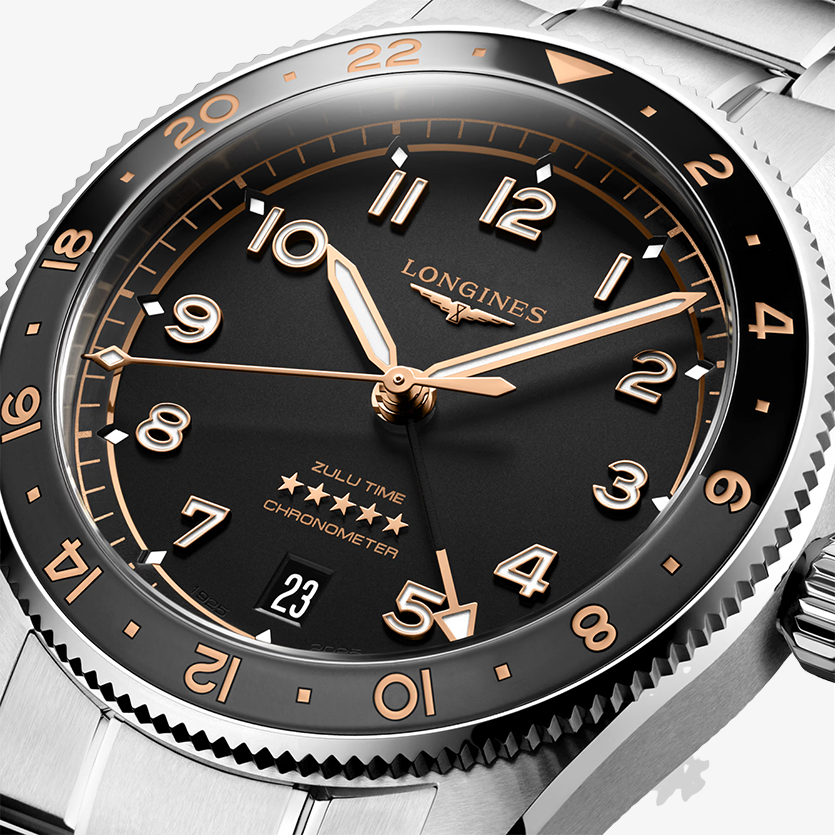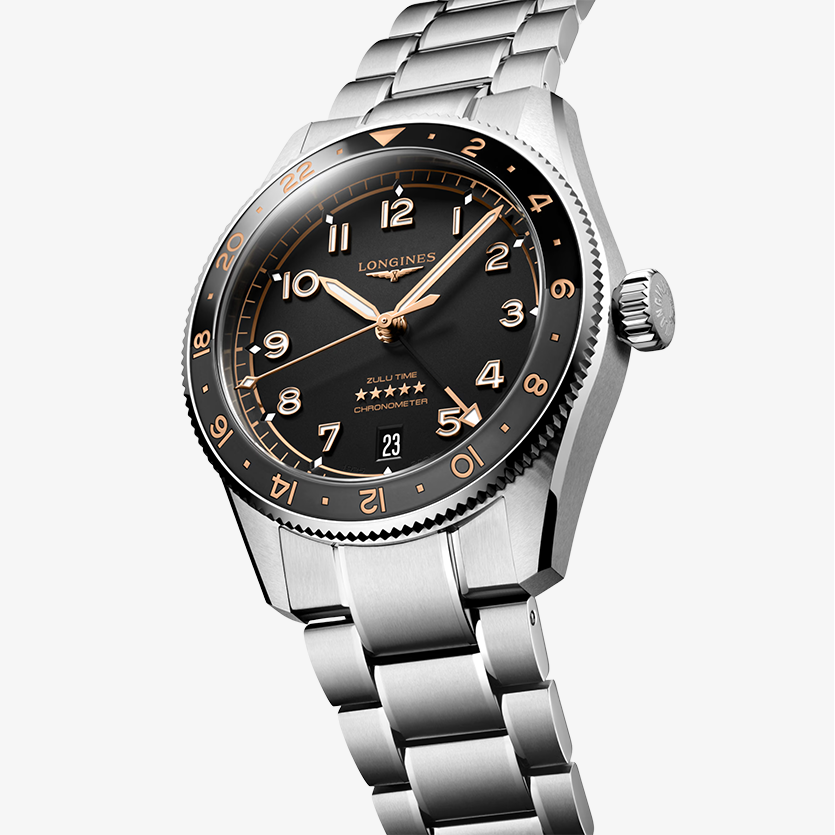 Ref. L3.802.4.50.6 - Die LONGINES Spirit Zulu Time verkörpert das jahrhundertealte Know-how der Marke bei Zeitmessern mit mehreren Zeitzonen. Ihr Ursprung und ihr Name sind von der ersten LONGINES Armbanduhr mit zwei Zeitzonen entlehnt, die 1925 hergestellt wurde und auf deren Zifferblatt die Zulu-Flagge abgebildet war. Zulu bezieht sich auf den Buchstaben „Z“, der die Weltzeit für Flieger angibt. Ästhetisch zeichnet sich die LONGINES Spirit Zulu Time durch ihre sorgfältige Ausführung und die besondere Sorgfalt aus, die den verschiedenen Details gewidmet wurde. Sie verfügt über eine beidseitig drehbare Lünette mit einem Keramikeinsatz. Jedes Modell wird von einem exklusiven LONGINES Kaliber angetrieben, das mit einer Unruhspiralfeder aus Silizium ausgestattet, gegen Magnetfelder resistent und von der COSC als Chronometer zertifiziert ist.