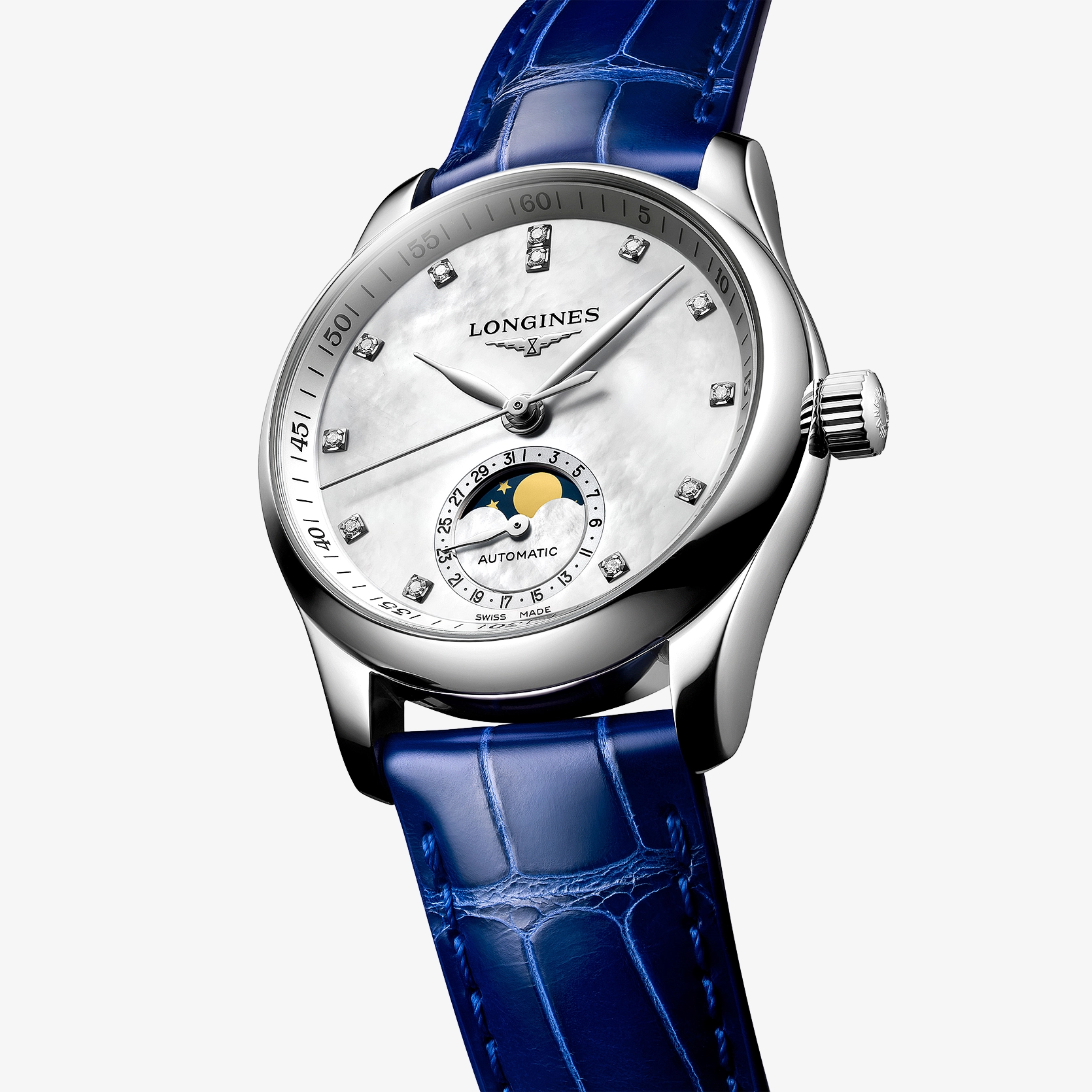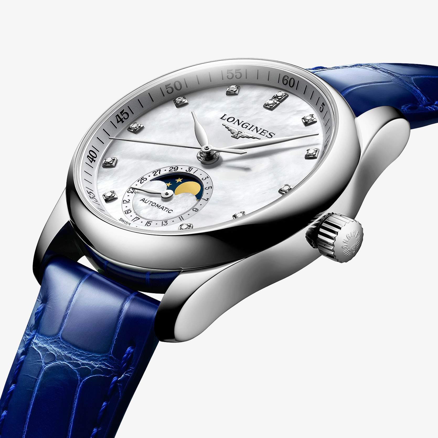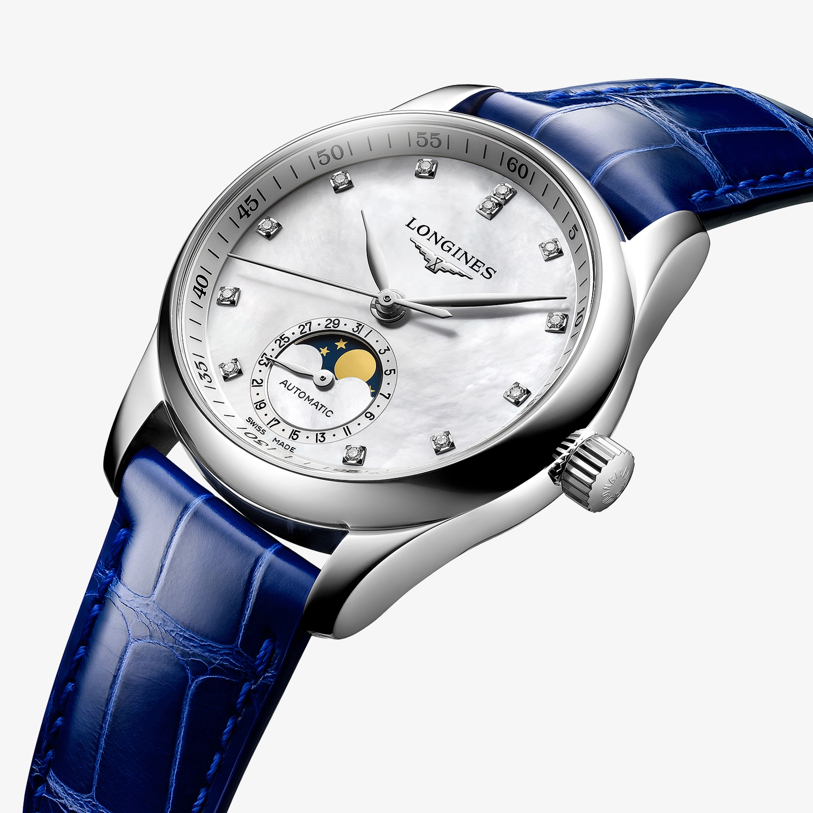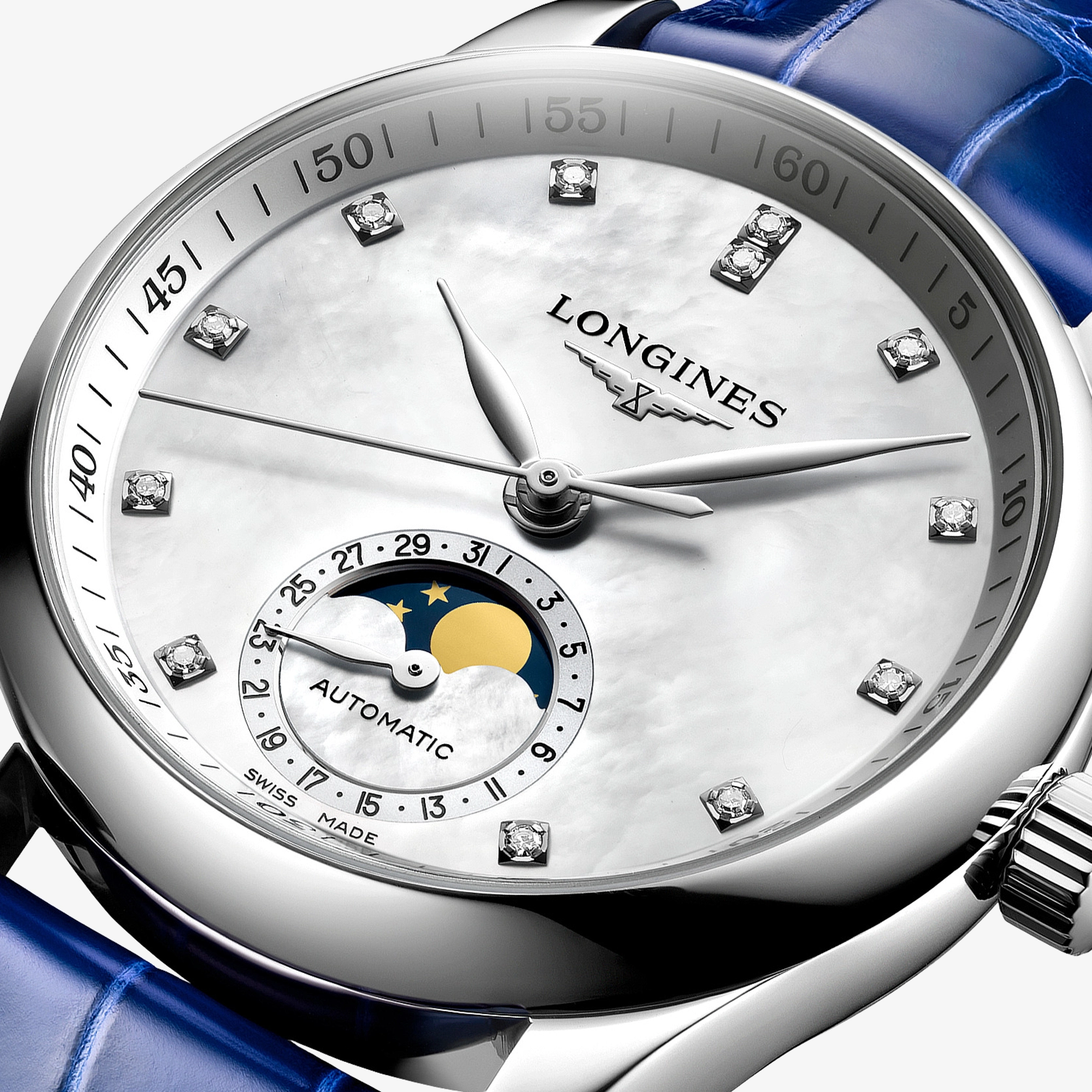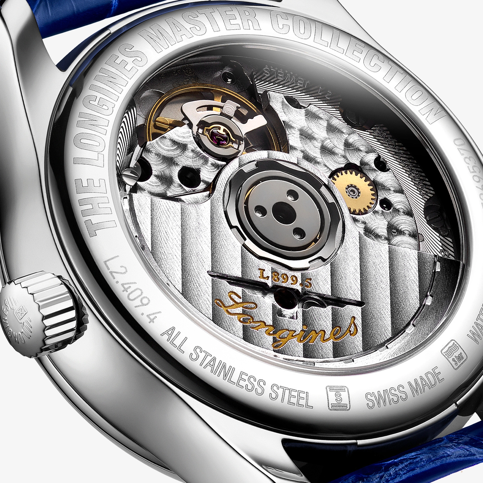 Ref. L2.409.4.87.0 - Mondphase, Mechanisches Uhrwerk mit Automatikaufzug, Frequenz von 25.200 Halbschwingungen pro Stunde, Gangreserve von ca. 72 Stunden. Wasserdicht bis zu einem Druck von 3 bar, Kratzfestes Saphirglas mit mehreren Antireflexschichten auf beiden Seiten. Zifferblatt: Weißes Perlmutt. Alligatorleder Armband, Mit Dreifach-Sicherheitsfaltschließe und Drückern.