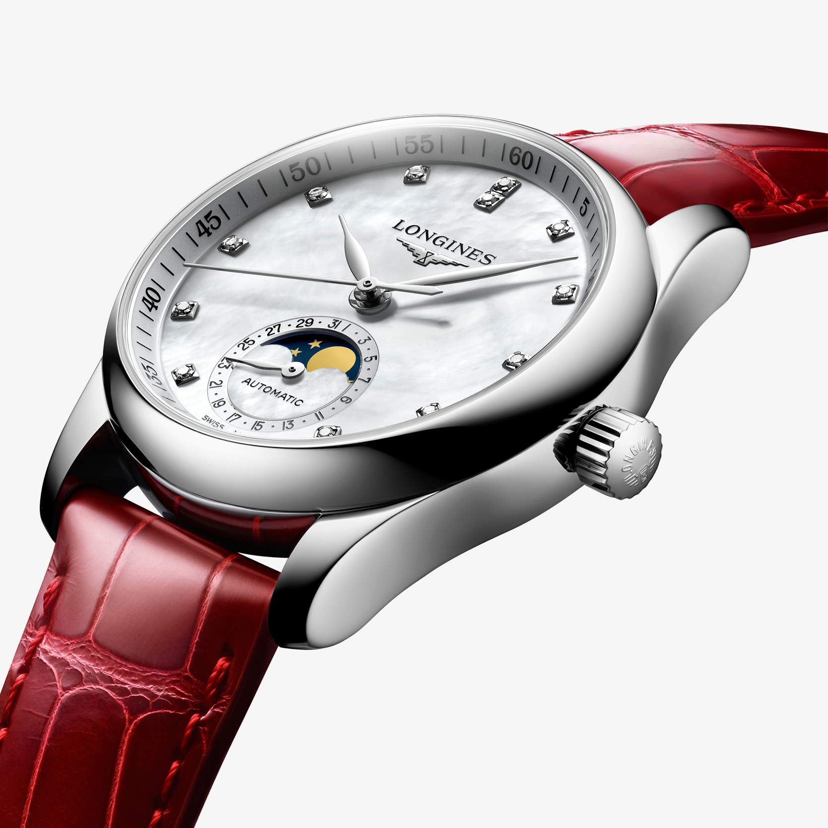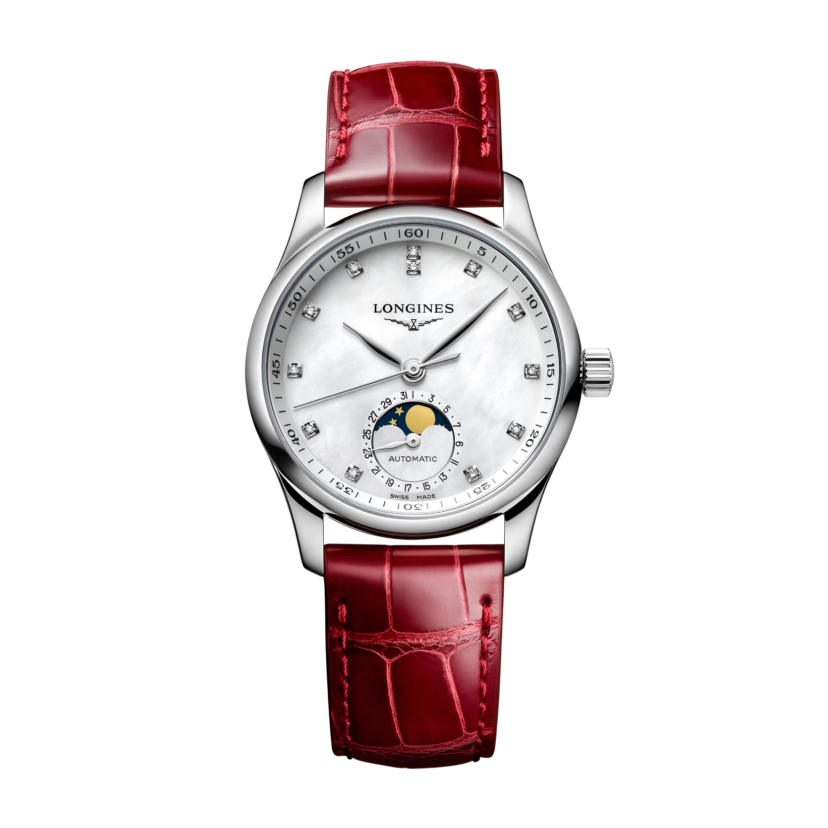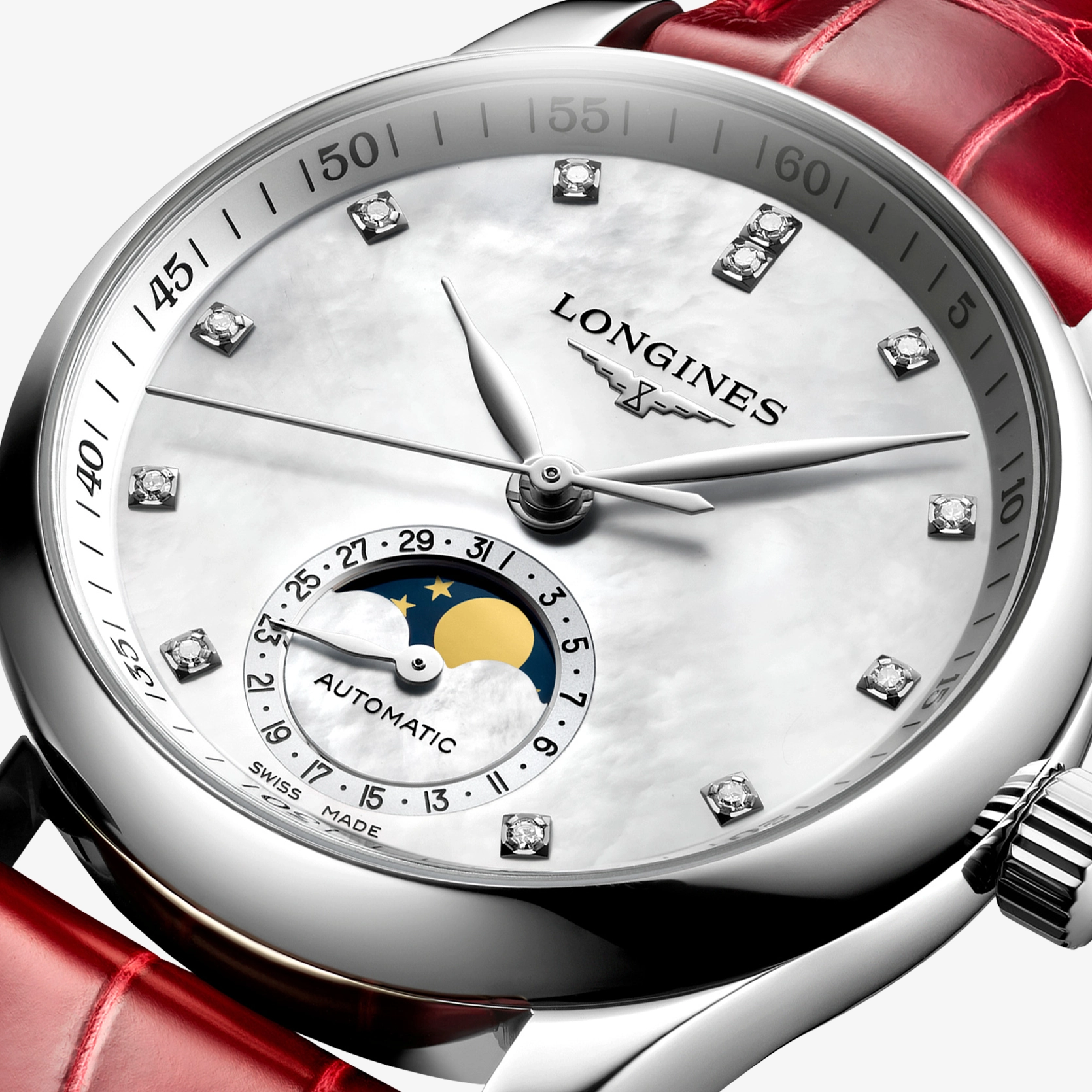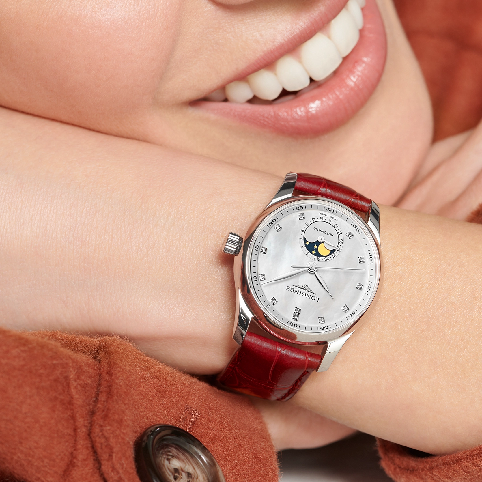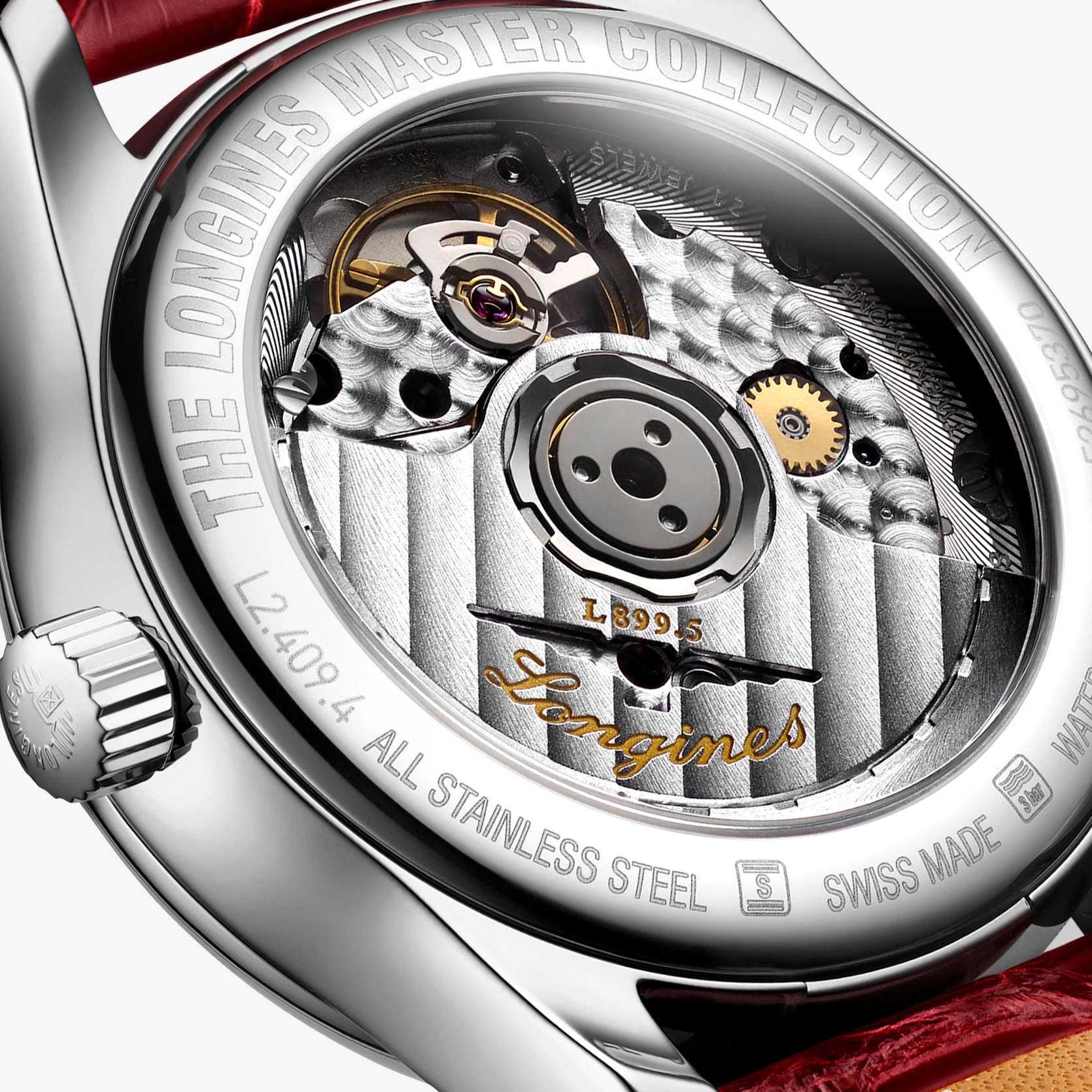 Ref. L2.409.4.87.2 - Mondphase, Mechanisches Uhrwerk mit Automatikaufzug, Frequenz von 25.200 Halbschwingungen pro Stunde, Gangreserve von ca. 72 Stunden. Wasserdicht bis zu einem Druck von 3 bar, Kratzfestes Saphirglas mit mehreren Antireflexschichten auf beiden Seiten. Zifferblatt: Weißes Perlmutt. Alligatorleder Armband, Mit Dreifach-Sicherheitsfaltschließe und Drückern.