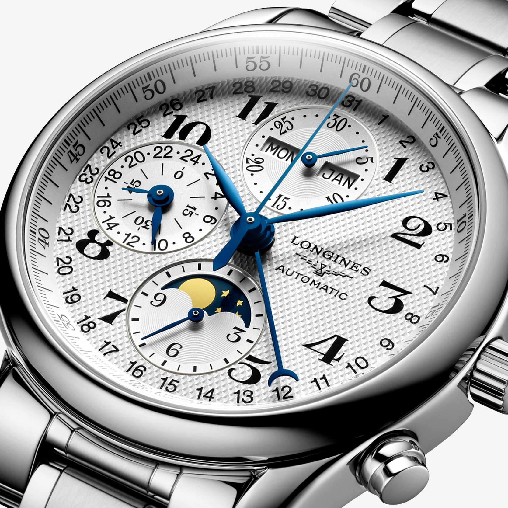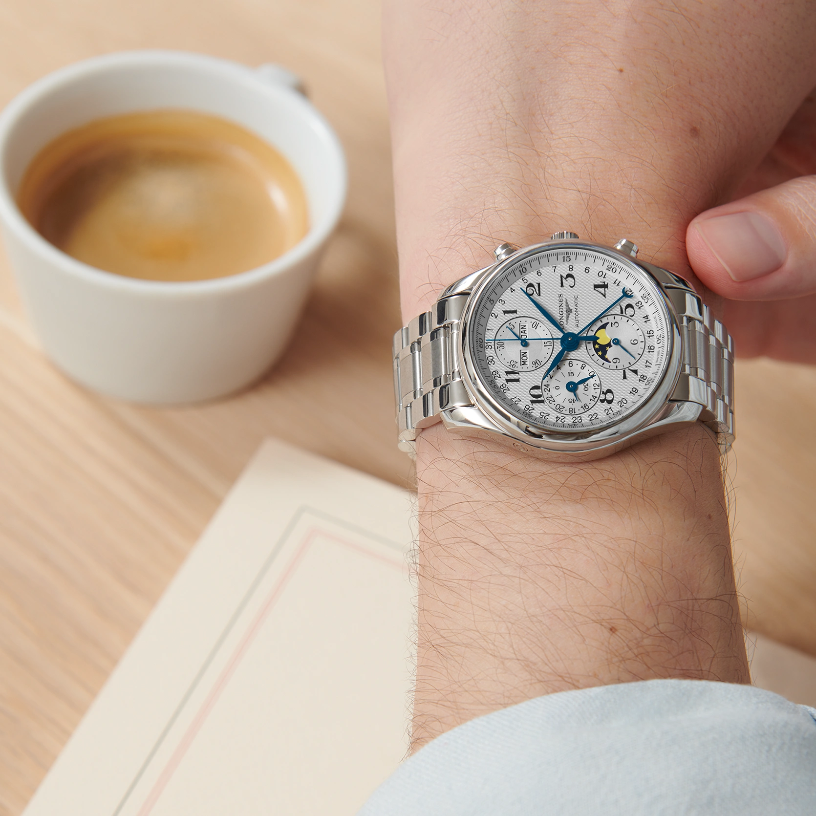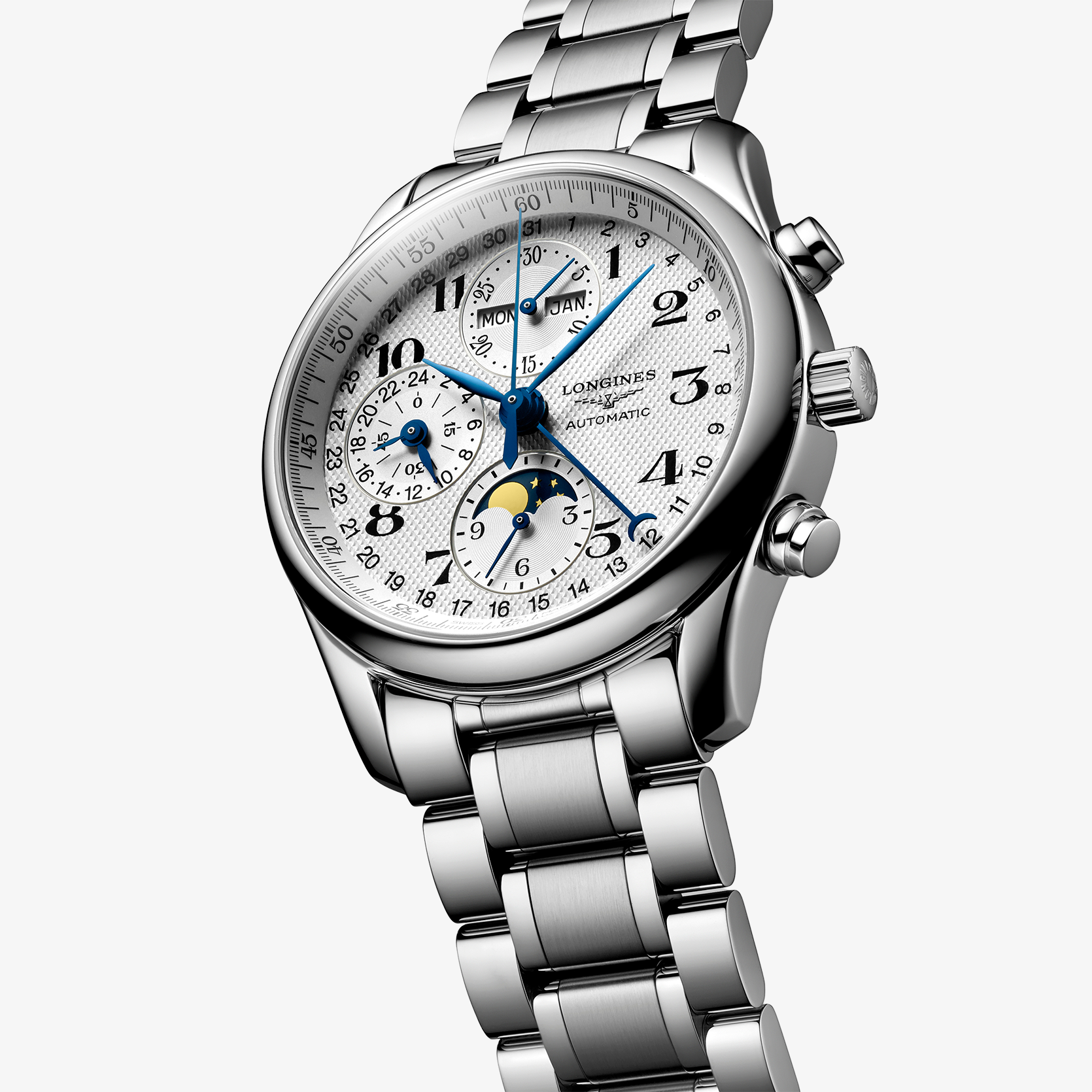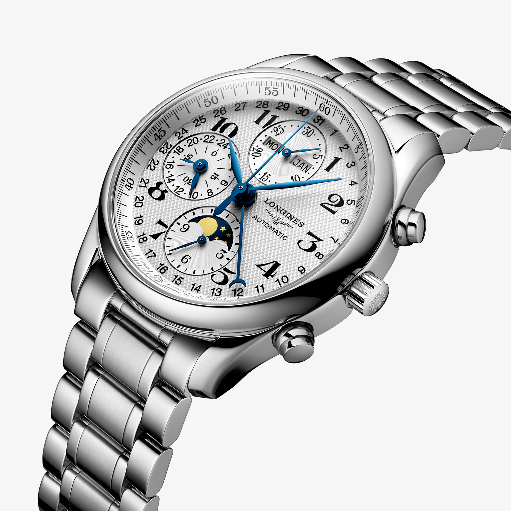 Ref. L2.673.4.78.6 - Chronograph Mondphase, Mechanisches Uhrwerk mit Automatikaufzug, Frequenz von 28.800 Halbschwingungen pro Stunde, Gangreserve von ca. 66 Stunden. Wasserdicht bis zu einem Druck von 3 bar, Kratzfestes Saphirglas. Zifferblatt: Silber mit Gerstenkorn-Muster. Edelstahl Armband, Mit Dreifach-Sicherheitsfaltschließe und Drückern.