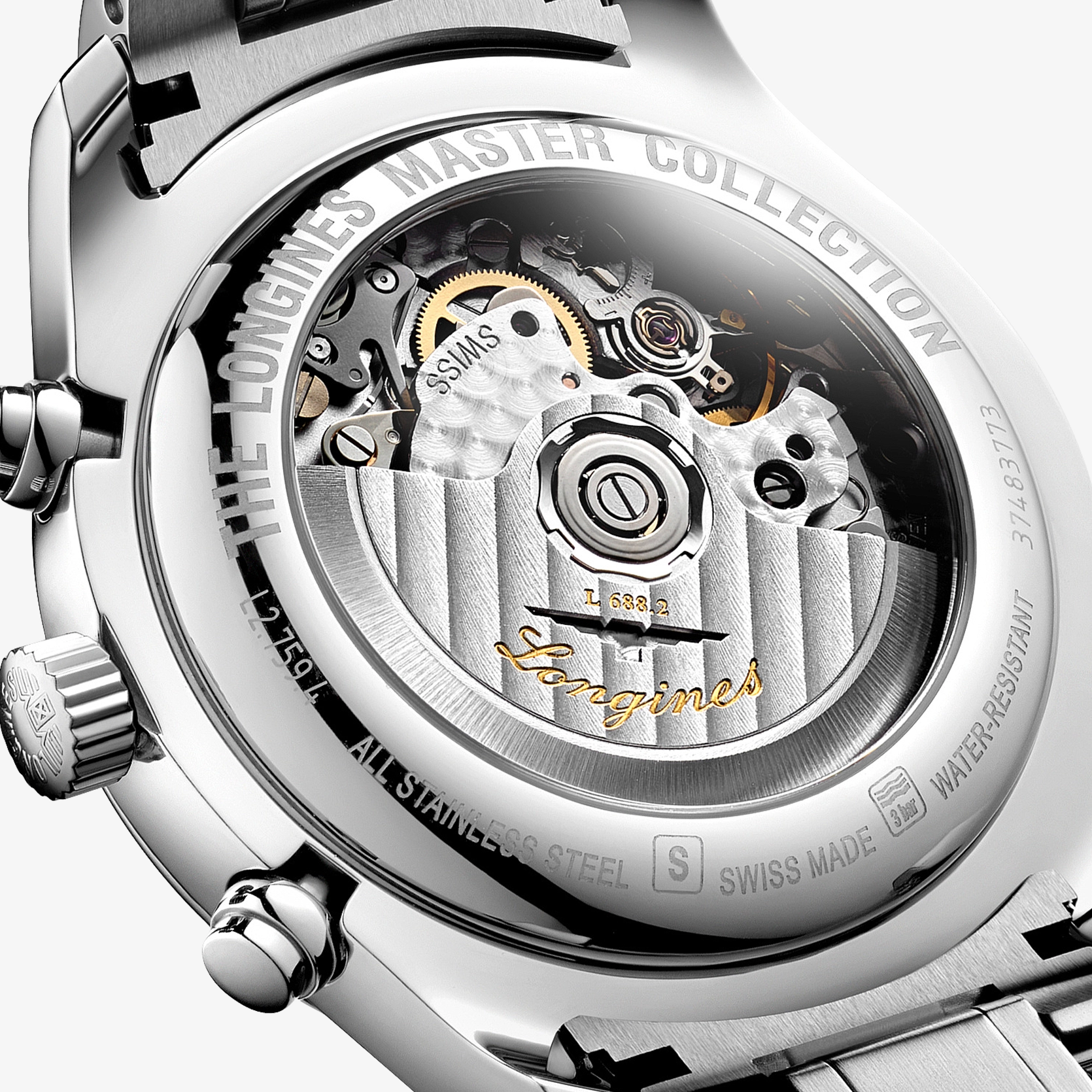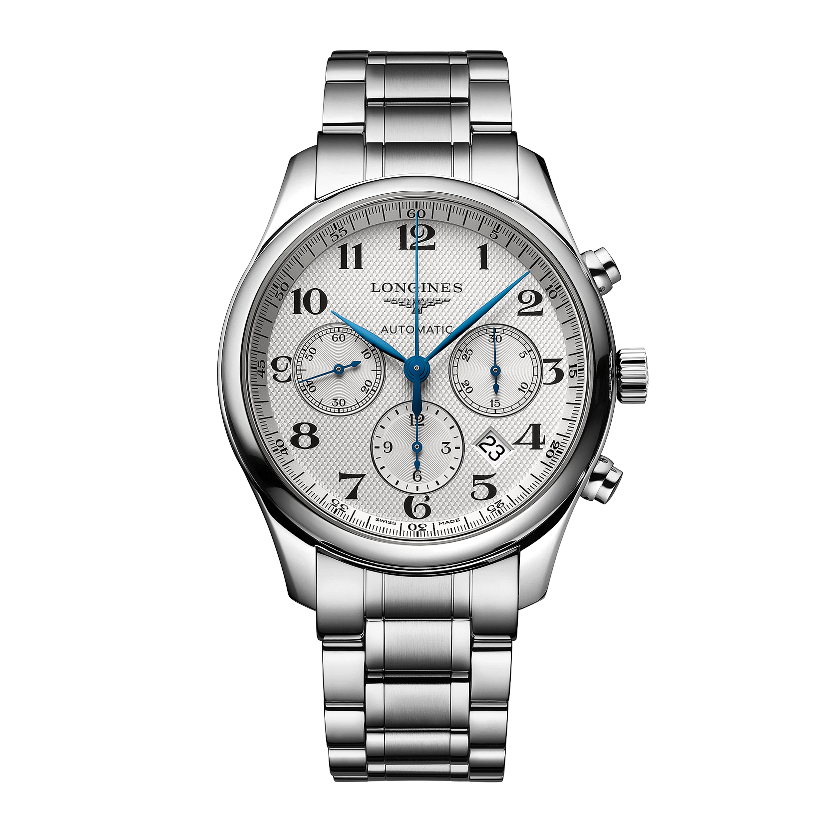 Ref. L2.759.4.78.6 - Chronograph Datum, Mechanisches Uhrwerk mit Automatikaufzug, Frequenz von 28.800 Halbschwingungen pro Stunde, Gangreserve von ca. 60 Stunden. Wasserdicht bis zu einem Druck von 3 bar, Kratzfestes Saphirglas. Zifferblatt: Silber mit Gerstenkorn-Muster. Edelstahl Armband, Mit Dreifach-Sicherheitsfaltschließe und Drückern.