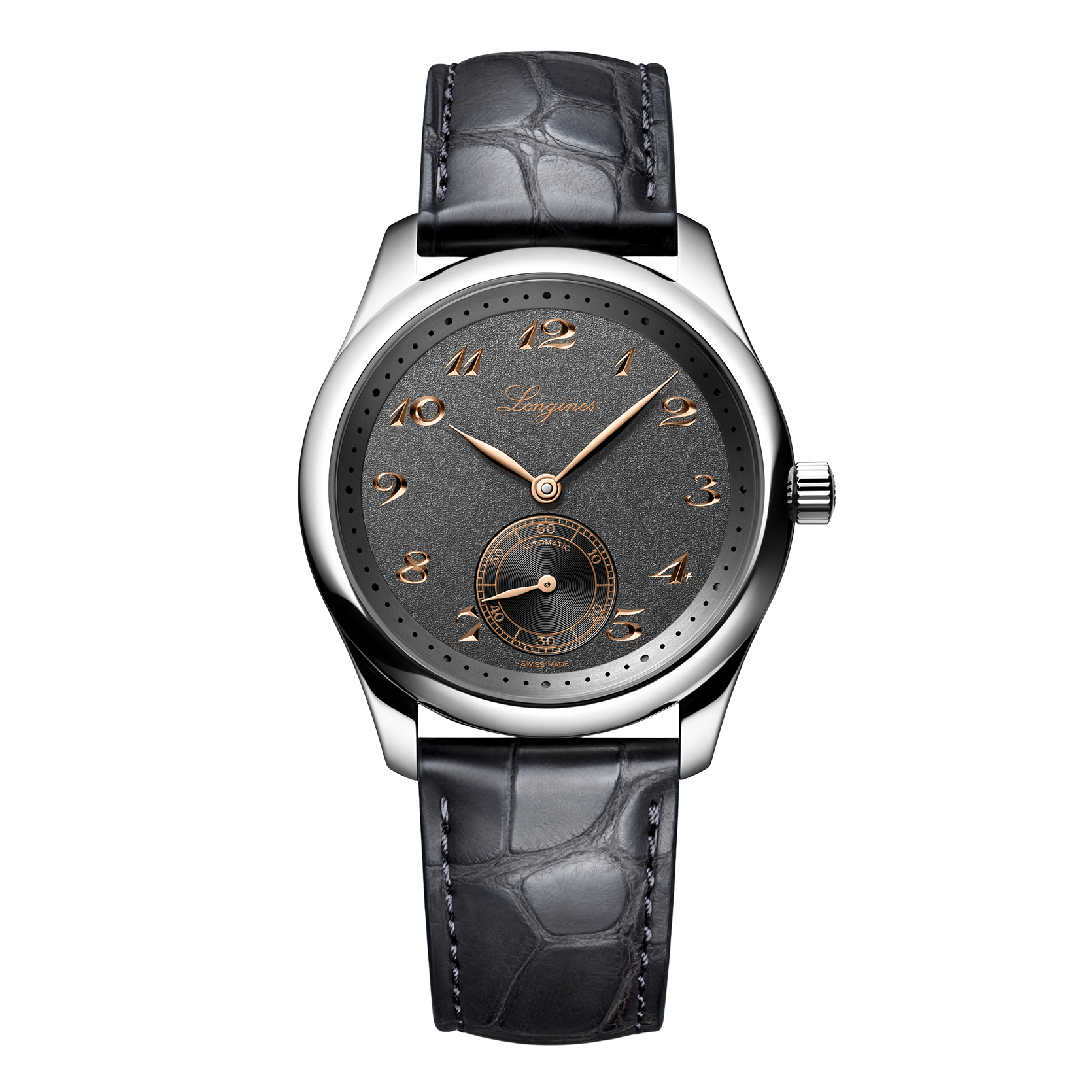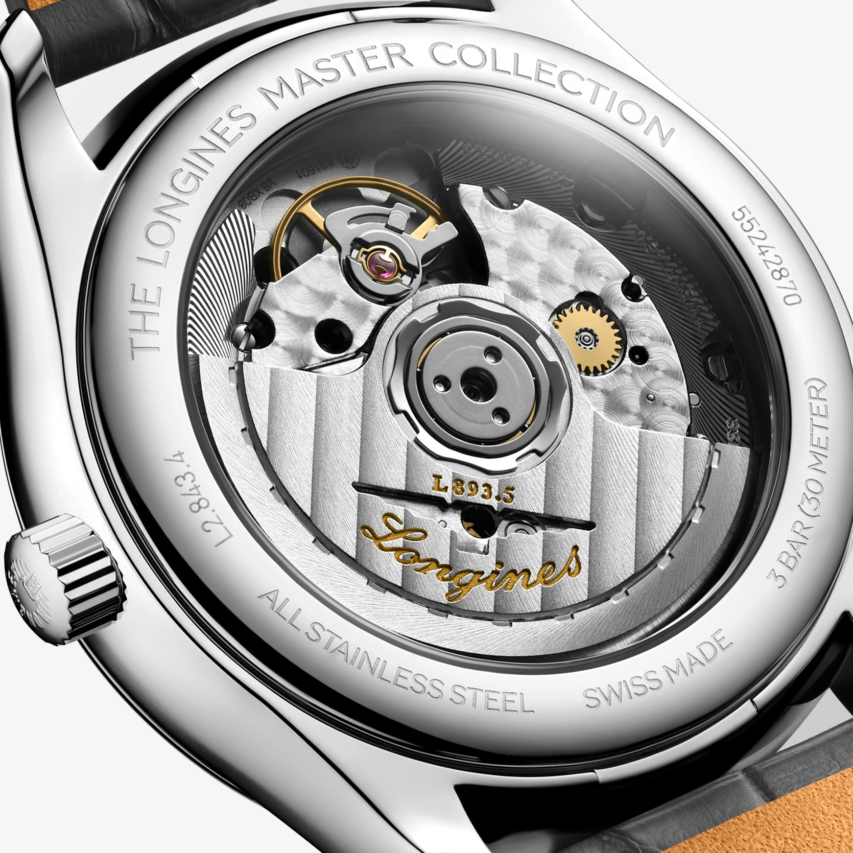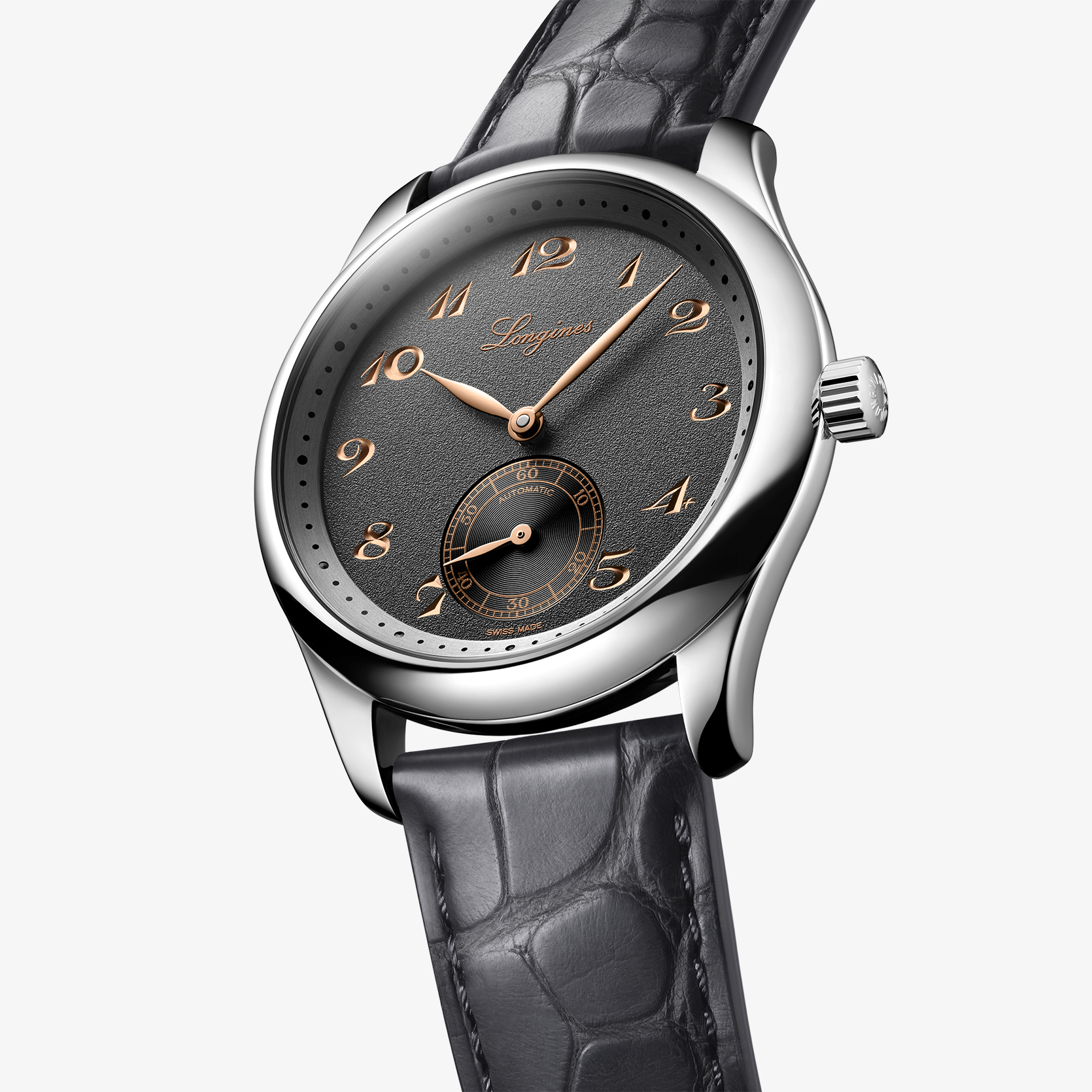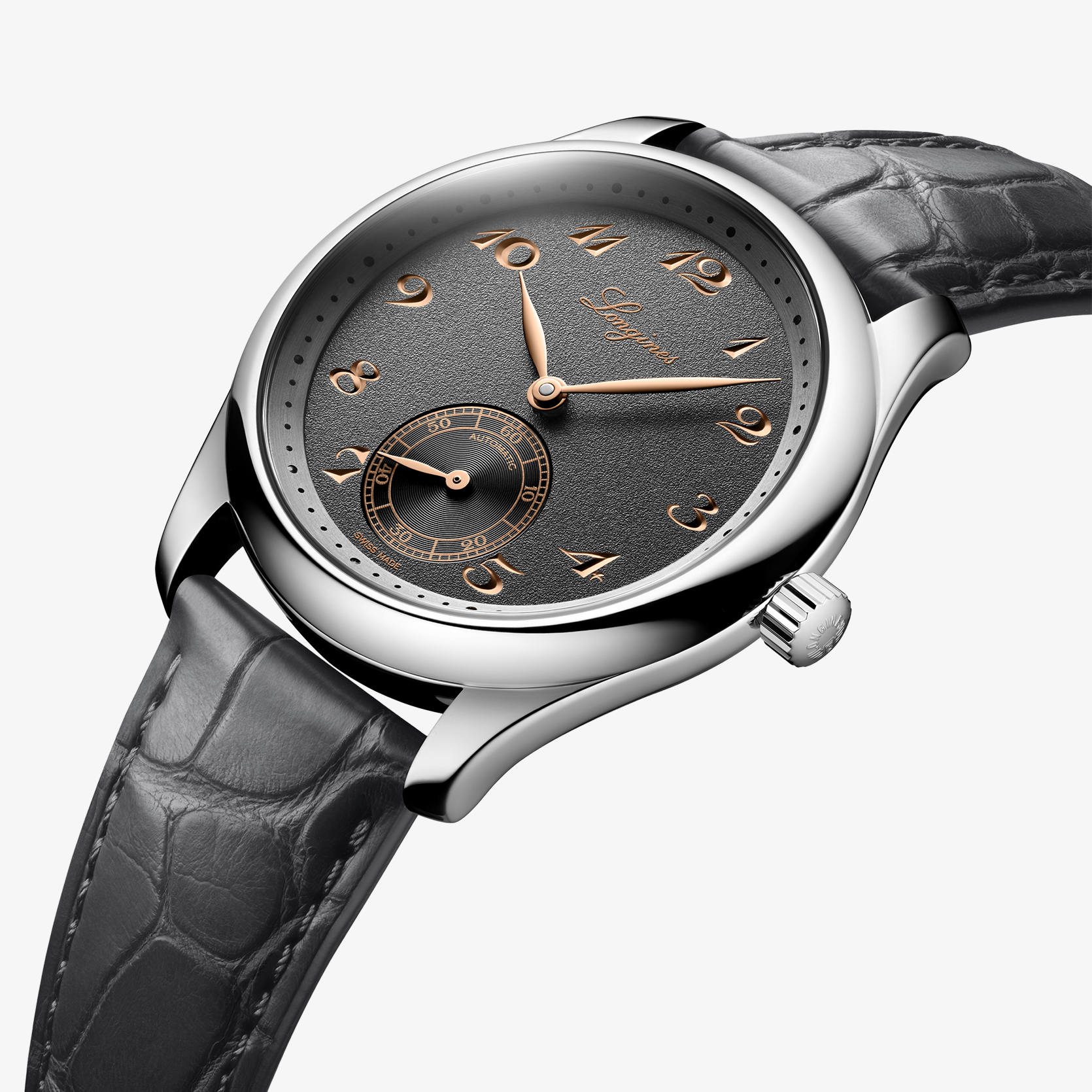 Ref. L2.843.4.63.2 - Mechanisches Uhrwerk mit Automatikaufzug, Frequenz von 25.200 Halbschwingungen pro Stunde, Gangreserve von ca. 72 Stunden, mit Unruhfeder aus monokristallinem Silizium. Wasserdicht bis zu einem Druck von 3 bar, Kratzfestes Saphirglas mit mehreren Antireflexschichten auf beiden Seiten. Zifferblatt: Anthrazit. Alligatorleder Armband, Mit Dreifach-Sicherheitsfaltschließe und Drückern.