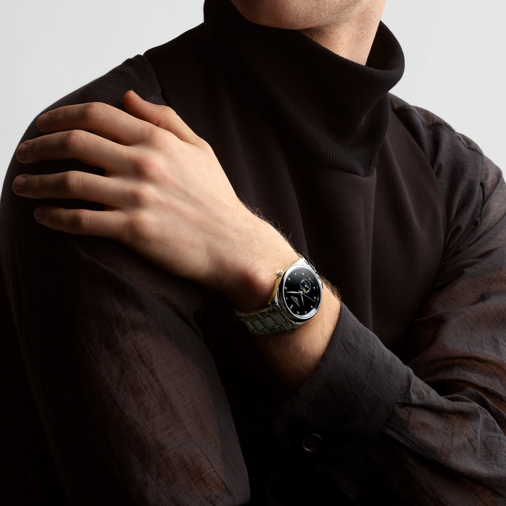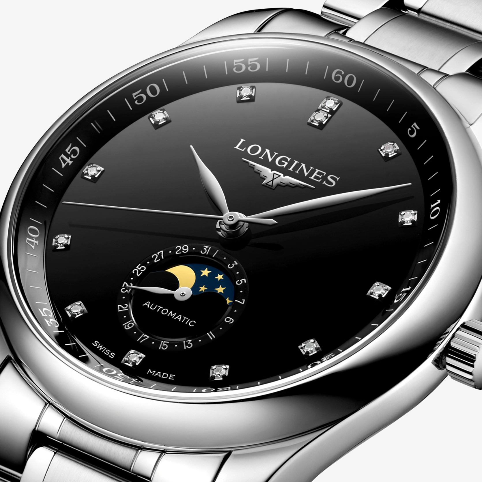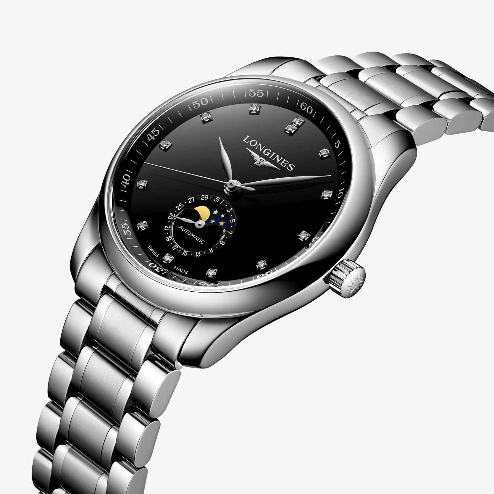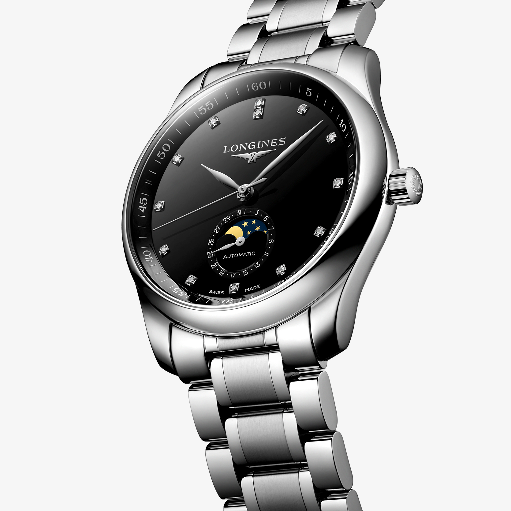 Ref. L2.909.4.57.6 - Mondphase, Mechanisches Uhrwerk mit Automatikaufzug, Frequenz von 25.200 Halbschwingungen pro Stunde, Gangreserve von ca. 72 Stunden. Wasserdicht bis zu einem Druck von 3 bar, Kratzfestes Saphirglas. Zifferblatt: Schwarz lackiert, poliert. Edelstahl Armband, Mit Dreifach-Sicherheitsfaltschließe und Drückern.