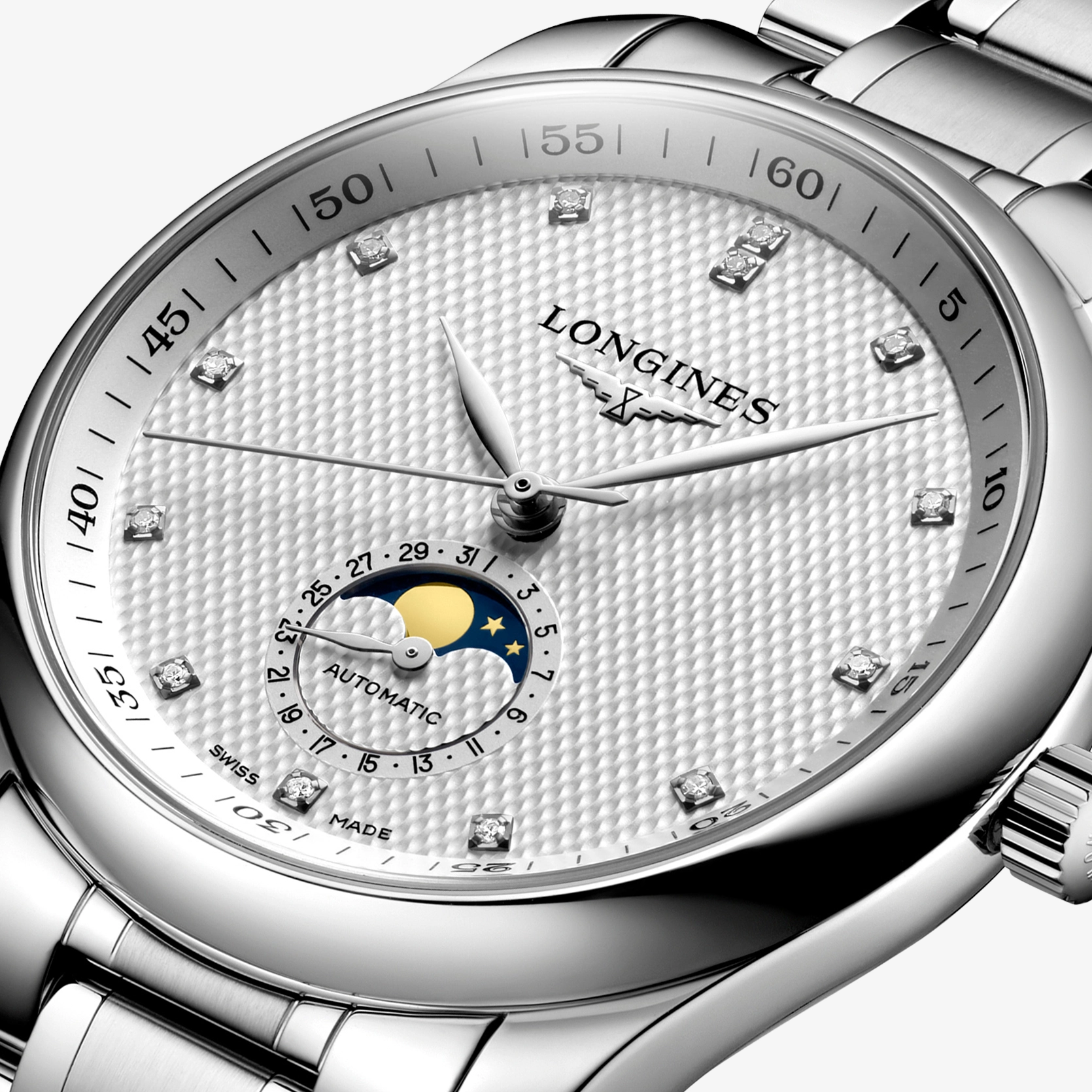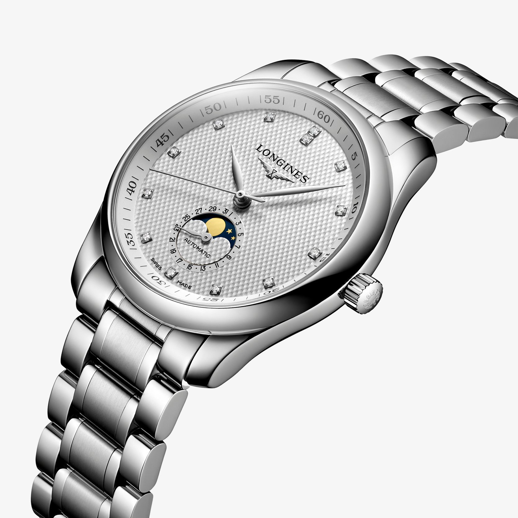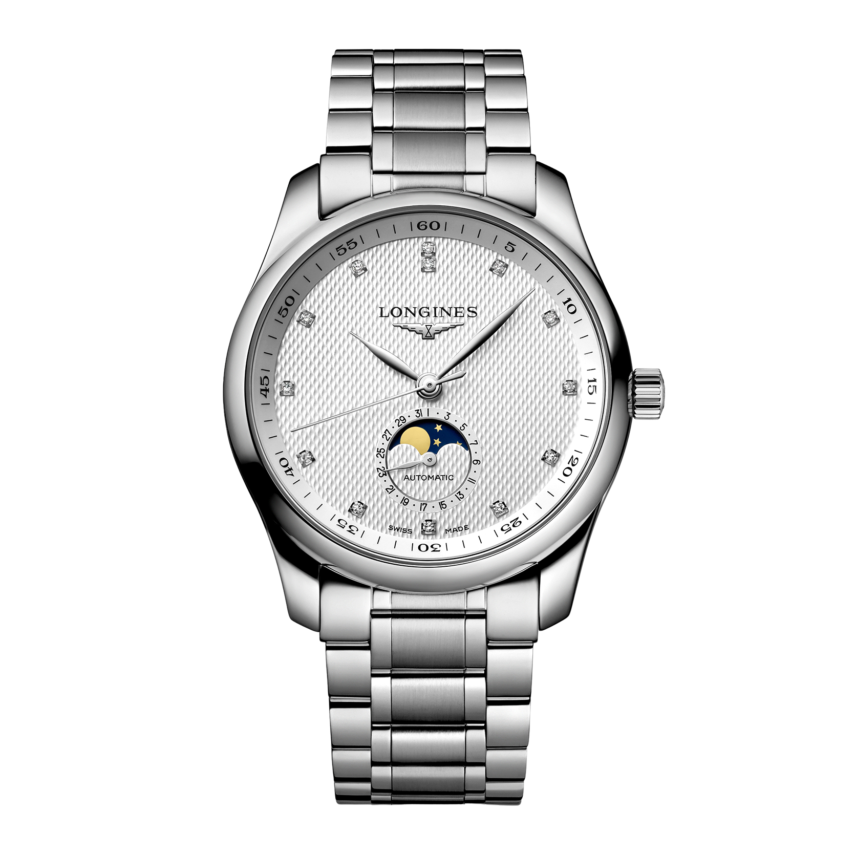 Ref. L2.909.4.77.6 - Mondphase, Mechanisches Uhrwerk mit Automatikaufzug, Frequenz von 25.200 Halbschwingungen pro Stunde, Gangreserve von ca. 72 Stunden. Wasserdicht bis zu einem Druck von 3 bar, Kratzfestes Saphirglas. Zifferblatt: Silber mit Gerstenkorn-Muster. Edelstahl Armband, Mit Dreifach-Sicherheitsfaltschließe und Drückern.