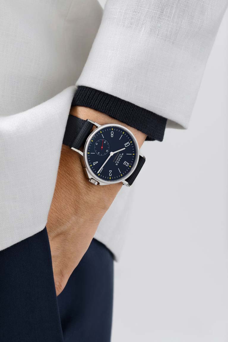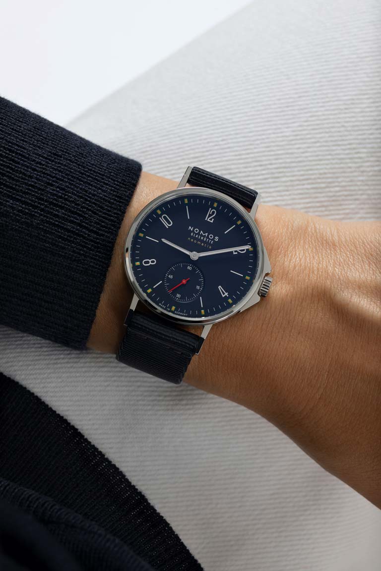 Das von NOMOS entwickelte Uhrwerk misst nur 3,2 Millimeter in der Höhe – so viel wie neun übereinanderliegende Briefmarken – und ist damit ausgesprochen schlank. Getaktet wird die Zeit von einem Assortiment aus eigener Manufaktur, dem berühmten NOMOS-Swing-System. Mit einem Gehäusedurchmesser von 36 Millimetern ist Ahoi neomatik Atlantik das kleinste Modell aus der Ahoi Atlantik-Edition. Die Uhr ist bis 20 atm wasserdicht. Bereit für die Tiefsee und die Oper City-Lauf, Networking-Event oder Auszeit am Pool – diese Uhr sorgt überall für gute Stimmung. Mit einem Gehäusedurchmesser von 36 Millimetern passt Ahoi neomatik Atlantik gut an schmale Handgelenke.