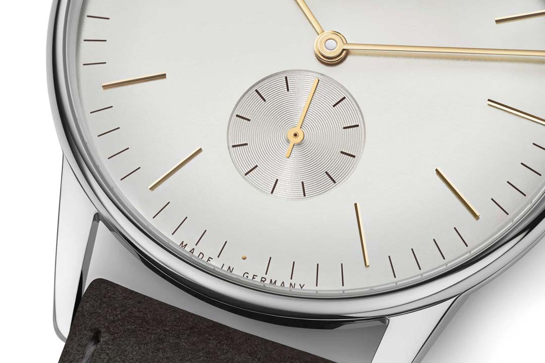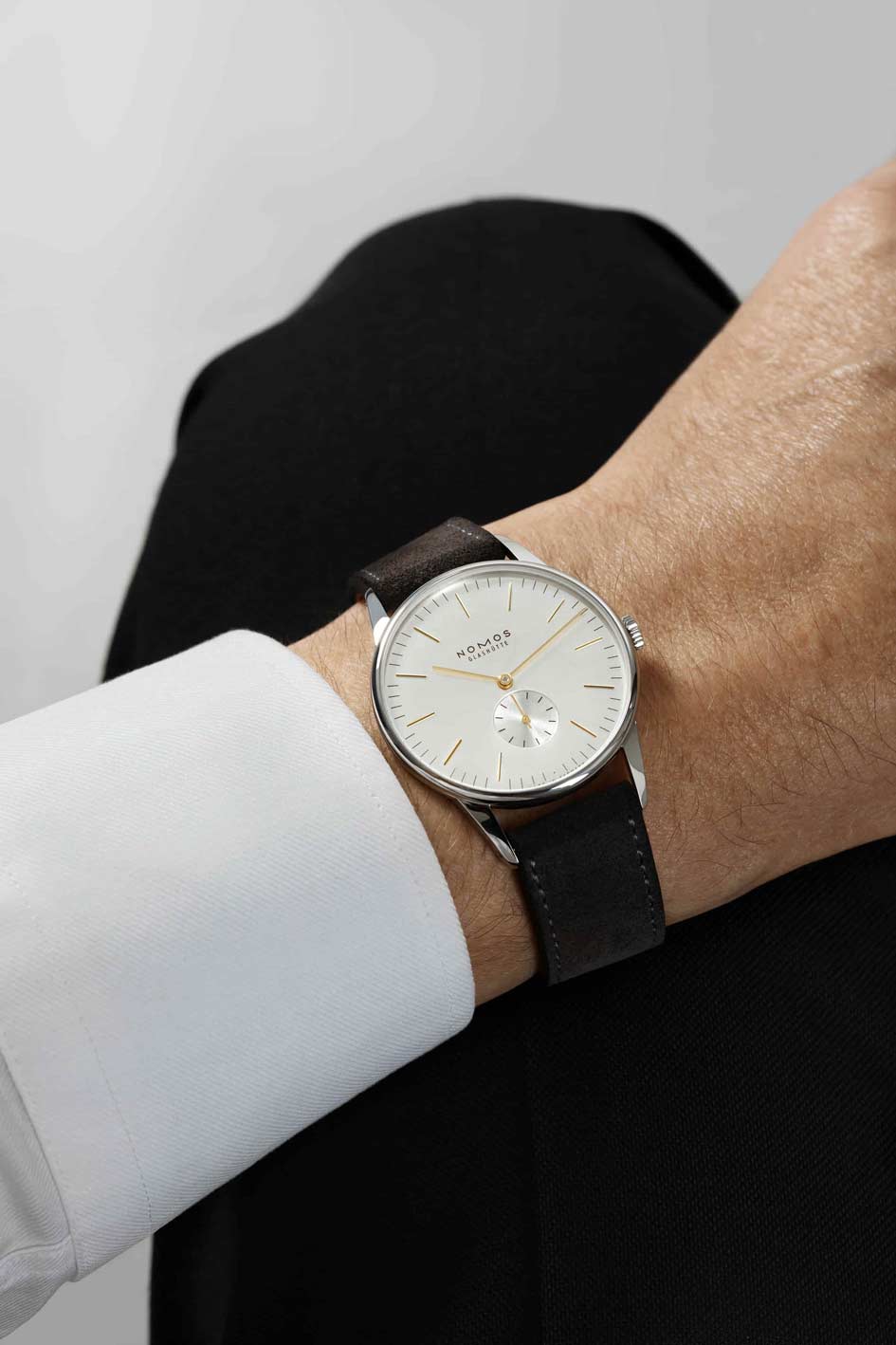 Wenn Sie dieses Modell betrachten, ist das Einzige, was Ihnen in den Sinn kommt - eine großartig aussehende, klassisch anmutende Nomos Uhr. Und Sie haben tatsächlich Recht. Die Farbkombination, die vom braunen Armband über das Edelstahlgehäuse bis hin zum Zifferblatt mit den goldenen Indexen und Zeigern reicht, vermittelt Ihnen ein lebendiges Bild vergangener Zeiten. Aber glauben Sie nicht, dass diese Nomos Orion 38 Silver es verdient, in der Schachtel zu liegen! Sie wurde geschaffen, um getragen zu werden und um an Ihnen gut auszusehen.