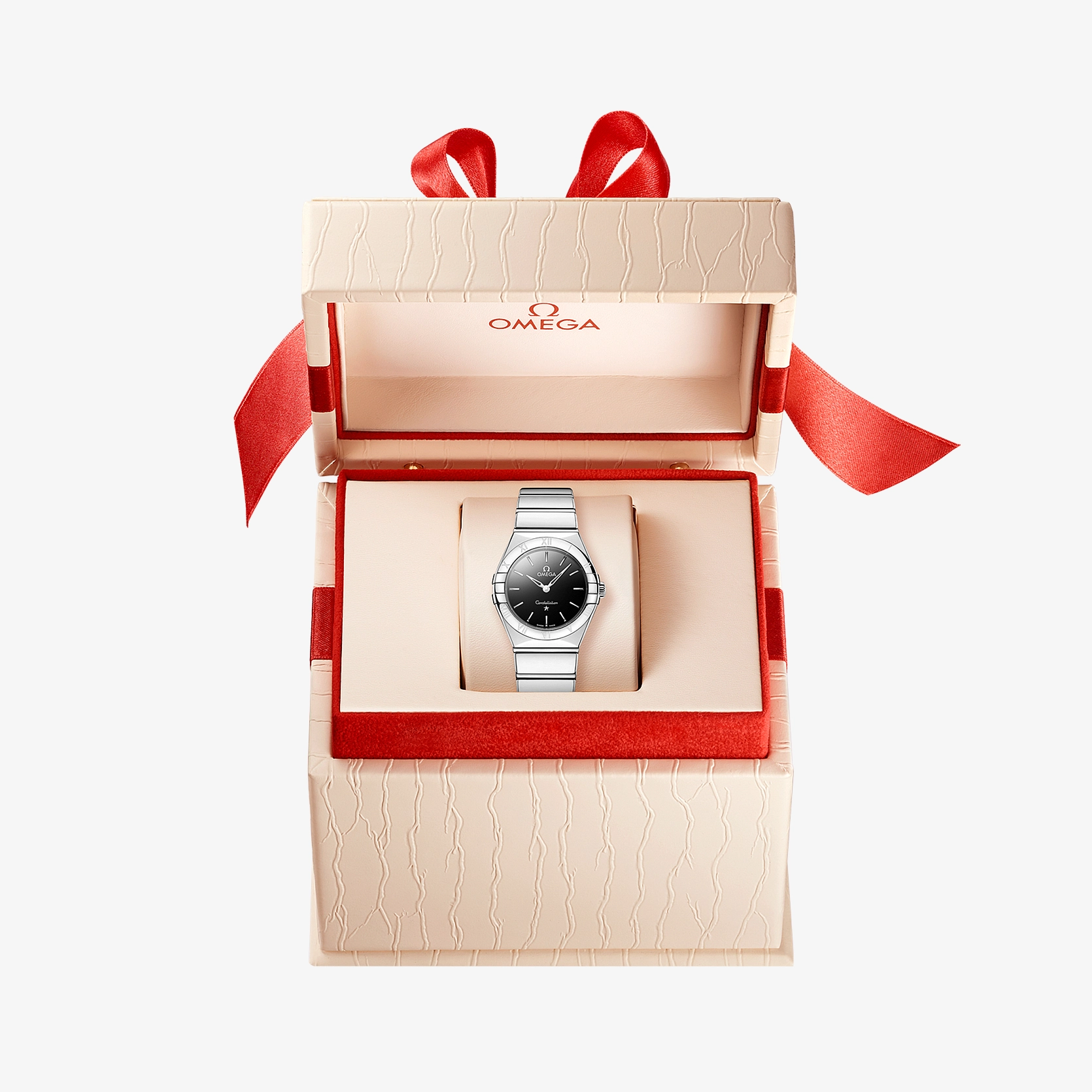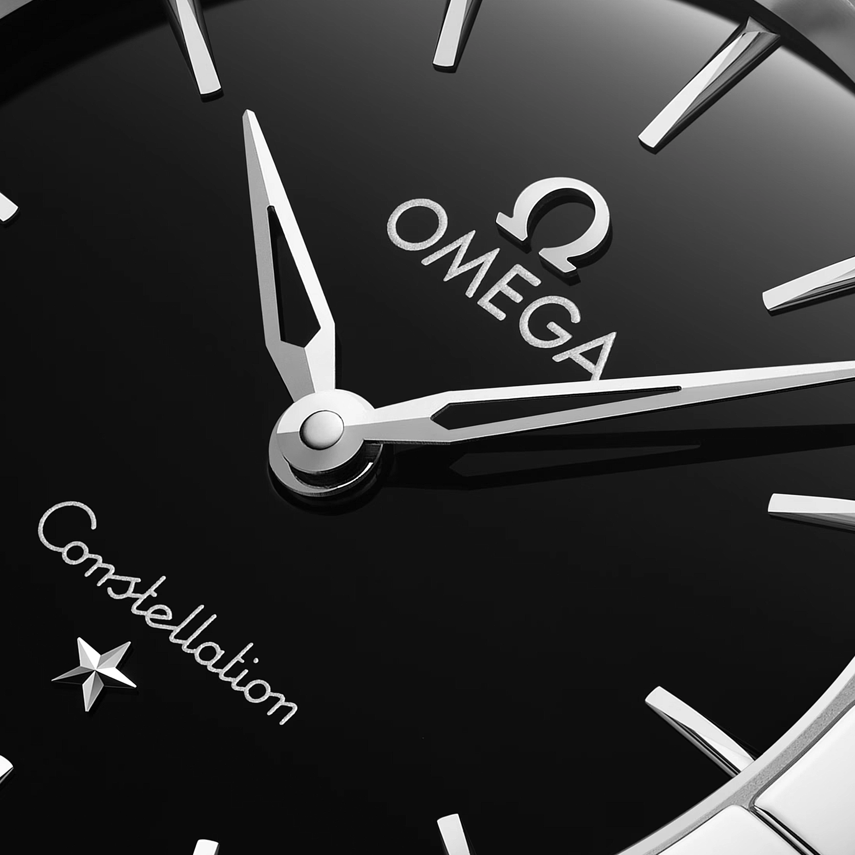 Ref. 131.10.28.60.01.001 - Die legendäre OMEGA Constellation zeichnet sich durch ihr berühmtes Gehäuse mit den Halbmondfacetten, ihre polierten Krappen an der Seite und eine sternengleiche Präzision aus. Dieses 28-mm-Modell ist aus Edelstahl gefertigt und verfügt über eine polierte Lünette mit eingravierten römischen Ziffern. Das schwarze Zifferblatt wurde mit einer Lackierung versehen. Weitere Details sind die polierten und skelettierten, aus 18 K Weißgold gefertigten Zeiger und der Stern bei sechs Uhr sowie die Stundenindizes aus poliertem 18 K Weißgold. Die Uhr wird von einem typischen polierten Monoblock-Armband mit komfortabler Verschlussanpassung am Handgelenk gehalten und von dem OMEGA Kaliber 4061 angetrieben, das sich hinter einem geprägten Constellation Observatoriumsmedaillon auf dem Gehäuseboden verbirgt.