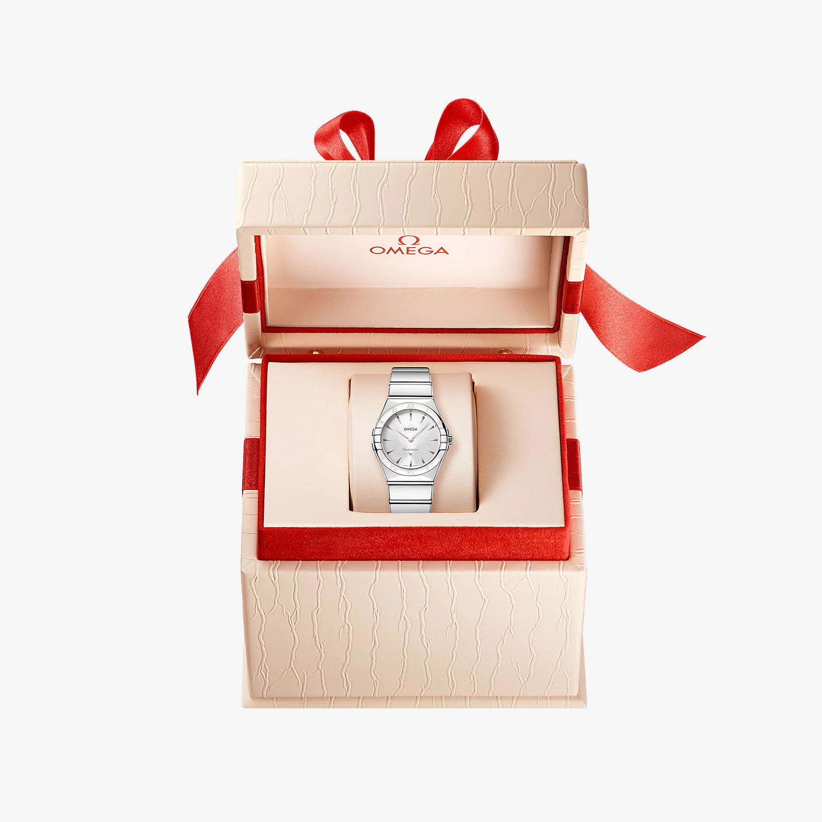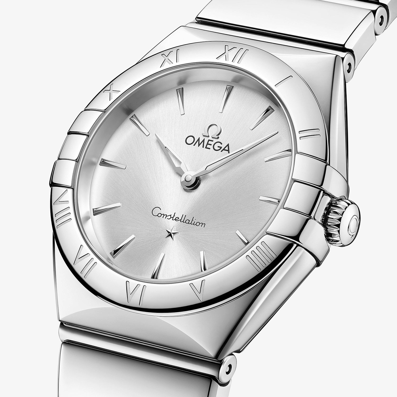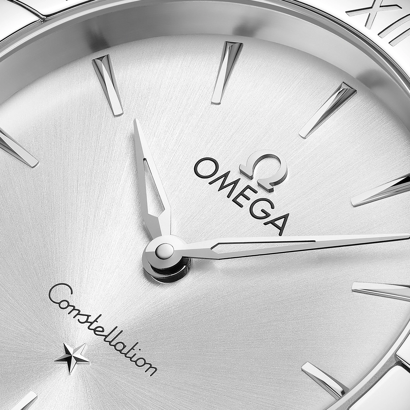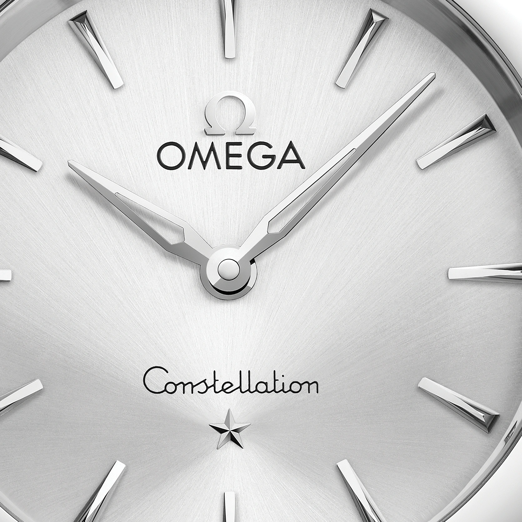 Ref. 131.10.28.60.02.002 - Die legendäre OMEGA Constellation zeichnet sich durch ihr berühmtes Gehäuse mit den Halbmondfacetten, ihre polierten Krappen an der Seite und eine sternengleiche Präzision aus. Dieses 28-mm-Modell ist aus Edelstahl gefertigt und verfügt über eine polierte Lünette mit eingravierten römischen Ziffern. Das silberfarbene Zifferblatt mit Sonnenschliff hat eine Galvanisierungs-Beschichtung. Weitere Details sind die polierten und skelettierten, aus 18 K Weißgold gefertigten Zeiger und der Stern bei sechs Uhr sowie die Stundenindizes aus poliertem 18 K Weißgold. Die Uhr wird von einem typischen polierten Monoblock-Armband mit komfortabler Verschlussanpassung am Handgelenk gehalten und von dem OMEGA Kaliber 4061 angetrieben, das sich hinter einem geprägten Constellation Observatoriumsmedaillon auf dem Gehäuseboden verbirgt.