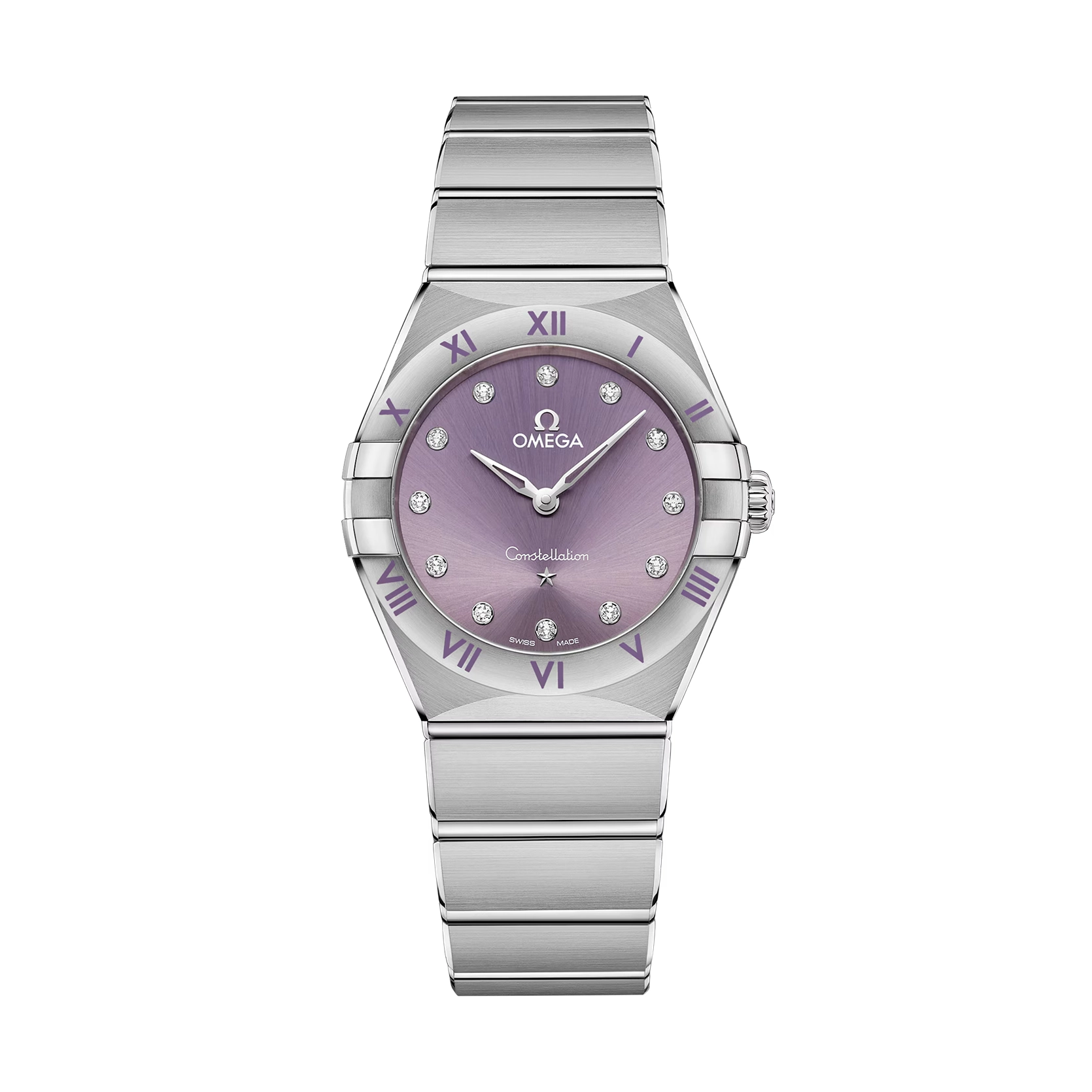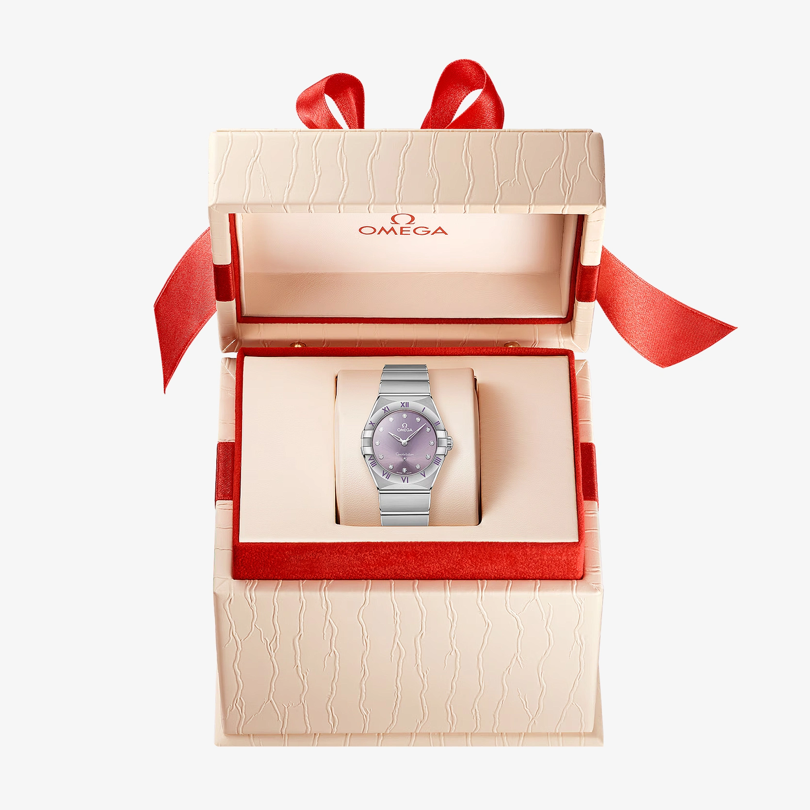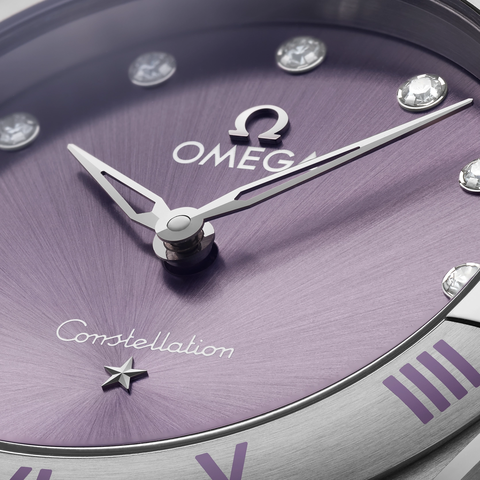Dieses 28-mm-Modell mit Gehäuse und Armband aus Edelstahl ist mit Indizes und applizierten Elementen aus 18 K Weißgold auf einem leuchtend patschulifarbenen Zifferblatt versehen. Um der Lünette einen besonderen Farbakzent zu verleihen, hat OMEGA die eingravierten römischen Ziffern mit der gleichen Pastellfarbe hervorgehoben. Das Herzstück dieses Zeitmessers bildet das OMEGA Kaliber 4061. Wendet man die Uhr, so kommt das in den Gehäuseboden geprägte Constellation Observatoriumsmedaillon zum Vorschein.
