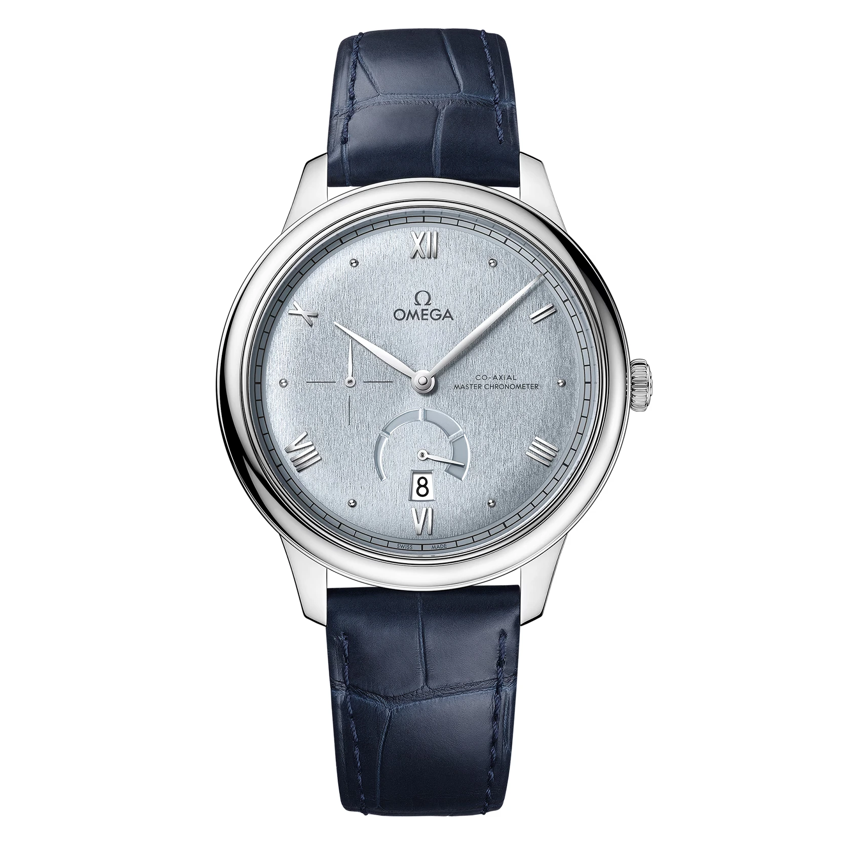 Dieses 41-mm-Modell aus Edelstahl besitzt ein gewölbtes Zifferblatt mit hellblauer PVD-Beschichtung, Sonnenschliff und einer variierenden vertikalen Prägung. Die Anzeige zeichnet sich durch rhodinierte Zeiger sowie alternierende römische Ziffern und Cabochon-Indizes aus. Die 270°-Gangreserveanzeige befindet sich bei 6 Uhr. Sie wird durch vier sektorielle Ausschnitte in Halbmondform und eine applizierte Unterplatte mit dezent kontrastierender Veredelung im gleichen Farbton dargestellt. Der schlichte Look des Zeitmessers wird durch ein Datumsfenster bei 6 Uhr, ein Hilfszifferblatt für die Sekunden bei 9 Uhr und eine äußere „Eisenbahn“-Minuterie ergänzt. Diese als Master Chronometer zertifizierte Uhr wird von einem dunkelblauen Lederarmband am Handgelenk gehalten und von dem OMEGA Master Co-Axial Kaliber 8810 angetrieben, das durch den kratzfesten Saphirglasboden bewundert werden kann.