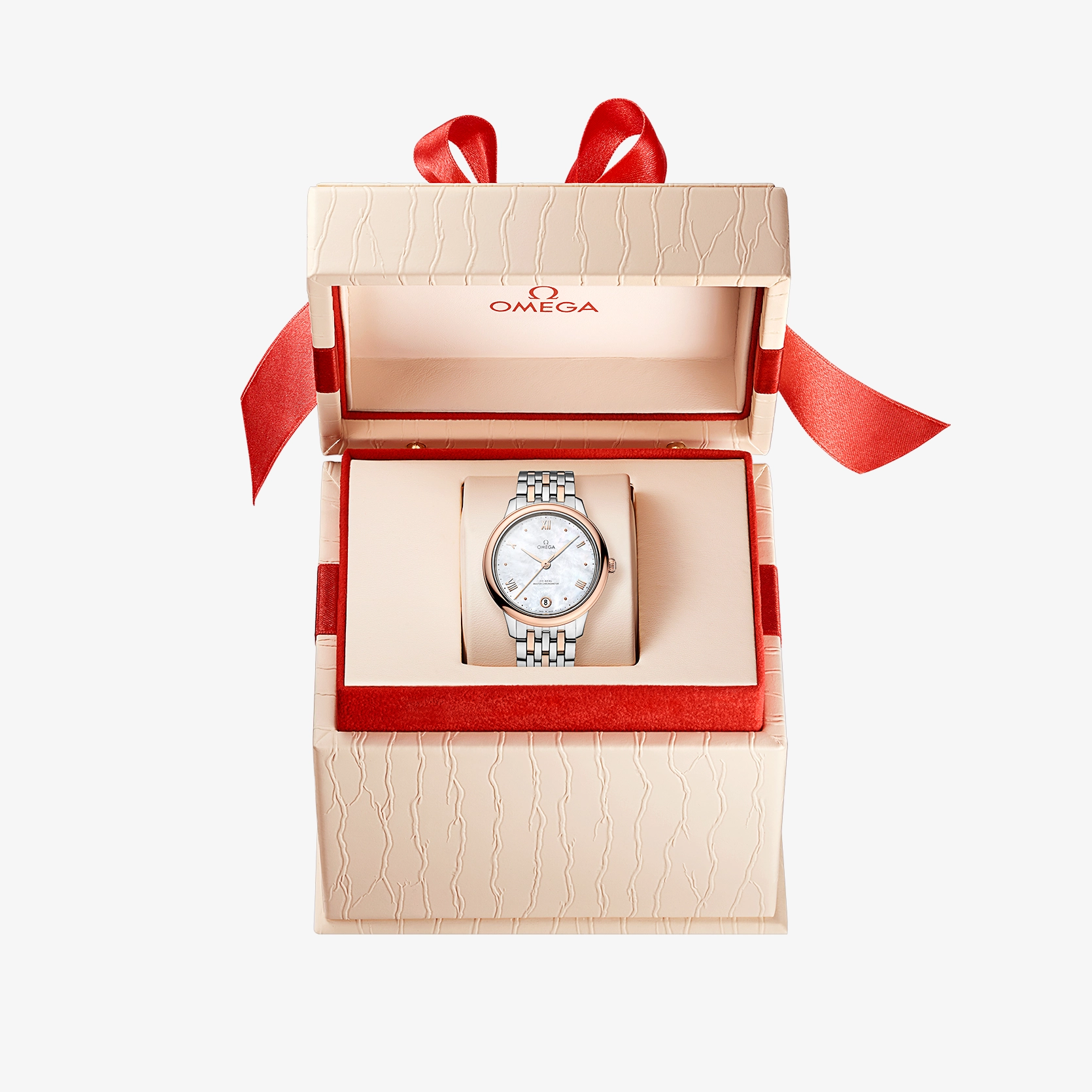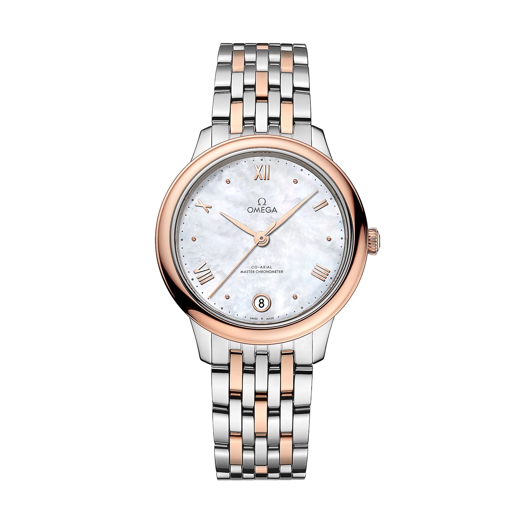 Ref. 434.20.34.20.05.001 - Die OMEGA De Ville Prestige ist seit 1994 eine zeitlose Kollektion. Jetzt erscheint die dritte Generation der Ikone. Mit einer Auswahl an Mustern, Veredelungen und Farben repräsentieren diese Zeitmesser klassisches Design sowie Eleganz und passen sich verschiedensten Lifestyles und Persönlichkeiten an. Dieses 34-mm-Modell aus Edelstahl und 18 K Sedna™-Gold besitzt ein Zifferblatt aus weißem Perlmutt. Die Anzeige zeichnet sich durch Zeiger mit PVD-Beschichtung aus Sedna™-Gold sowie alternierende römische Ziffern und Cabochon-Indizes aus. Der schlichte Look des Zeitmessers wird durch ein Datumsfenster bei 6 Uhr und einen gepunkteten äußeren Minutenring ergänzt. Diese als Master Chronometer zertifizierte Uhr wird von einem Armband aus Edelstahl und Sedna™-Gold am Handgelenk gehalten und von dem OMEGA Master Co-Axial Kaliber 8800 angetrieben, das durch den kratzfesten Saphirglasboden bewundert werden kann.