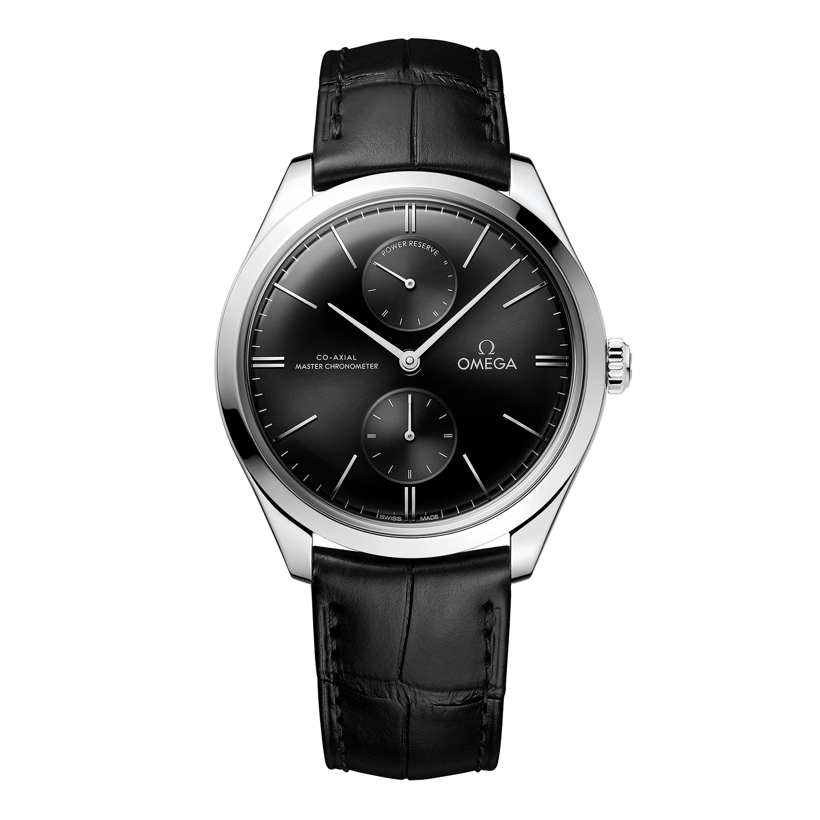 Dieses Modell besitzt ein poliertes 40-mm-Gehäuse aus Edelstahl, das von einem schwarzen Lederarmband am Handgelenk gehalten wird. Das gewölbte schwarze Zifferblatt ist mit einer Gangreserveanzeige bei 12 Uhr, einer kleinen Sekunde bei 6 Uhr sowie Zeigern und gewölbten Indizes aus 18 K Weißgold versehen. Angetrieben wird diese De Ville Trésor von dem OMEGA Master Co-Axial Kaliber 8934. Sie garantiert in Sachen Präzision, chronometrischer Leistung und magnetischer Widerstandskraft den höchsten Standard, den die Industrie zu bieten hat.