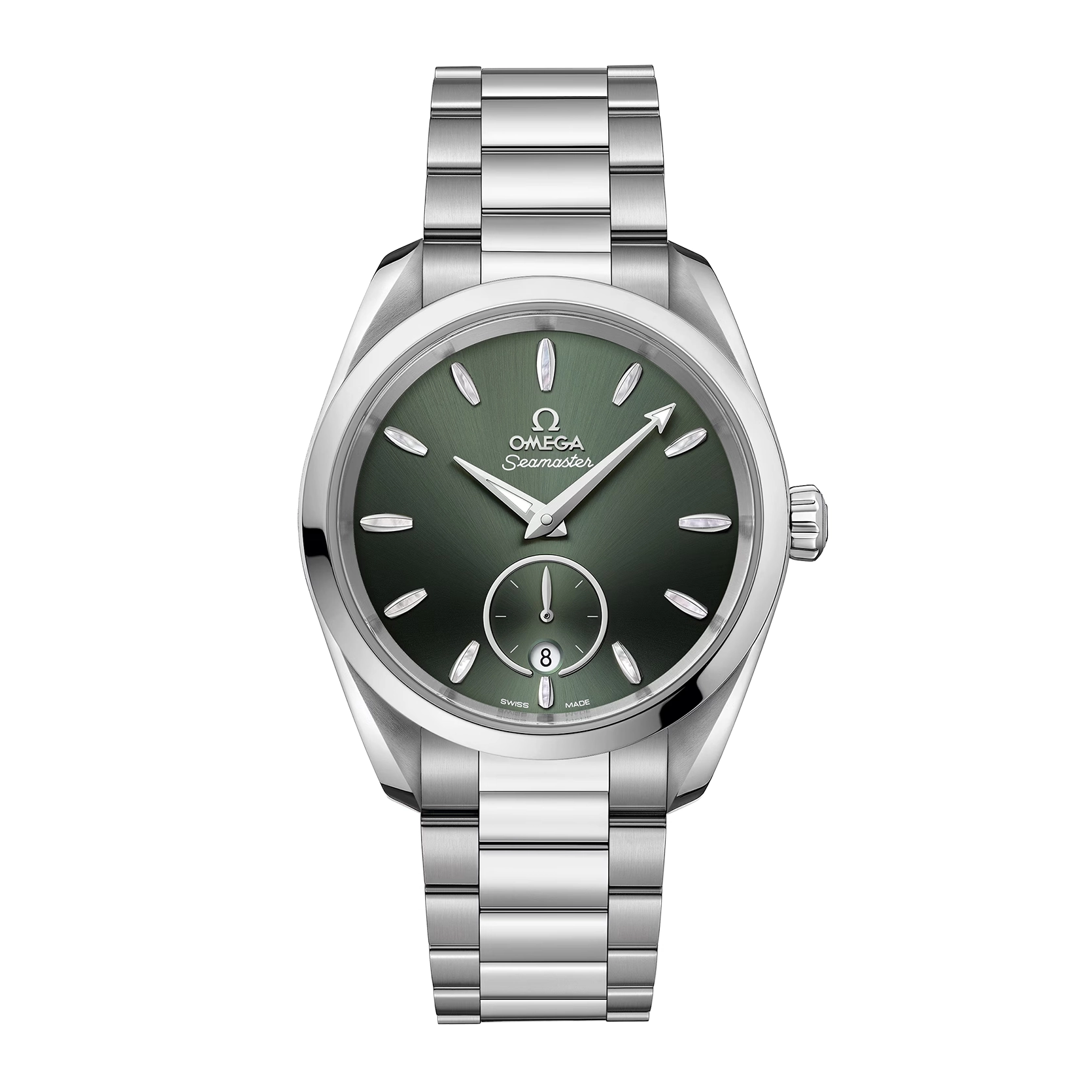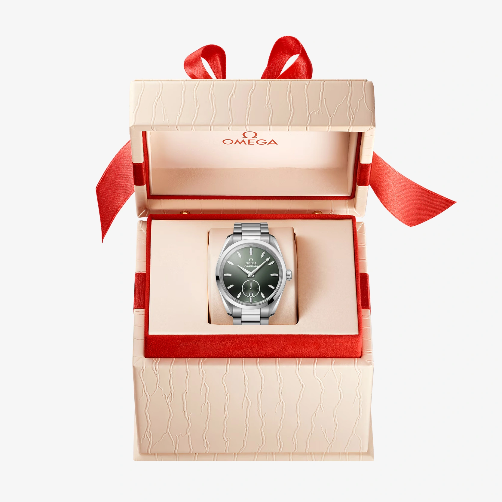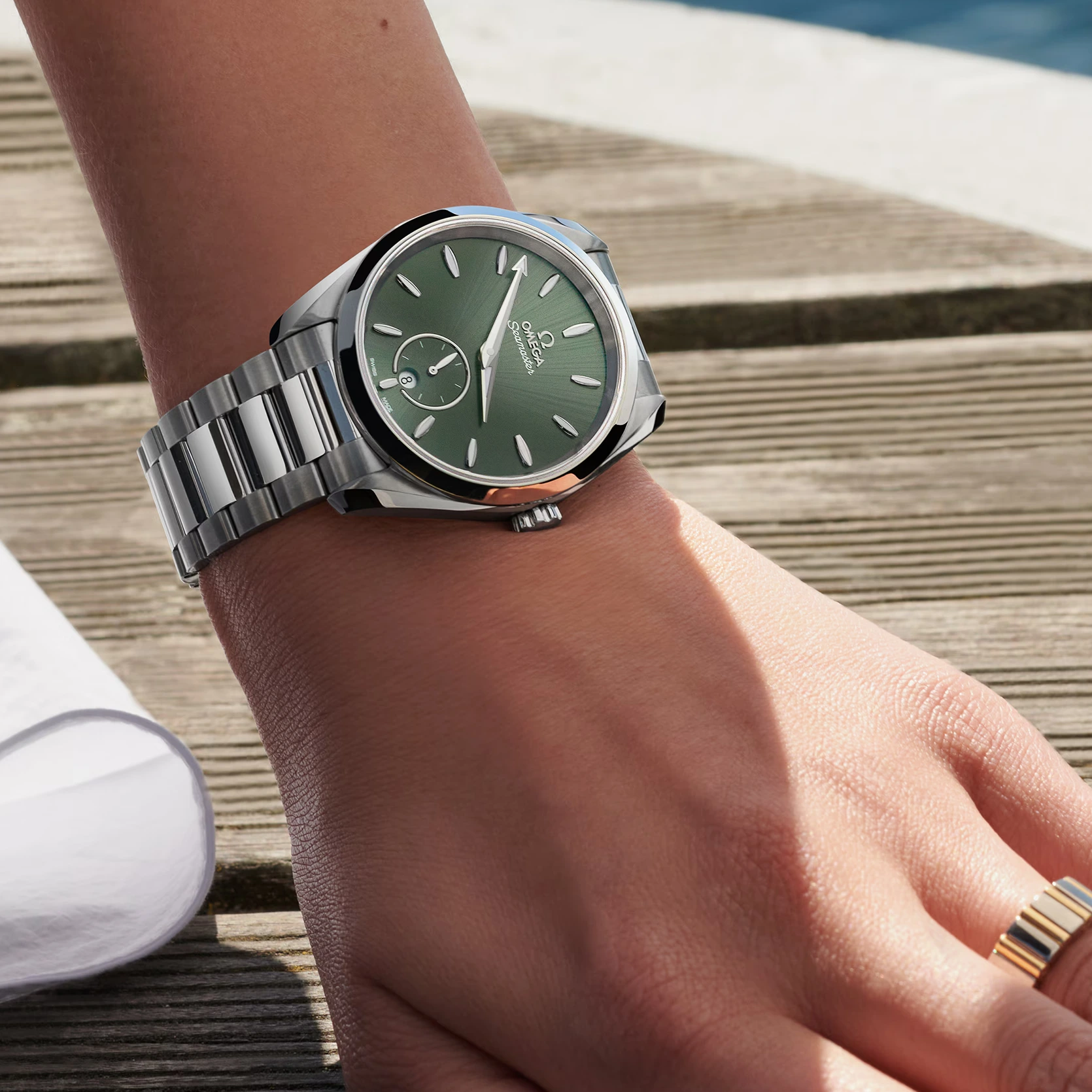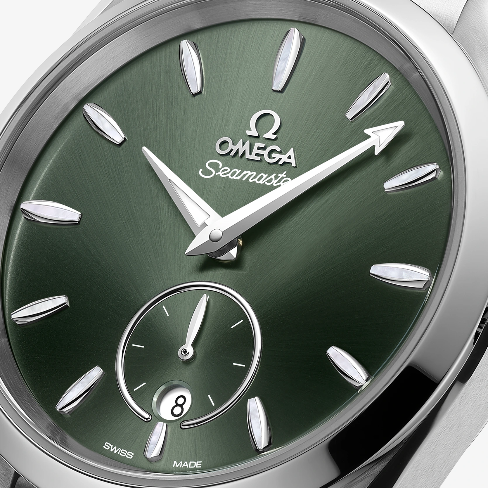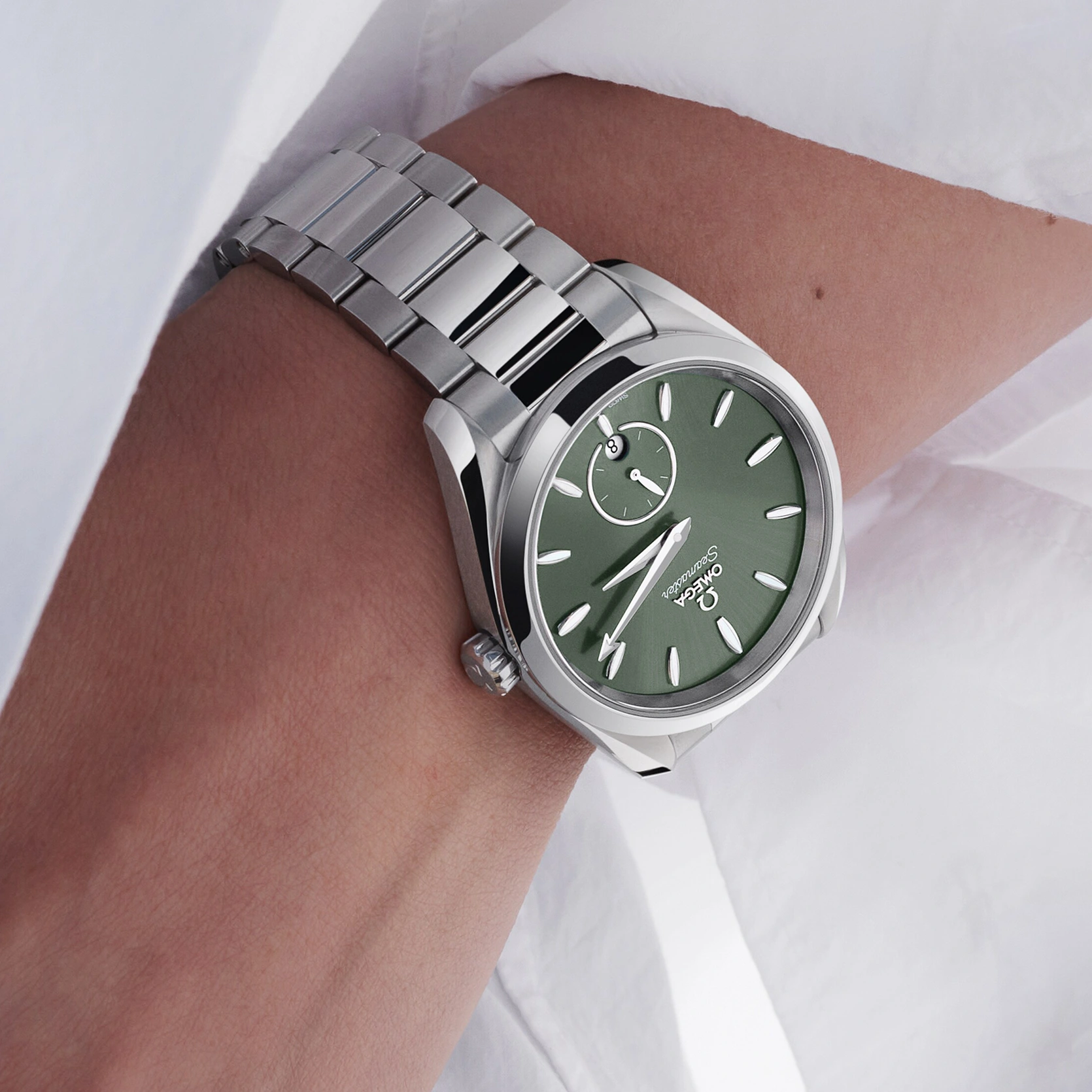 Das dunkelgrüne Zifferblatt mit Sonnenschliff zeichnet sich durch ein Datumsfenster bei 6 Uhr sowie ein Hilfszifferblatt für die kleine Sekunde aus, das von einem Ring aus 18 K Weißgold umrahmt ist. Darüber hinaus wird das Design durch rhodinierte Zeiger ergänzt, die mit weißer Super-LumiNova gefüllt sind, sowie durch Indizes aus 18 K Weißgold in Form von Segelbootrümpfen mit schimmernden Perlmuttintarsien. Der Zeitmesser wird von einem polierten und gebürsteten Armband am Handgelenk gehalten und von dem OMEGA Co-Axial Master Chronometer Kaliber 8802 angetrieben, das vom Eidgenössischen Institut für Metrologie (METAS) zertifiziert wurde und höchsten Branchenstandards entspricht.