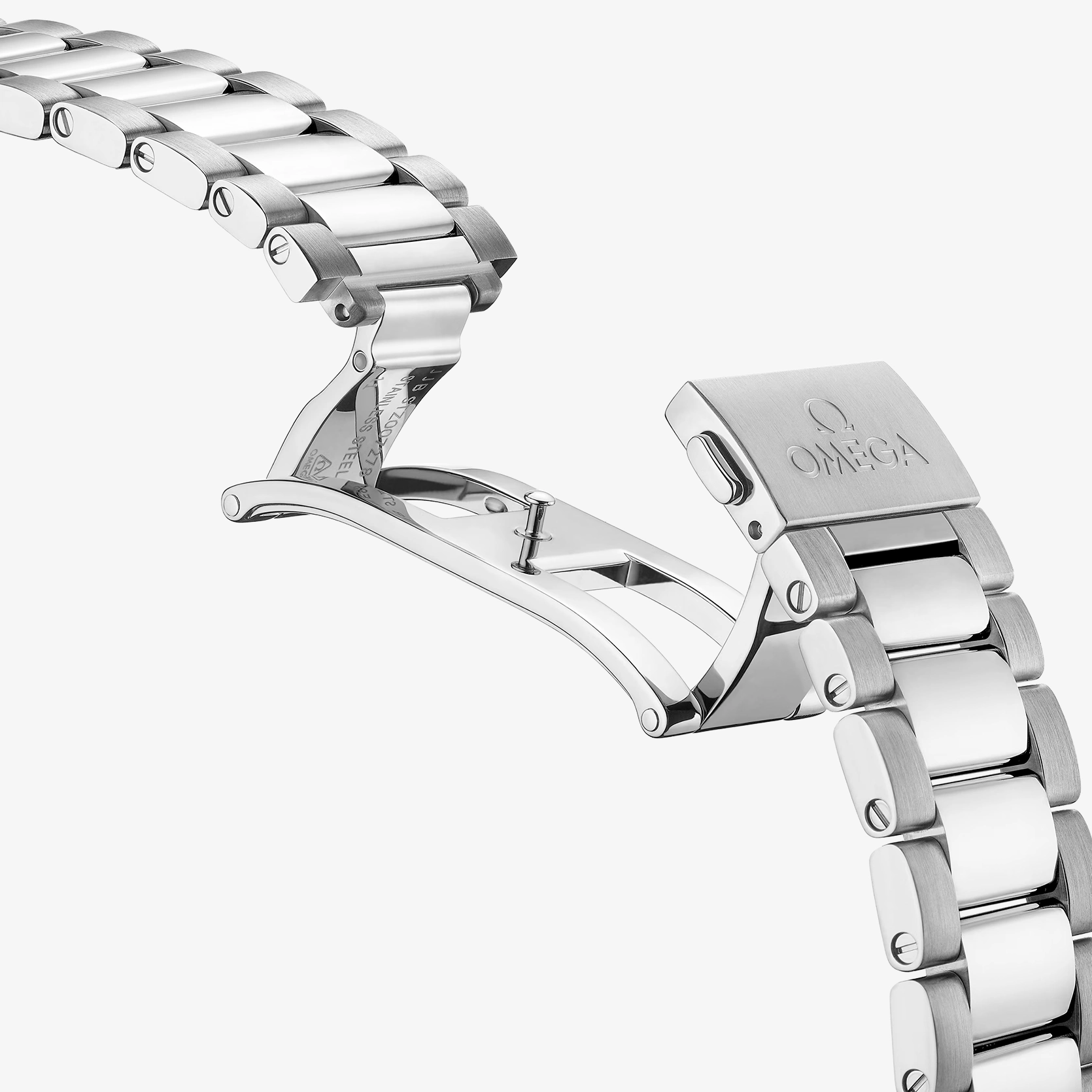 Das schwarze Zifferblatt zeichnet sich durch ein horizontales „Teak“-Dekor aus, das sich an den hölzernen Deckplanken von Luxus-Segeljachten inspiriert. Das Zifferblatt verfügt außerdem über ein Datumsfenster bei 6 Uhr und die rhodinierten Zeiger und Indizes sind mit weißer Super-LumiNova gefüllt. Der Zeitmesser wird von einem polierten und gebürsteten Armband am Handgelenk gehalten und von dem OMEGA Master Chronometer Kaliber 8900 angetrieben, das vom Eidgenössischen Institut für Metrologie (METAS) zertifiziert wurde und höchsten Branchenstandards entspricht.