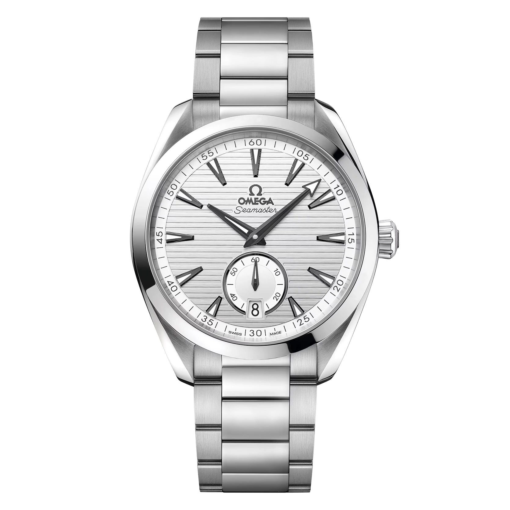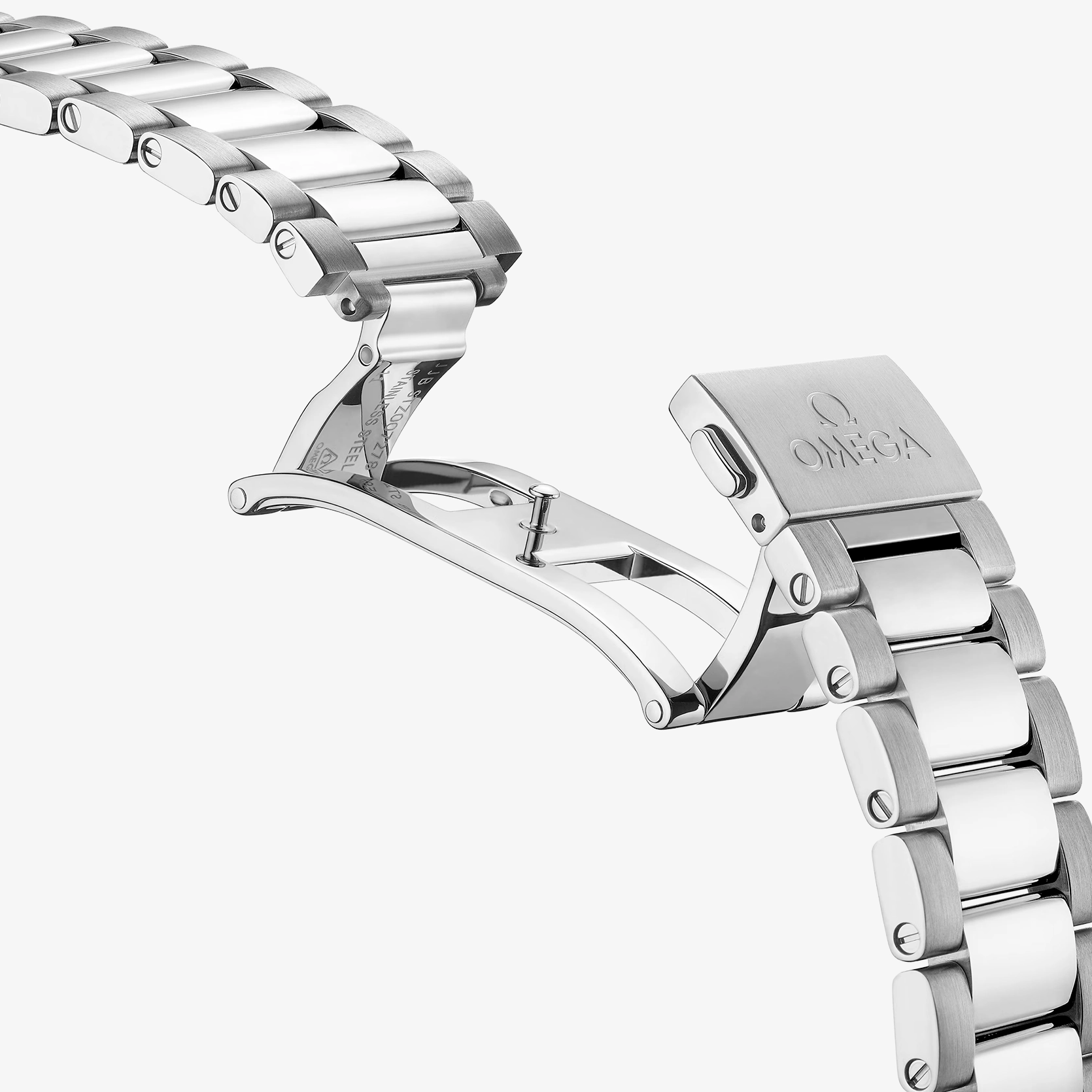 Das silberne, gebürstete Zifferblatt zeichnet sich durch ein horizontales „Teak“-Muster aus und besitzt ein Datumsfenster bei 6 Uhr sowie ein opalisierendes Hilfszifferblatt für die kleine Sekunde, das von einem geschwärzten Ring umrahmt ist. Darüber hinaus wird das Design durch geschwärzte Zeiger und Indizes ergänzt, die mit weißer Super-LumiNova gefüllt sind, sowie durch sandgestrahlte Ringe für die Minuten und Sekunden auf dem Zifferblatt und dem Hilfszifferblatt. Der Zeitmesser wird von einem polierten und gebürsteten Armband am Handgelenk gehalten und von dem OMEGA Co-Axial Master Chronometer Kaliber 8916 angetrieben, das vom Eidgenössischen Institut für Metrologie (METAS) zertifiziert wurde und höchsten Branchenstandards entspricht.