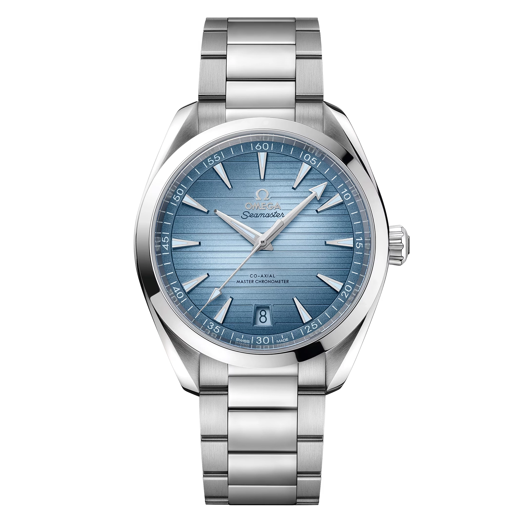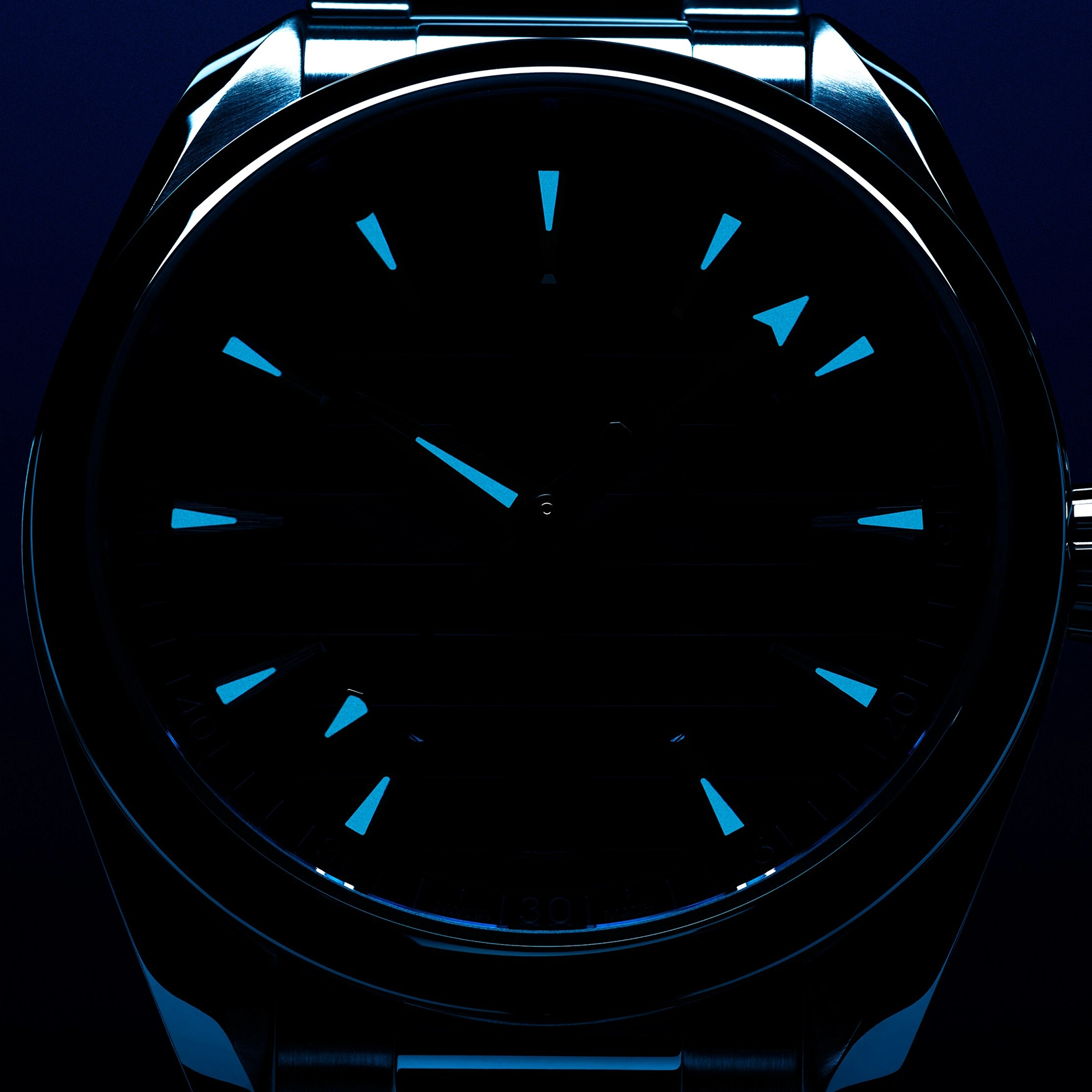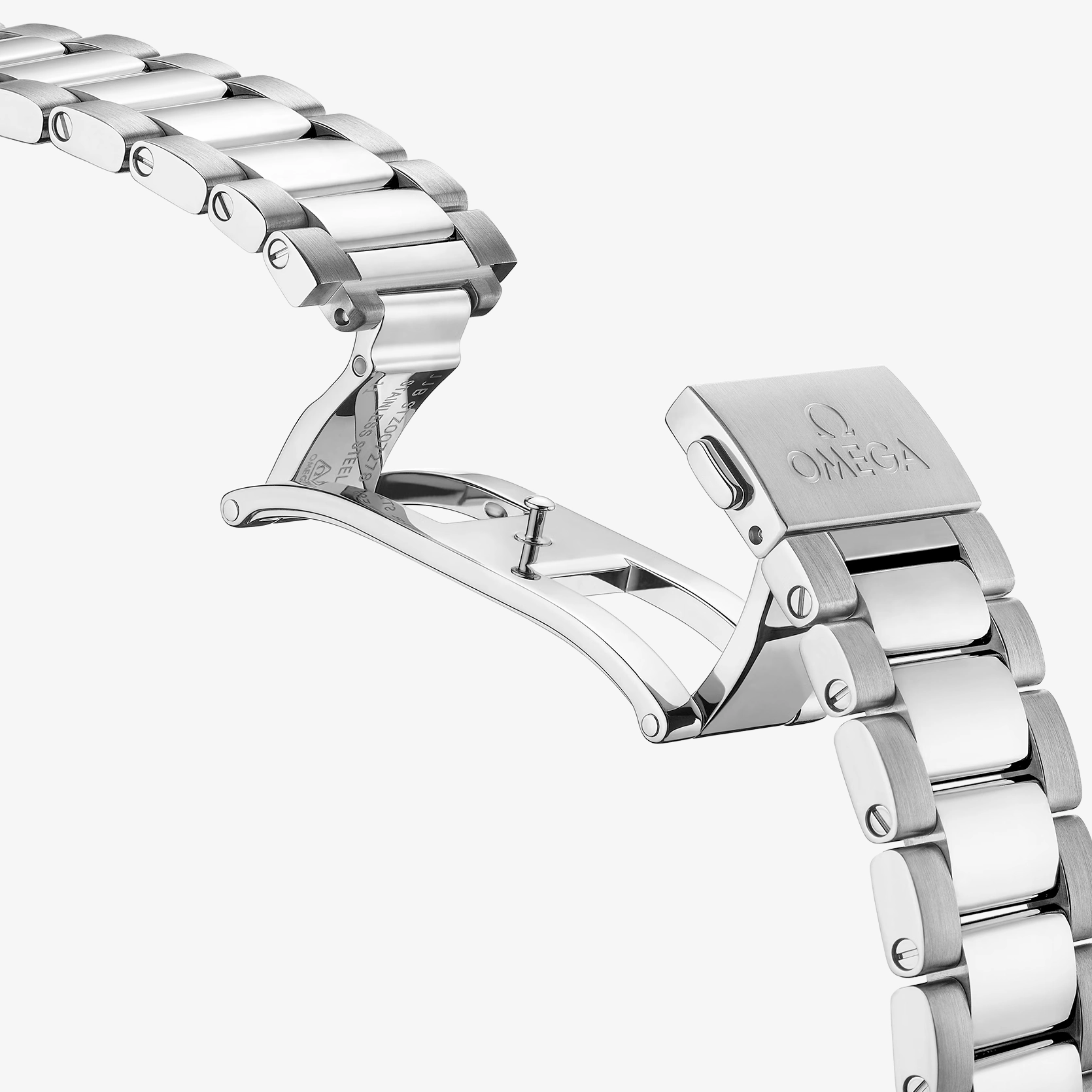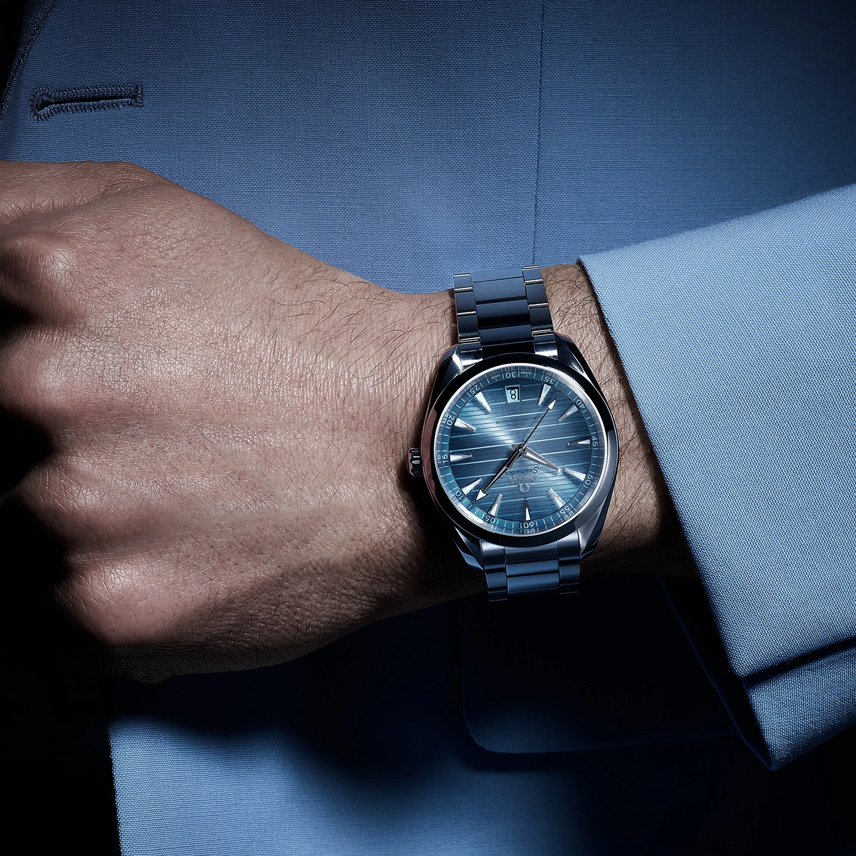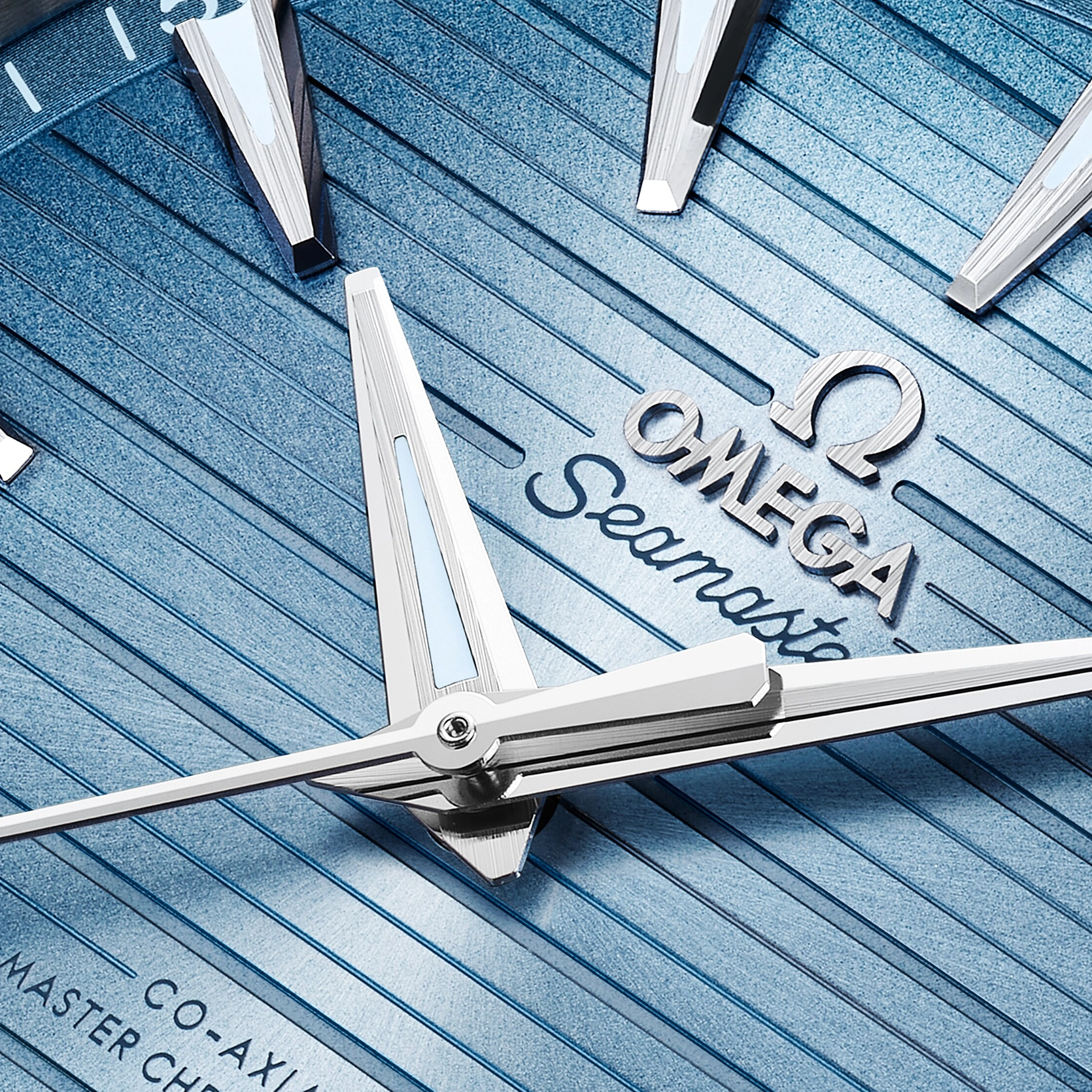 Das Zifferblatt mit „Teak“-Muster in OMEGAs eigenem Summer Blue verfügt über einen Sonnenschliff, eine PVD-Beschichtung und einen lackierten Farbverlauf, der die Wasserdichtigkeit der Uhr symbolisiert. Es besticht durch rhodinierte Zeiger, mit einzigartiger hellblauer Super-LumiNova gefüllte Indizes sowie eine blaue Datumsanzeige bei 6 Uhr. Auf der Rückseite der Uhr ist ein geprägtes Seamaster Gedenklogo zu sehen, das einen Poseidon mit Dreizack und zwei Seepferdchen zeigt: OMEGAs ursprüngliches Design von 1956 und aktuelles Markenemblem. Dahinter befindet sich OMEGAs Co-Axial Master Chronometer Kaliber 8900, das vom Eidgenössischen Institut für Metrologie (METAS) gemäß den höchsten Normen der Branche zertifiziert wurde.