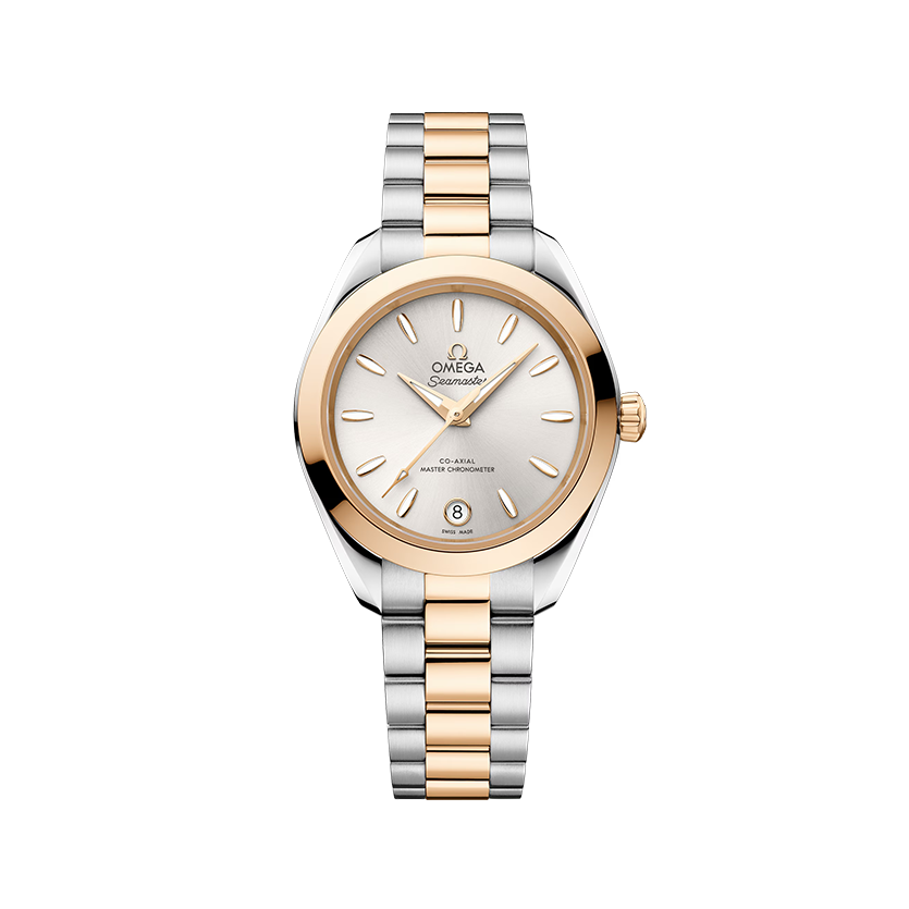 Ref. 220.20.30.20.02.001 - Die Seamaster Aqua Terra ist eine Hommage an OMEGAs großes maritimes Erbe. Seine zarten Proportionen hat das schlanke 30-mm-Gehäuse dieser Uhr dem innovativen OMEGA Co-Axial Master Chronometer Kaliber 8750 zu verdanken, das vom Eidgenössischen Institut für Metrologie (METAS) nach den höchsten Standards der Branche zertifiziert wurde. Das Modell besitzt ein symmetrisches, poliertes Gehäuse aus Edelstahl und 18 K Moonshine™-Gold und einen verschraubten Gehäuseboden mit Wellendekor. Das silberne Zifferblatt wurde mit einem Sonnenschliff und Lack versehen und weist ein kreisförmiges Datumsfenster bei 6 Uhr auf. Hervorgehoben wird es von elf bootsrumpfförmigen Indizes und überarbeiteten, facettierten Zeigern, wobei der Minutenzeiger in einer zarten Spitze endet. Alle applizierten Elemente wurden aus 18 K Moonshine™-Gold gefertigt, während die Zeiger aus 18 K Gelbgold mit PVD-Beschichtung aus Moonshine™-Gold bestehen. Indizes und Zeiger wurden außerdem mit weißer, im Dunkeln blau leuchtender Super-LumiNova gefüllt. Am Handgelenk gehalten wird die Uhr von einem integrierten Armband aus Edelstahl und 18 K Moonshine™-Gold mit schön abgerundeten, polierten und gebürsteten Gliedern, einer Doppelfaltschließe und dem einfachen Komfortverschluss von OMEGA.