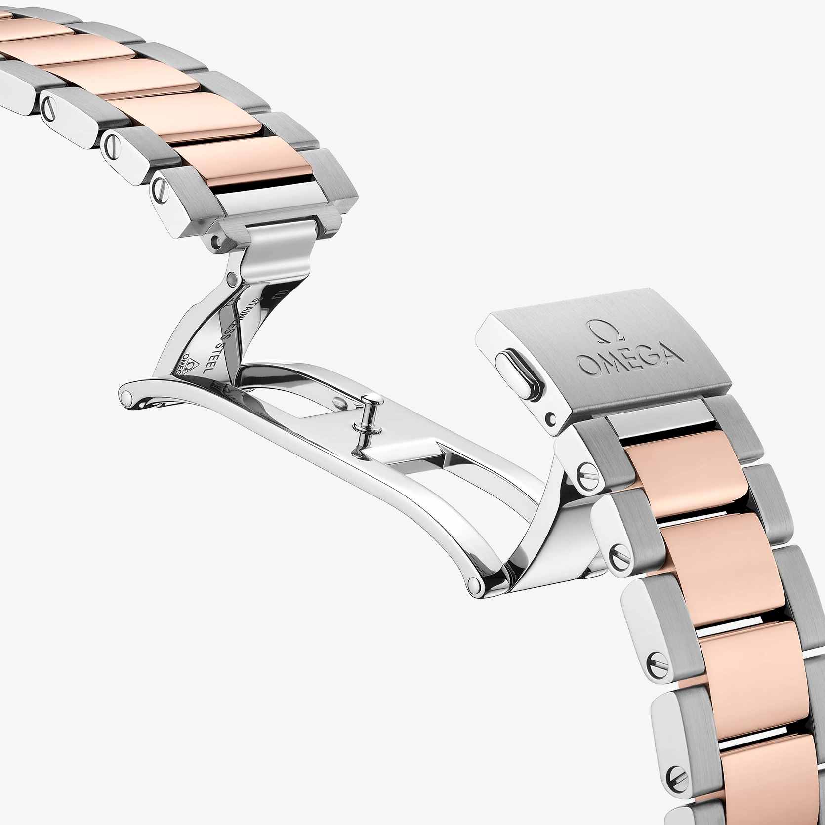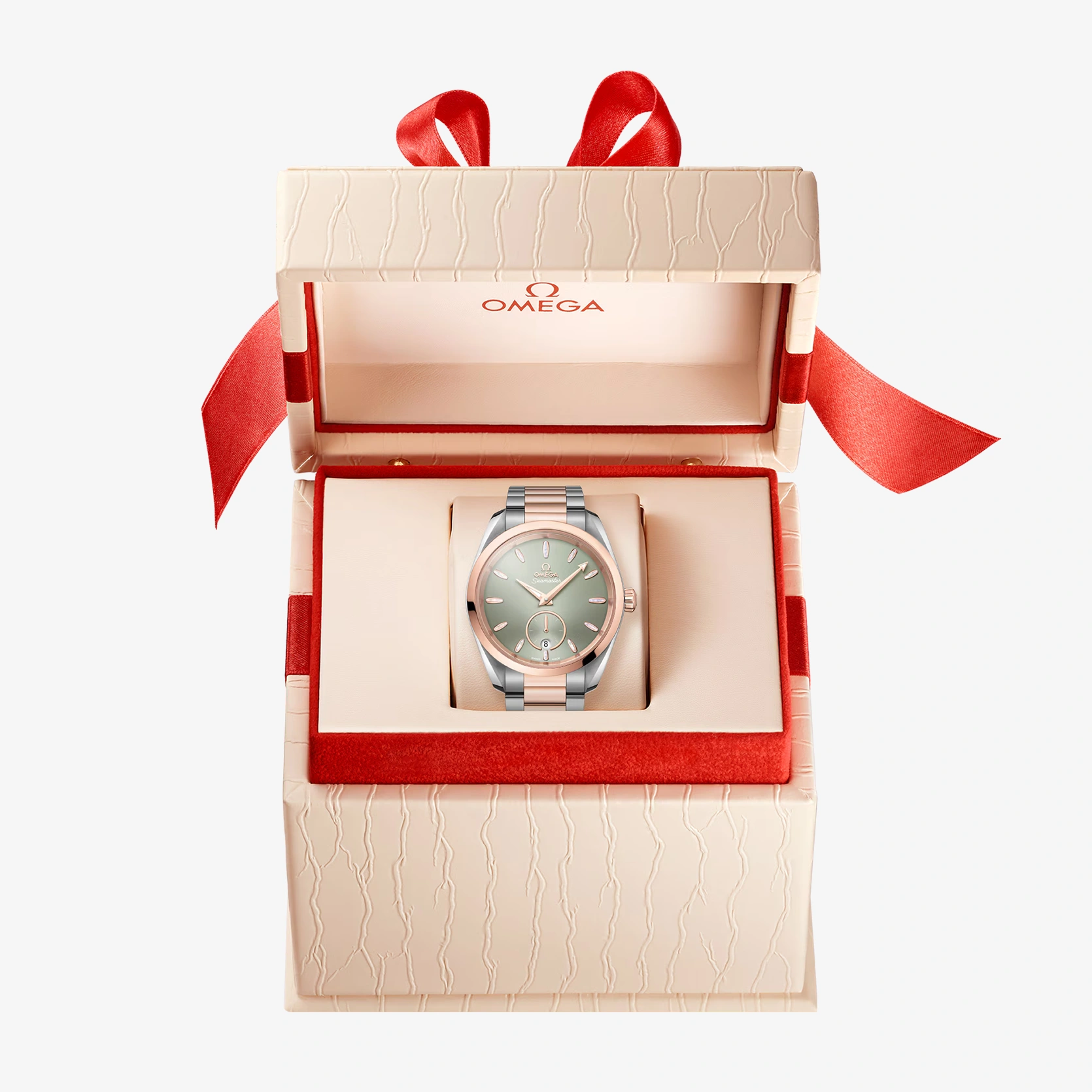 Das hellgrüne Zifferblatt mit Sonnenschliff zeichnet sich durch ein Datumsfenster bei 6 Uhr sowie ein Hilfszifferblatt für die kleine Sekunde aus, das von einem Ring aus 18 K Sedna™-Gold umrahmt ist. Darüber hinaus wird das Design durch Zeiger aus 18 K Sedna™-Gold ergänzt, die mit weißer Super-LumiNova gefüllt sind, sowie durch Indizes in Form von Segelbootrümpfen mit schimmernden Perlmuttintarsien. Der Zeitmesser wird von einem polierten und gebürsteten Armband am Handgelenk gehalten und von dem OMEGA Co-Axial Master Chronometer Kaliber 8802 angetrieben, das vom Eidgenössischen Institut für Metrologie (METAS) zertifiziert wurde und höchsten Branchenstandards entspricht.