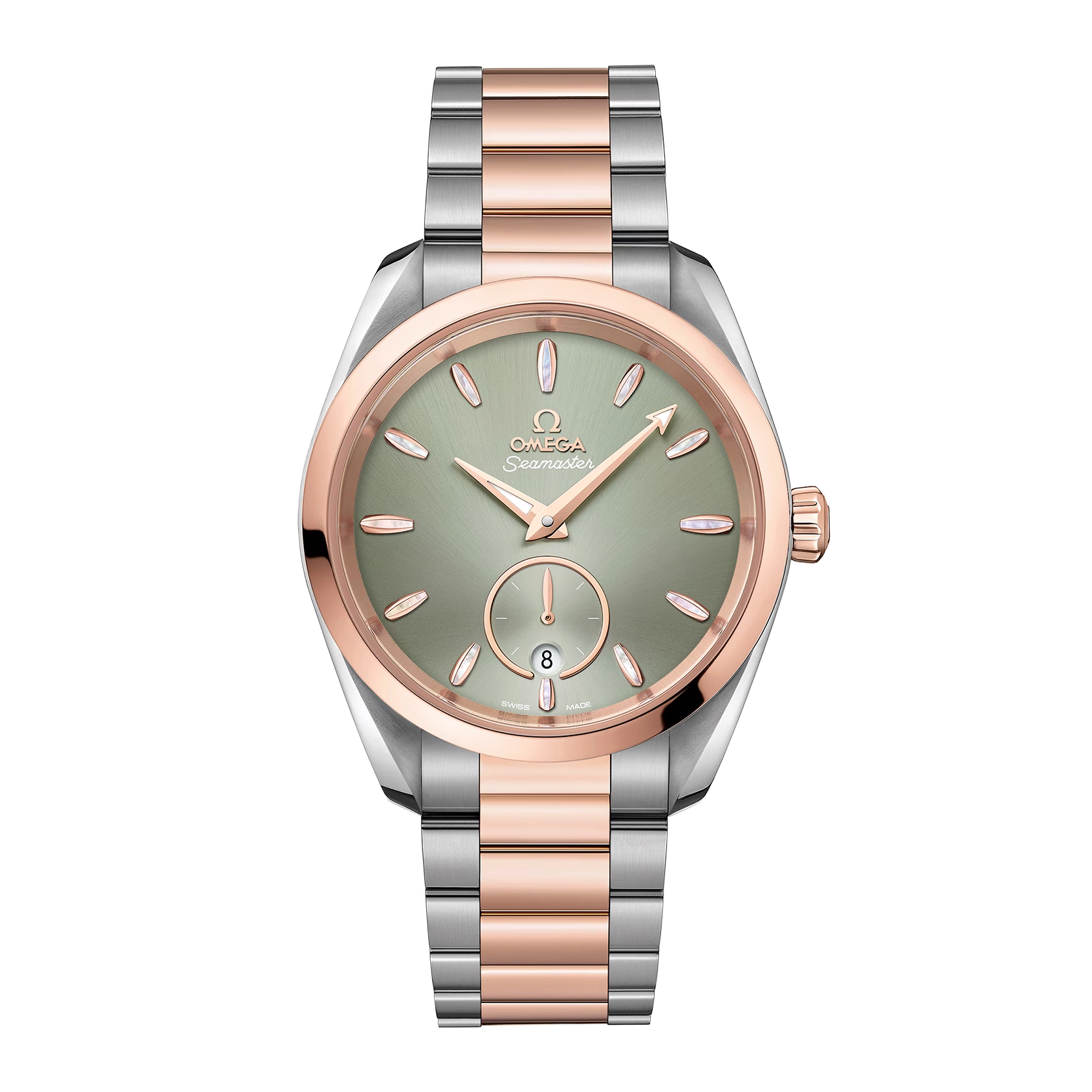 Ref. 220.20.38.20.10.001 - Die Seamaster Aqua Terra ist eine Hommage an OMEGAs großes maritimes Erbe. Das symmetrische Gehäuse dieses 38-mm-Modells besteht aus 18 K Sedna™-Gold und Edelstahl und ist auf dem Gehäuseboden mit einem Wellendekor versehen.