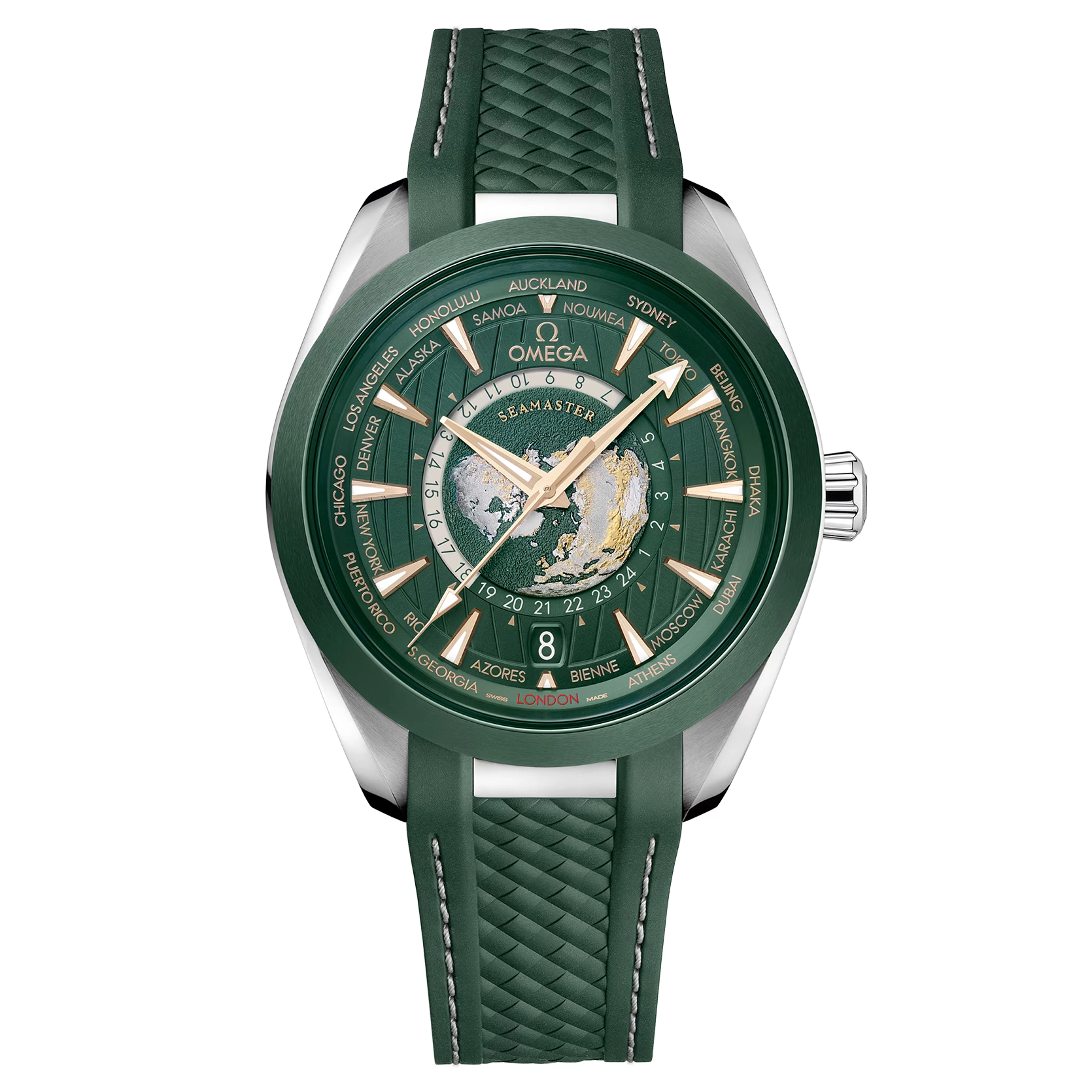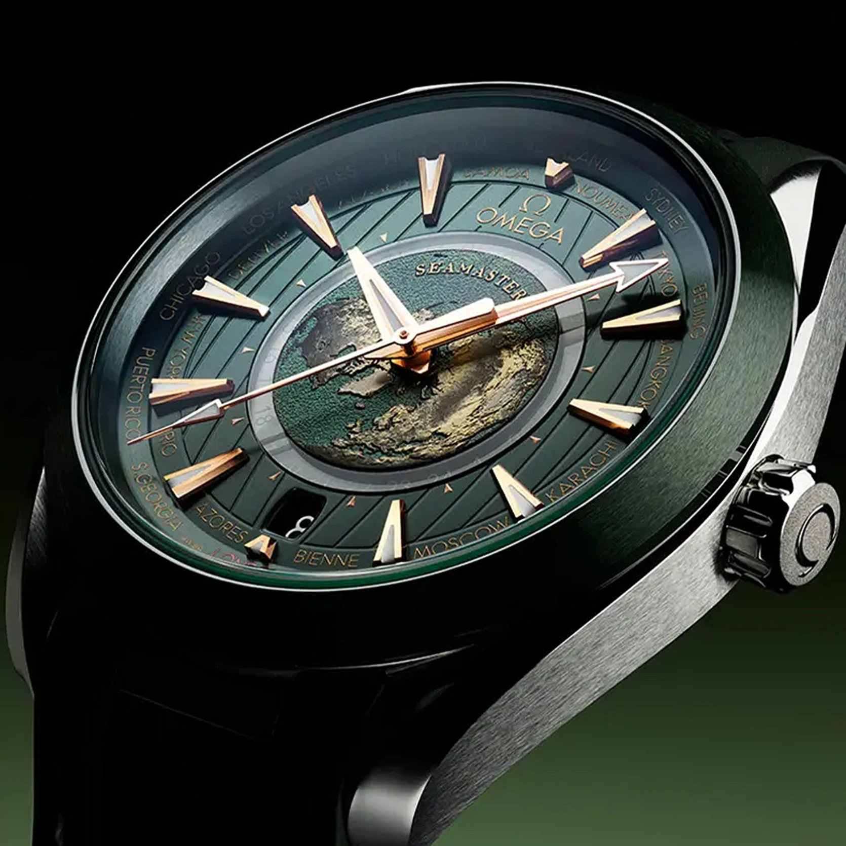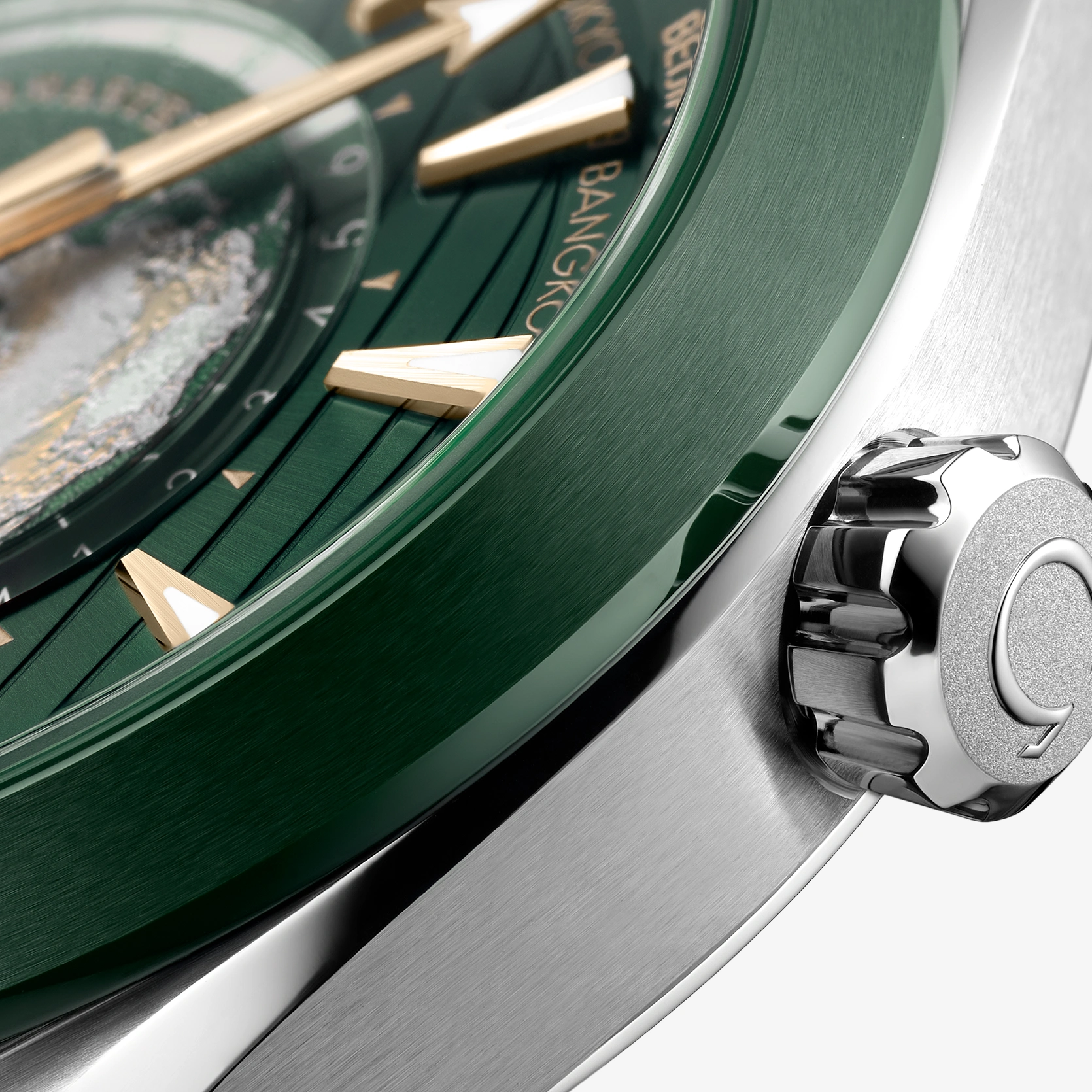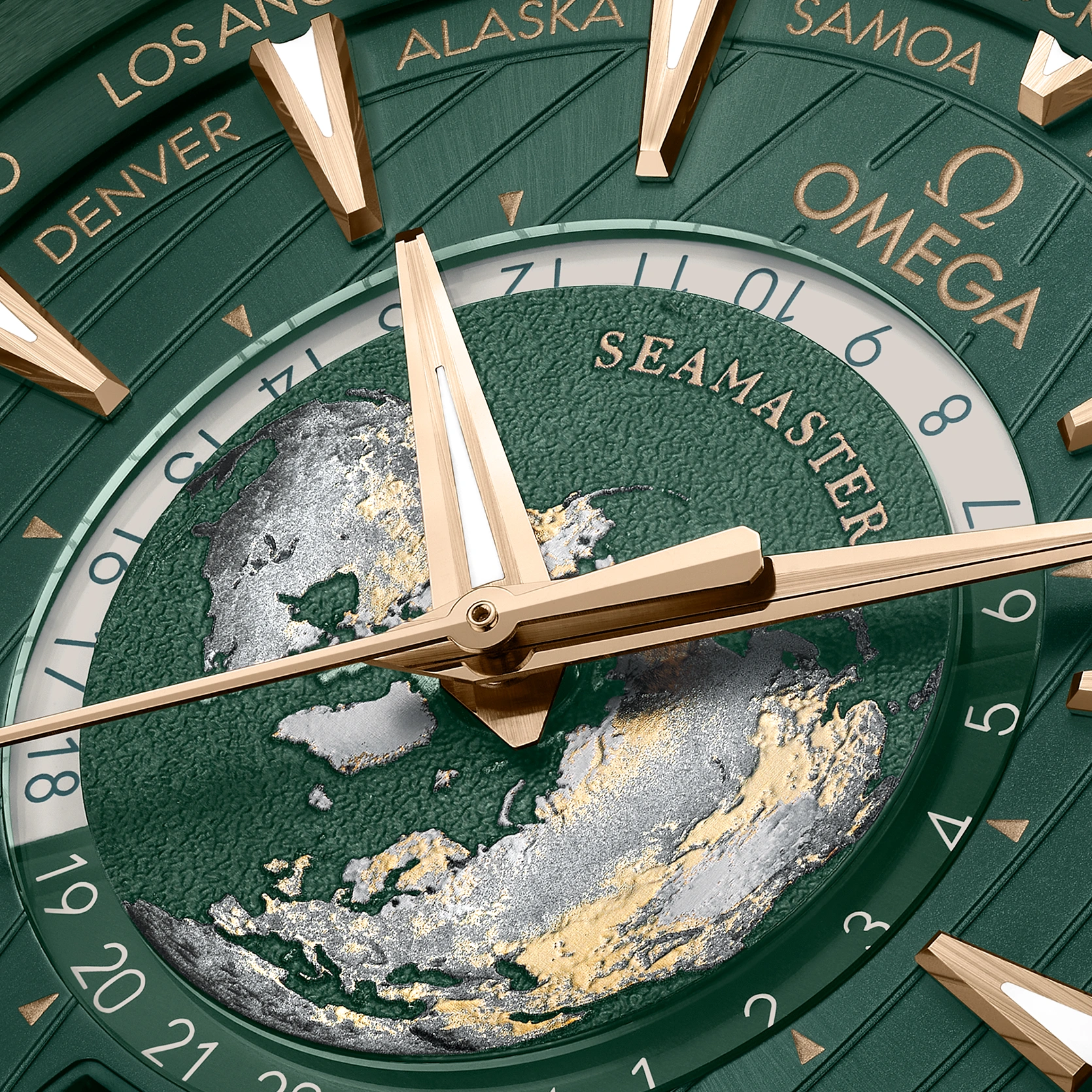 In der Mitte des grünen Zifferblatts mit Sonnenschliff, das von einer Lünette aus polierter und gebürsteter grüner Keramik eingerahmt wird, hat OMEGA eine Vision der Erde aus Sicht des Nordpols geschaffen, indem Kontinente und Farben auf eine Oberfläche ...aus Titan Grade 5 gelasert wurden. Um die topografische Karte herum ist eine 24-Stunden-Anzeige angebracht, die in Tag- und Nachtabschnitte unterteilt ist. Die Heimatstadt OMEGAs, Biel in der Schweiz, ist eine der vielen weltweiten Städte, die das Zifferblatt und seinen Außenring umkreisen. Alle Ortsnamen, mit Ausnahme der britischen Hauptstadt, sind gelbgoldfarben. London ist in Rot dargestellt, um die Greenwich Mean Time hervorzuheben, die nunmehr offiziell als koordinierte Weltzeit (UTC) bekannt ist. Weltzeiten werden durch Zeiger und Indizes in 18 K Moonshine™-Gold ausgewiesen. Für den Antrieb sorgt OMEGAs Co-Axial Master Chronometer Kaliber 8938.