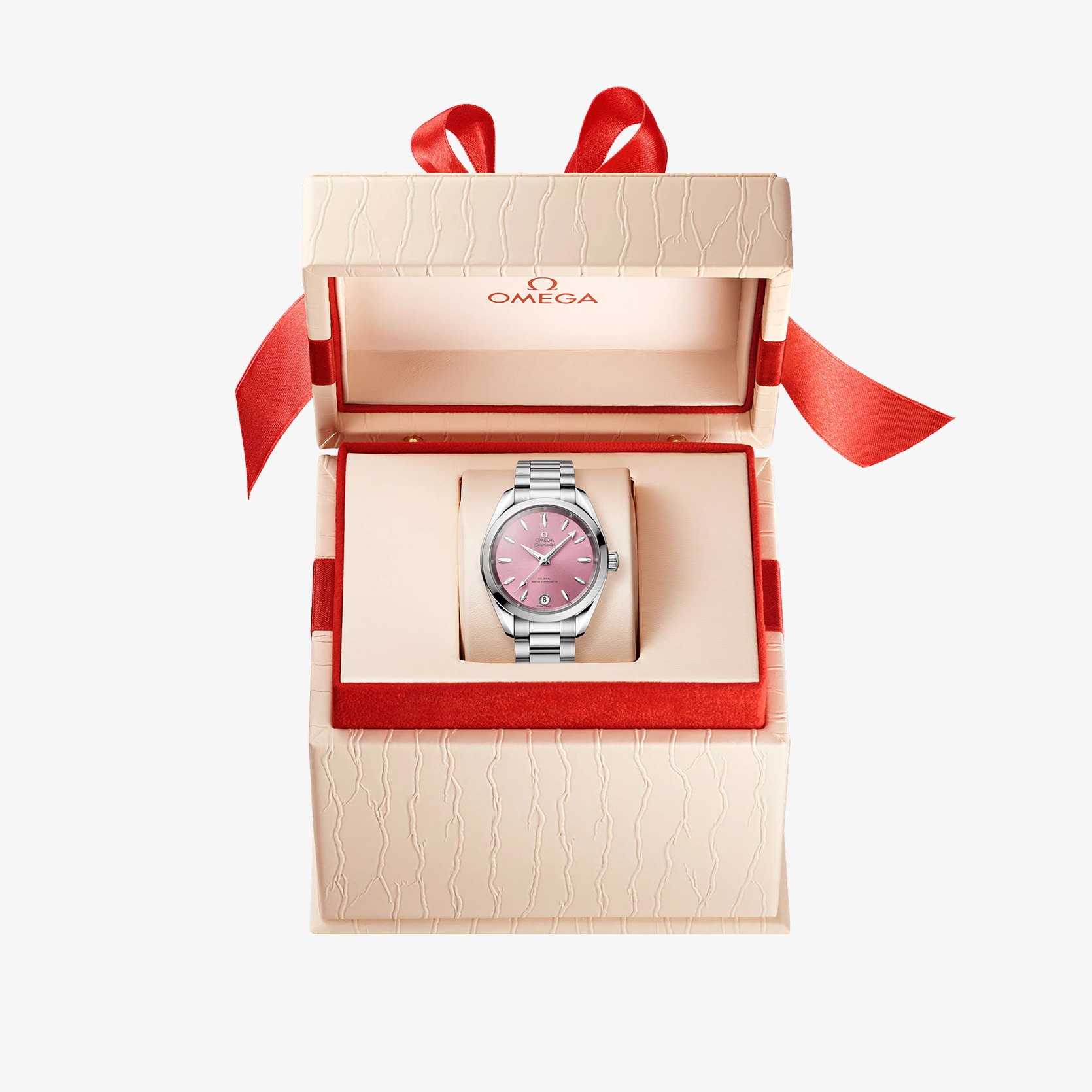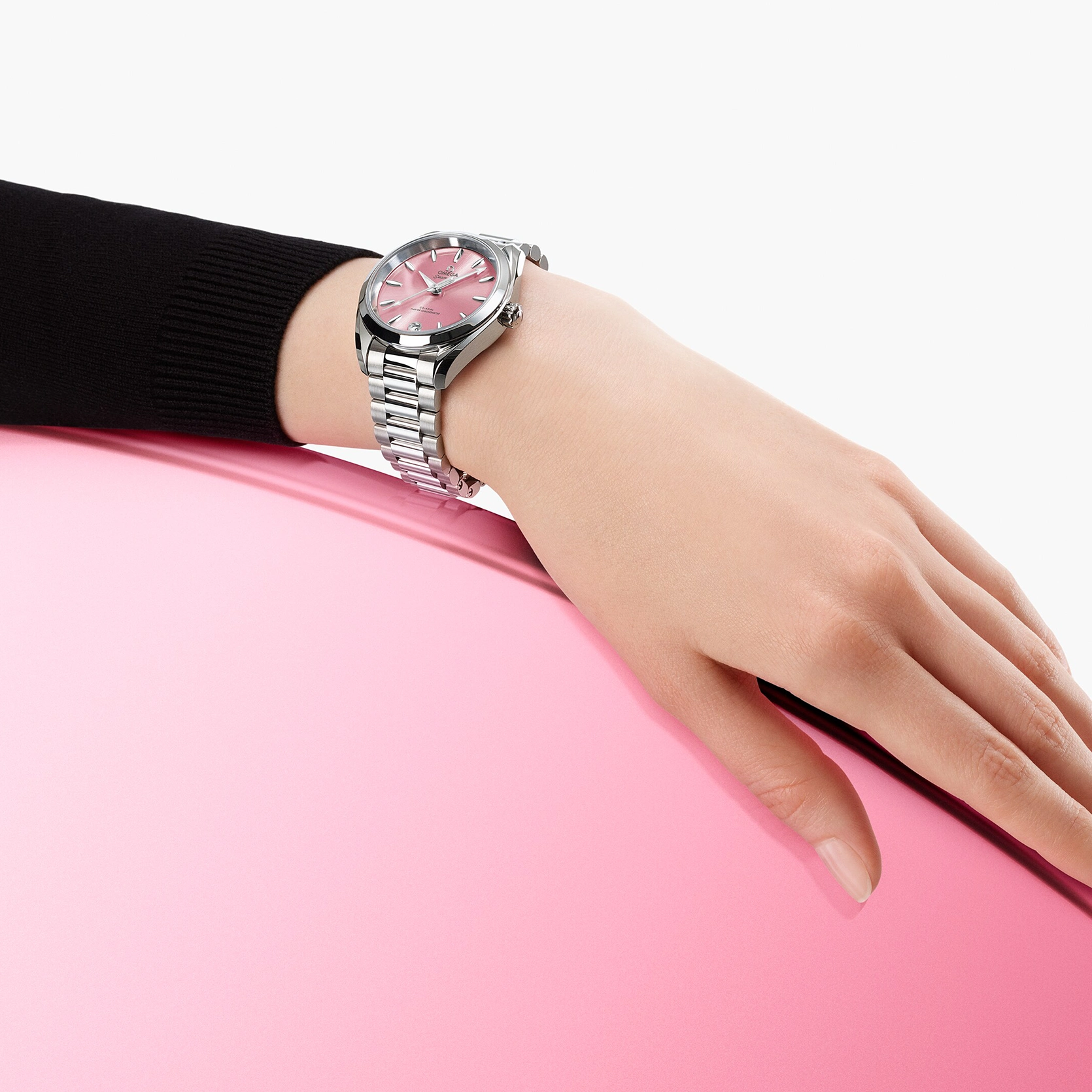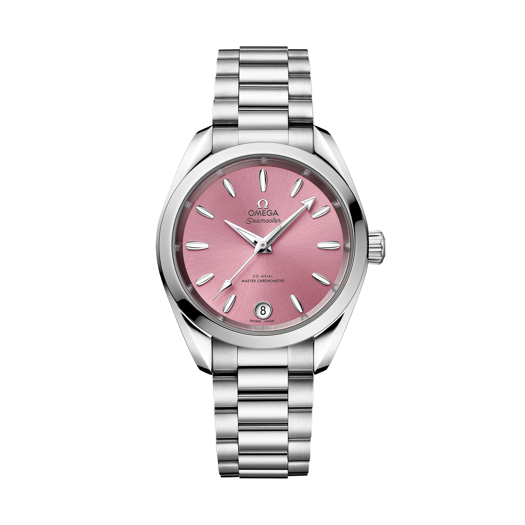 Das muschelrosafarbene Zifferblatt aus Messing ist lackiert und von der Mitte aus mit einem Sonnenschliff versehen. Bei 6 Uhr befindet sich ein Datumsfenster, und die Zeiger, Indizes sowie das OMEGA Logo bestehen aus diamantpoliertem 18 K Weißgold. Diese klassische Seamaster wird von einem polierten und gebürsteten Armband mit abgerundeten Gliedern am Handgelenk gehalten und von OMEGAs Co-Axial Master Chronometer Kaliber 8800 angetrieben, das vom Eidgenössischen Institut für Metrologie (METAS) zertifiziert wurde und höchsten Branchenstandards entspricht.