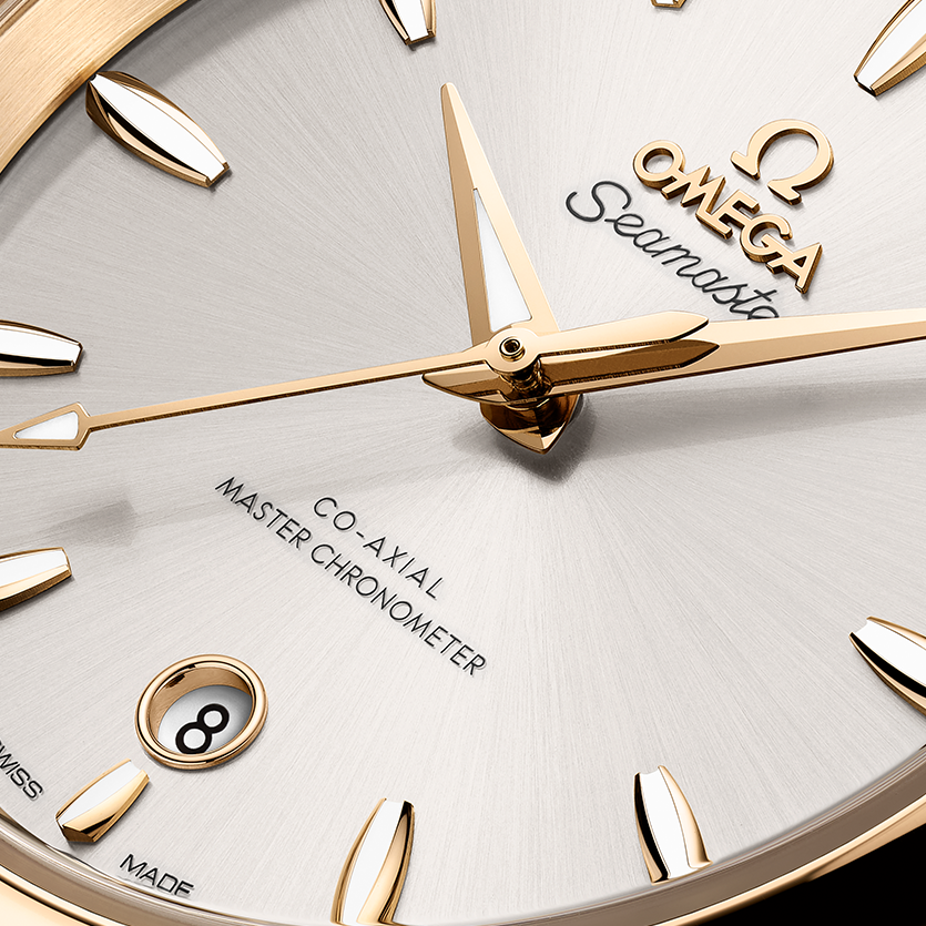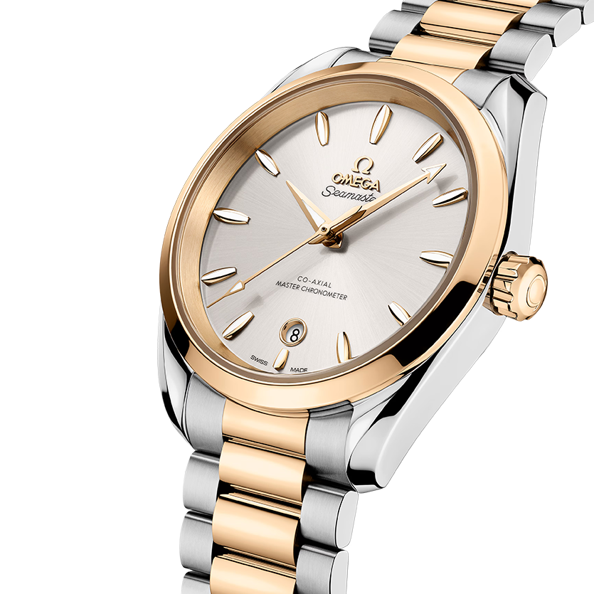 Ref. 220.20.38.20.02.002 - Die Seamaster Aqua Terra ist eine ausgezeichnete Hommage an OMEGAs umfangreiches maritimes Vermächtnis und kombiniert klassisches Design mit zeitgenössischer Inspiration. Dieses 38-mm-Modell aus poliertem Edelstahl und 18 K Moonshine™-Gold besitzt eine konische Krone sowie einen Gehäuseboden mit Wellenmuster und einem flachen Saphirglas. Das silberfarbene, lackierte Zifferblatt mit Sonnenschliff ist mit einem runden Datumsfenster bei 6 Uhr versehen, das von einem Ring aus Moonshine™-Gold umrahmt wird. Auch für die facettierten Zeiger und die charakteristischen Stundenindizes, die wie Bootsrümpfe geformt und mit weißer Super-LumiNova gefüllt sind, hat OMEGA 18 K Moonshine™-Gold verwendet. Die Uhr mit passendem Armband aus Edelstahl und 18 K Moonshine™-Gold wird von dem OMEGA Co-Axial Master Chronometer Kaliber 8800 angetrieben, das von dem Eidgenössischen Institut für Metrologie (METAS) gemäß den höchsten Branchenstandards zertifiziert wurde.