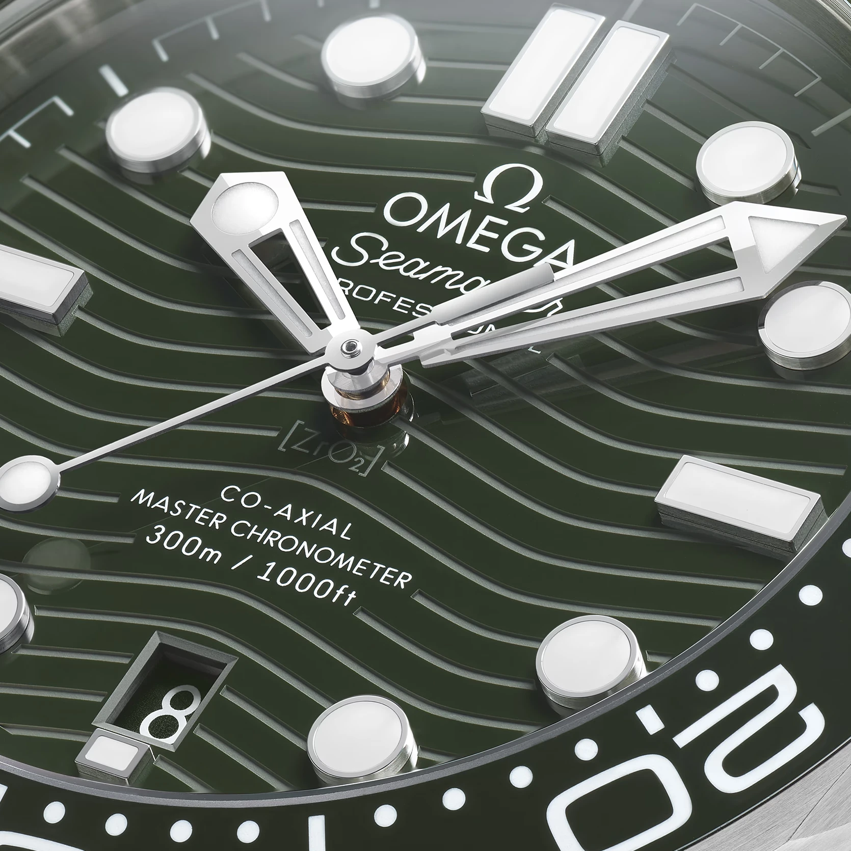 Dieses 42-mm-Modell aus Edelstahl besticht durch eine grüne Keramiklünette mit einer Tauchskala aus weißem Email. Das Zifferblatt besteht ebenfalls aus polierter grüner Keramik und verfügt ferner über lasergravierte Wellen und ein Datumsfenster bei 6 Uhr. Die skelettierten Zeiger und erhabenen Indizes sind rhodiniert und mit weißer Super-LumiNova gefüllt. Das Heliumauslassventil weist eine konische Form auf. Angetrieben wird die Uhr mit verstellbarem Edelstahlarmband mit extra Tauchererweiterung vom OMEGA Master Chronometer-Kaliber 8800, das durch das Saphirglas des Gehäusebodens mit gewelltem Rand bewundert werden kann.
