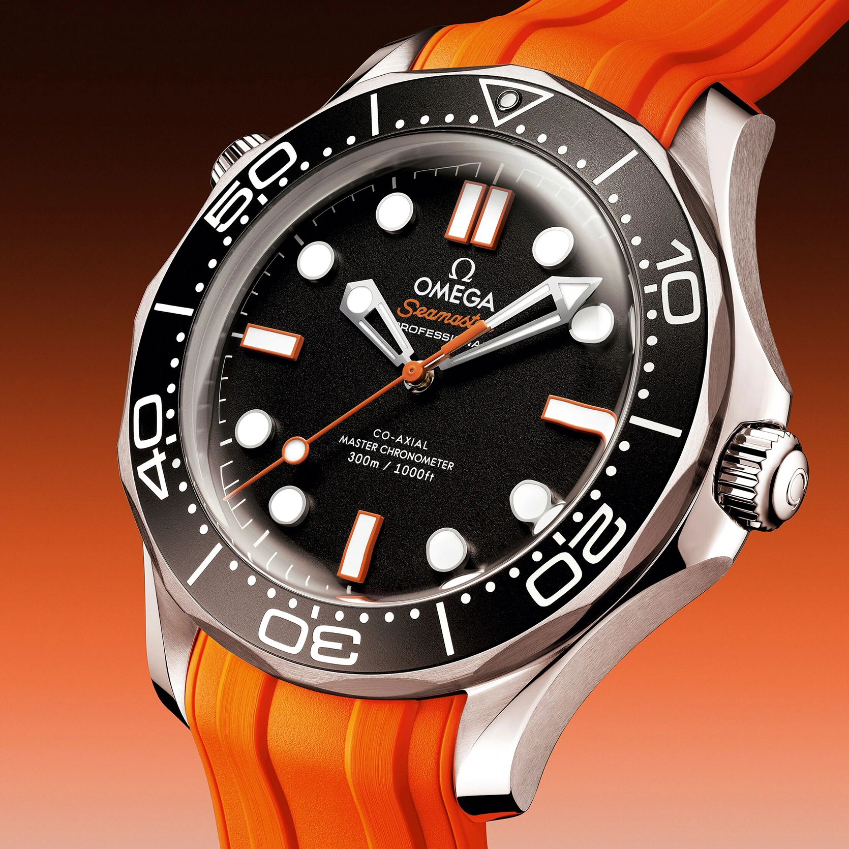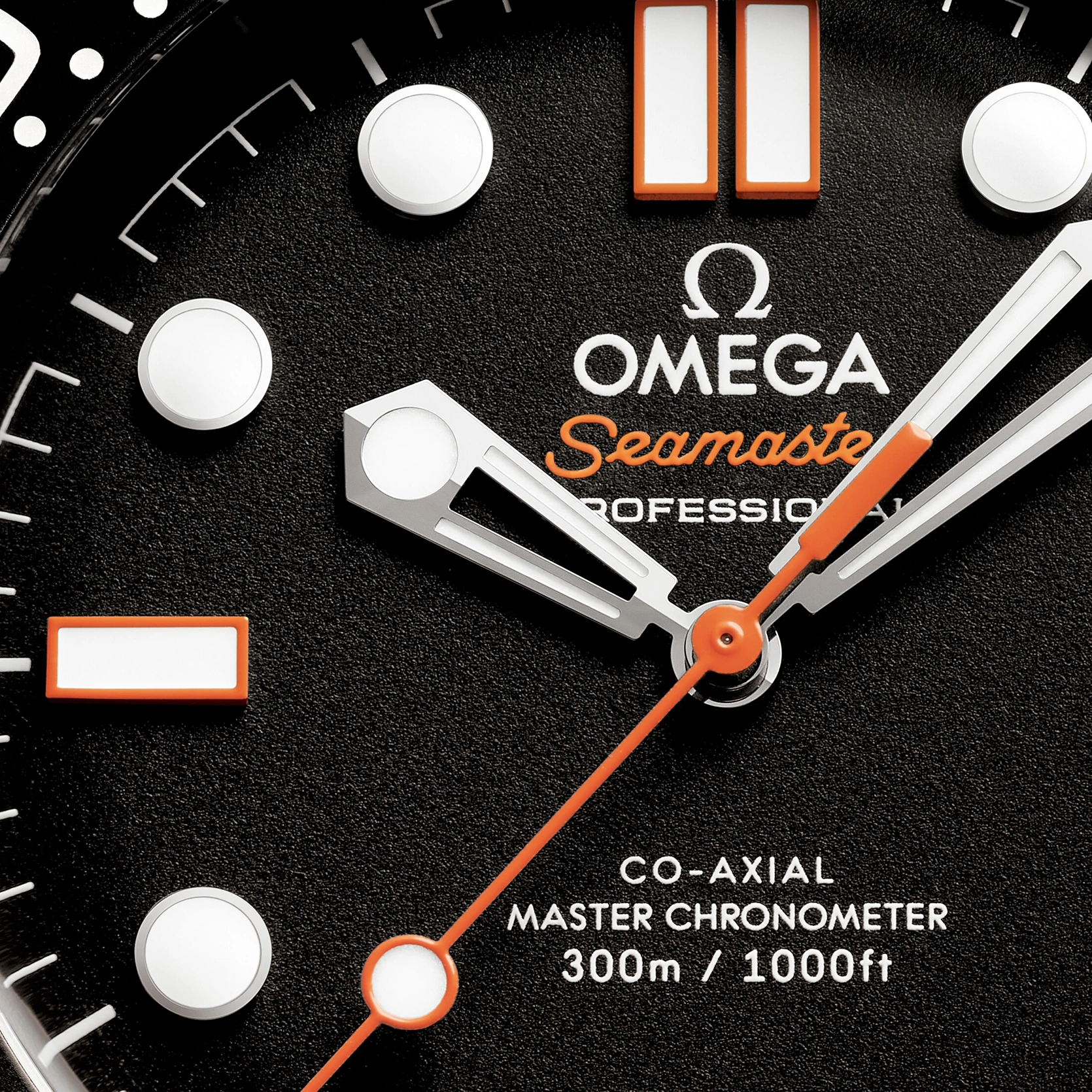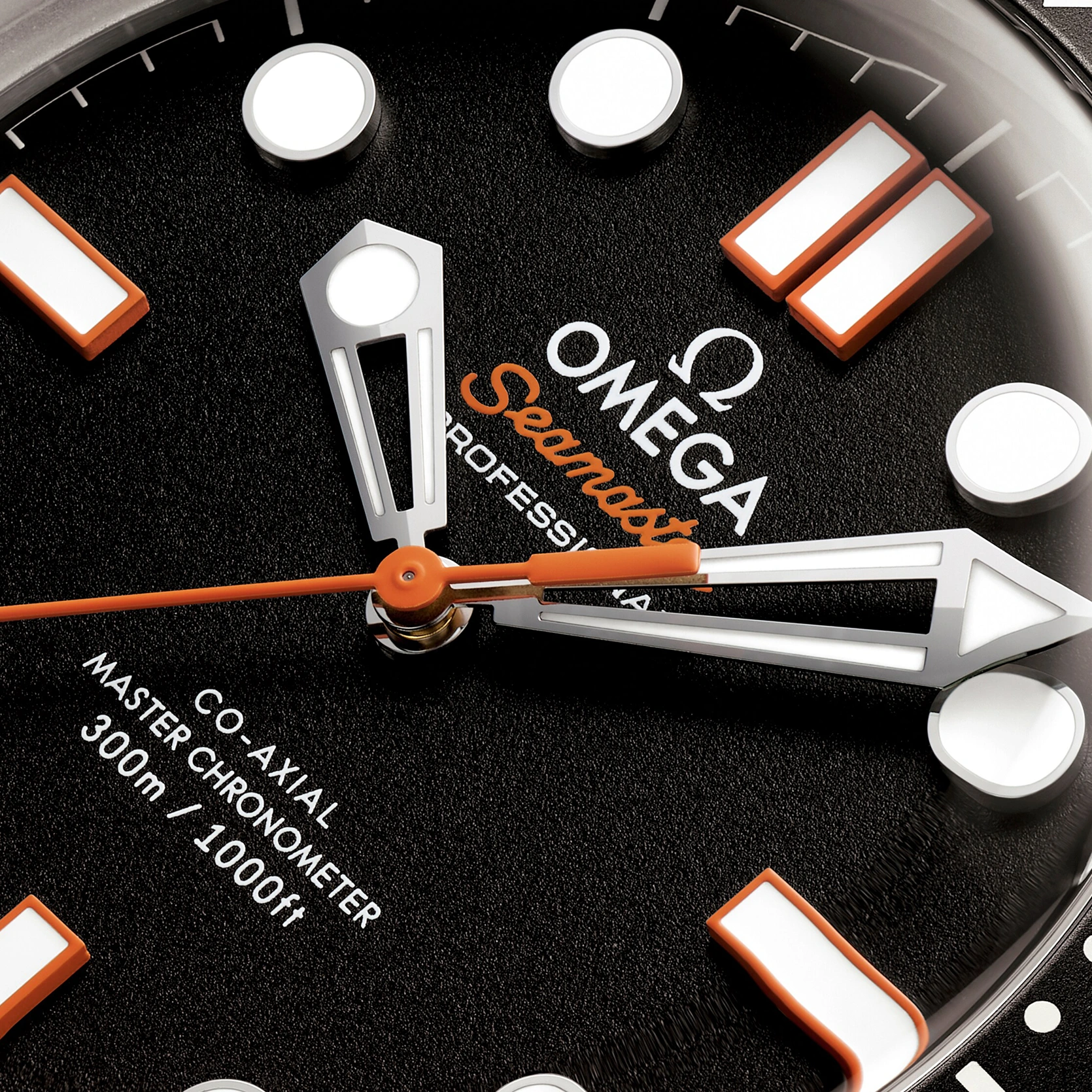 Ref. 210.32.42.20.01.006 - Seit 1993 hat die Seamaster Diver 300M eine begeisterte Anhängerschaft. Für die moderne Kollektion von heute hat OMEGA das berühmte maritime Erbe aufgegriffen und mit innovativsten Ideen und fortschrittlichstem Design bereichert. Das 42-mm-Gehäuse aus Edelstahl verfügt über einen schwarzen, mit Oxalsäure eloxierten Lünettenring aus Aluminium, der eine Tauchskala aus weißer Super-LumiNova aufweist. Schwarzes Aluminium wurde auch für das Zifferblatt verwendet, dessen rhodinierte, skelettierte Zeiger und Indizes ebenfalls mit weißer Super-LumiNova gefüllt sind. Für den zentralen Sekundenzeiger, die vier Viertelstundenindizes und den Namen Seamaster fiel die Wahl auf die Farbe Orange, das OMEGA Logo wurde in Weiß aufgedruckt. Am Handgelenk gehalten wird die Uhr von einem integrierten orangefarbenen Kautschukarmband mit Faltschließe, für den Antrieb sorgt das OMEGA Co-Axial Master Chronometer Kaliber 8806, das durch den Saphirglasboden bewundert werden kann.
