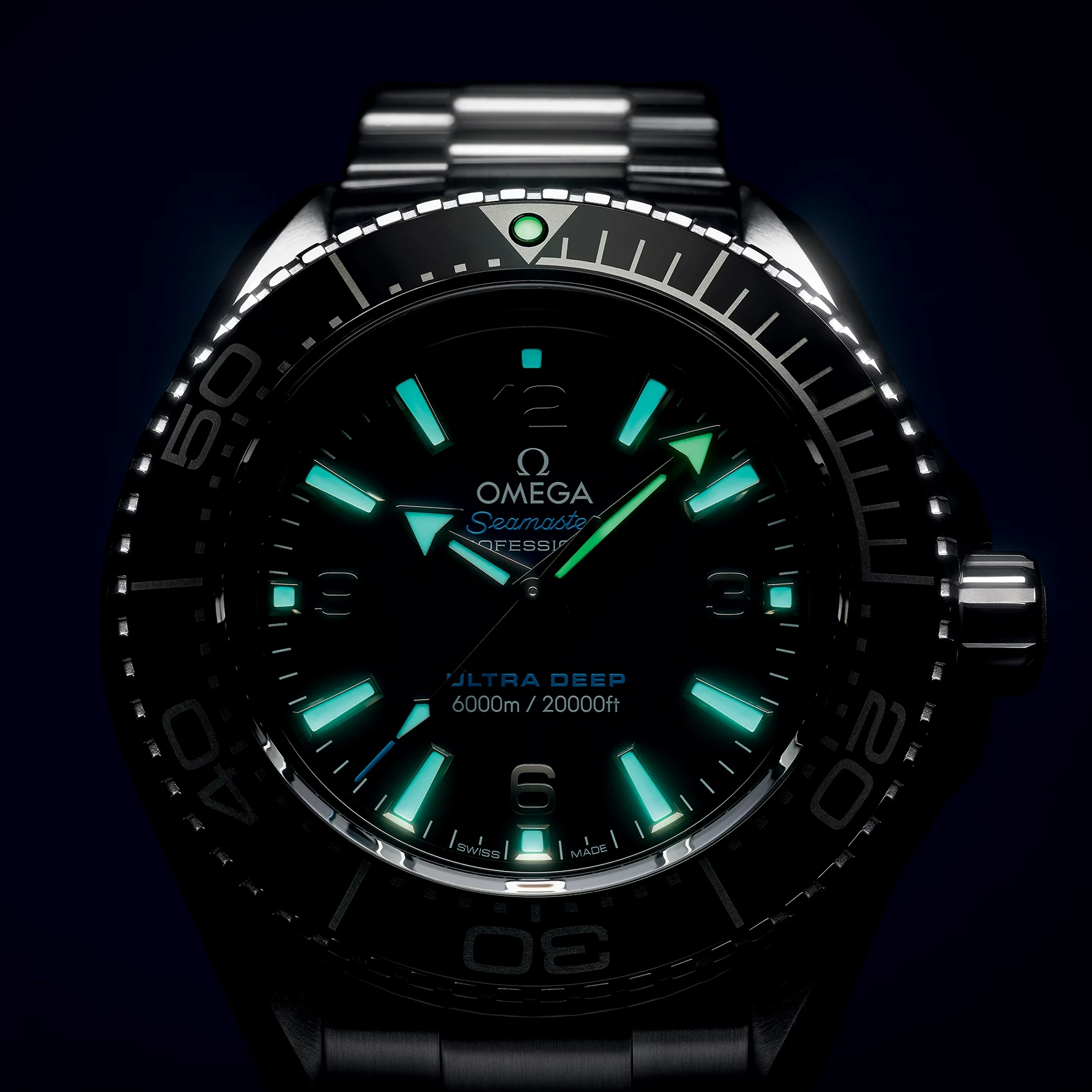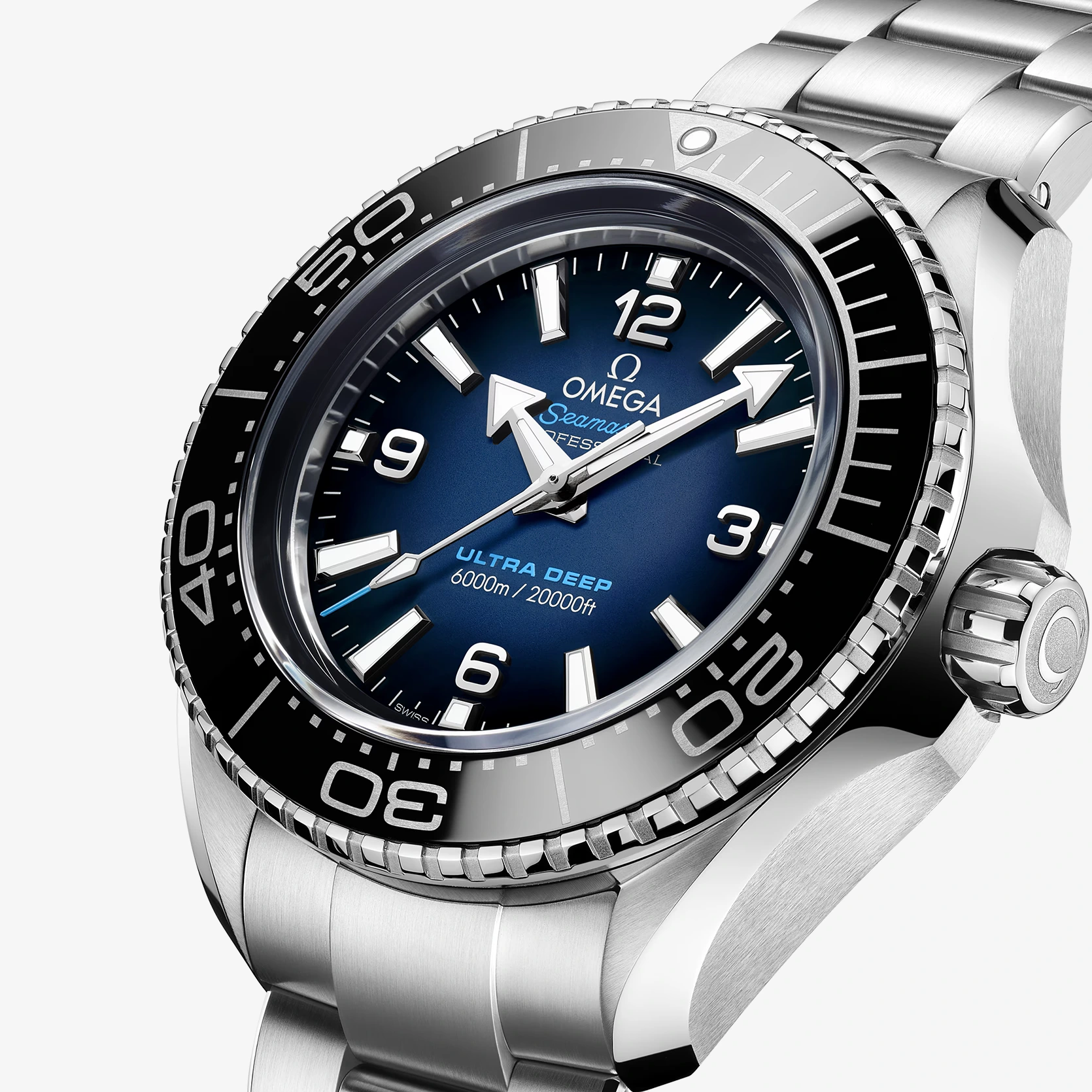 Nach diesem Weltrekord-Tauchgang wurde die Uhr nun für eine einzigartige Kollektion überarbeitet, die der Öffentlichkeit zum Verkauf angeboten wird. Das während der Entwicklungsphase unter realen Unterwasserbedingungen entwickelte Design weist eine Wasserdichtigkeit bis zu einer Tiefe von 6.000 Metern (20.000 Fuß) auf und entspricht der Norm ISO 6425:2018, dem Standard für Uhren von Sättigungstauchern. Dieses 45,5 mm große Modell aus robustem O-MEGASTEEL besitzt eine polierte schwarze Keramiklünette mit einer Tauchskala aus Liquidmetal™. Durch das hervorstehende, gewölbte Saphirglas ist ein lackiertes Zifferblatt mit einem Farbverlauf von Blau nach Schwarz sowie Zeigern und Indizes aus 18 K Weißgold zu sehen, die mit weißer Super-LumiNova beschichtet sind. Die Uhr wird von einem O-MEGASTEEL Armband mit OMEGAs patentierter PUSH-Faltschließe und extra Taucherverlängerung am Handgelenk gehalten, während das Medaillon aus Titan Grade 5 auf dem Gehäuseboden per Laser mit einem Sonar-Symbol und dem ikonischen OMEGA Seepferdchen in der Mitte graviert wurde. Angetrieben wird die Uhr von dem OMEGA Co-Axial Master Chronometer Kaliber 8912.