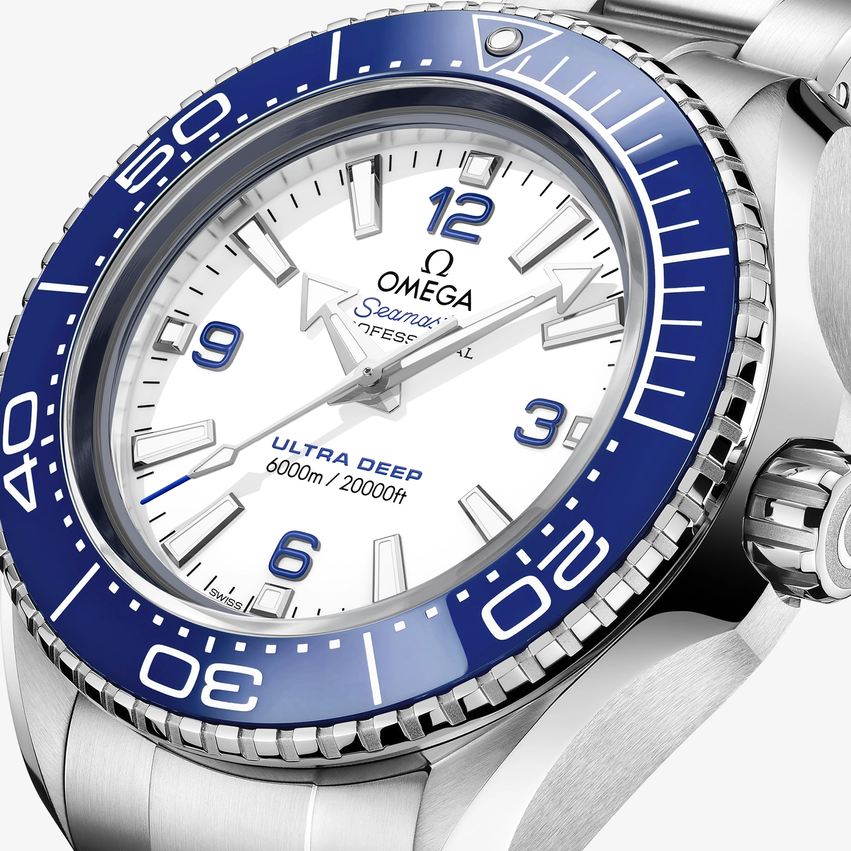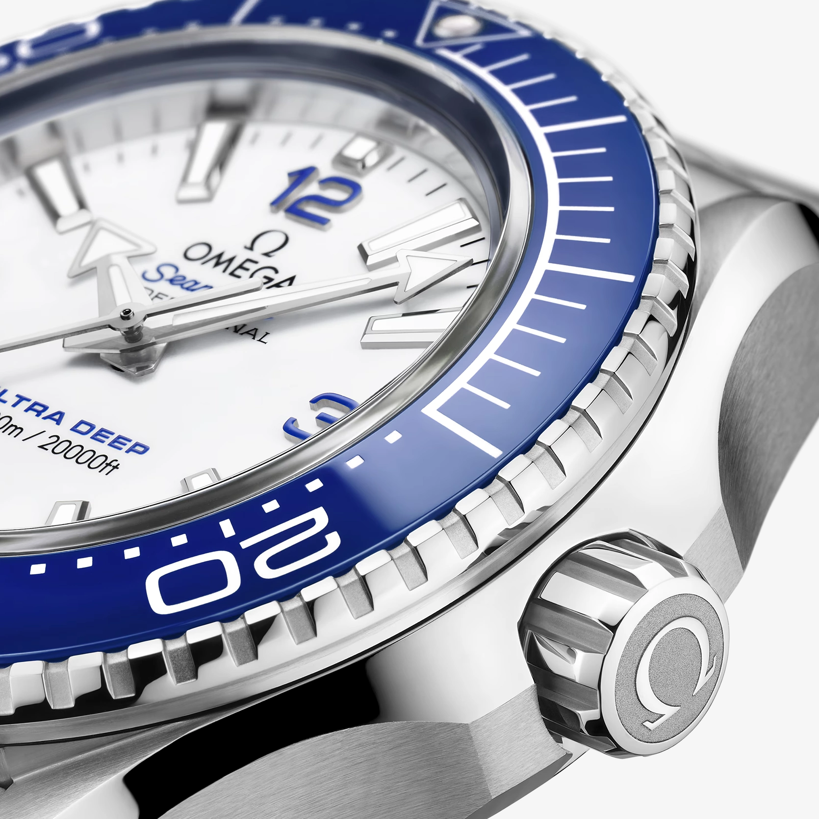 Nach diesem Weltrekord-Tauchgang wurde die Uhr nun für eine einzigartige Kollektion überarbeitet, die der Öffentlichkeit zum Verkauf angeboten wird. Das während der Entwicklungsphase unter realen Unterwasserbedingungen entwickelte Design weist eine Wasserdichtigkeit bis zu einer Tiefe von 6.000 Metern (20.000 Fuß) auf und entspricht der Norm ISO 6425:2018, dem Standard für Uhren von Sättigungstauchern. Dieses 45,5 mm große Modell aus robustem O-MEGASTEEL besitzt eine polierte blaue Keramiklünette mit einer Tauchskala aus weißem Email. Durch das hervorstehende, gewölbte Saphirglas ist ein weißes Zifferblatt mit vier arabischen Ziffern in Blau sowie Zeigern und Indizes aus 18 K Weißgold zu sehen, die mit weißer Super-LumiNova beschichtet sind. Die Uhr wird von einem O-MEGASTEEL Armband mit OMEGAs patentierter PUSH-Faltschließe und extra Taucherverlängerung am Handgelenk gehalten, während das Medaillon aus Titan Grade 5 auf dem Gehäuseboden per Laser mit einem Sonar-Symbol und dem ikonischen OMEGA Seepferdchen in der Mitte graviert wurde. Angetrieben wird die Uhr von dem OMEGA Co-Axial Master Chronometer Kaliber 8912.