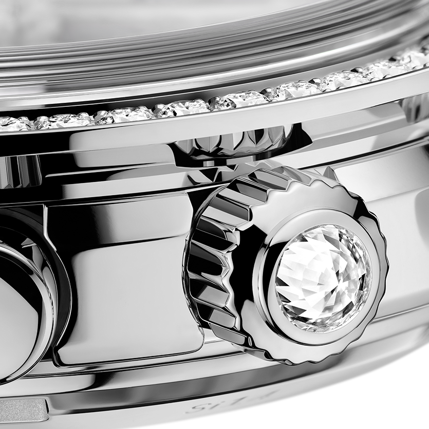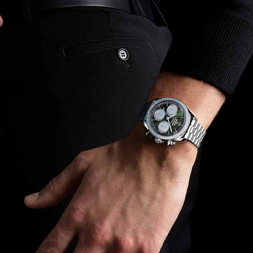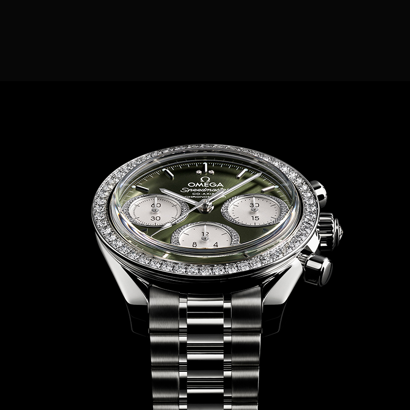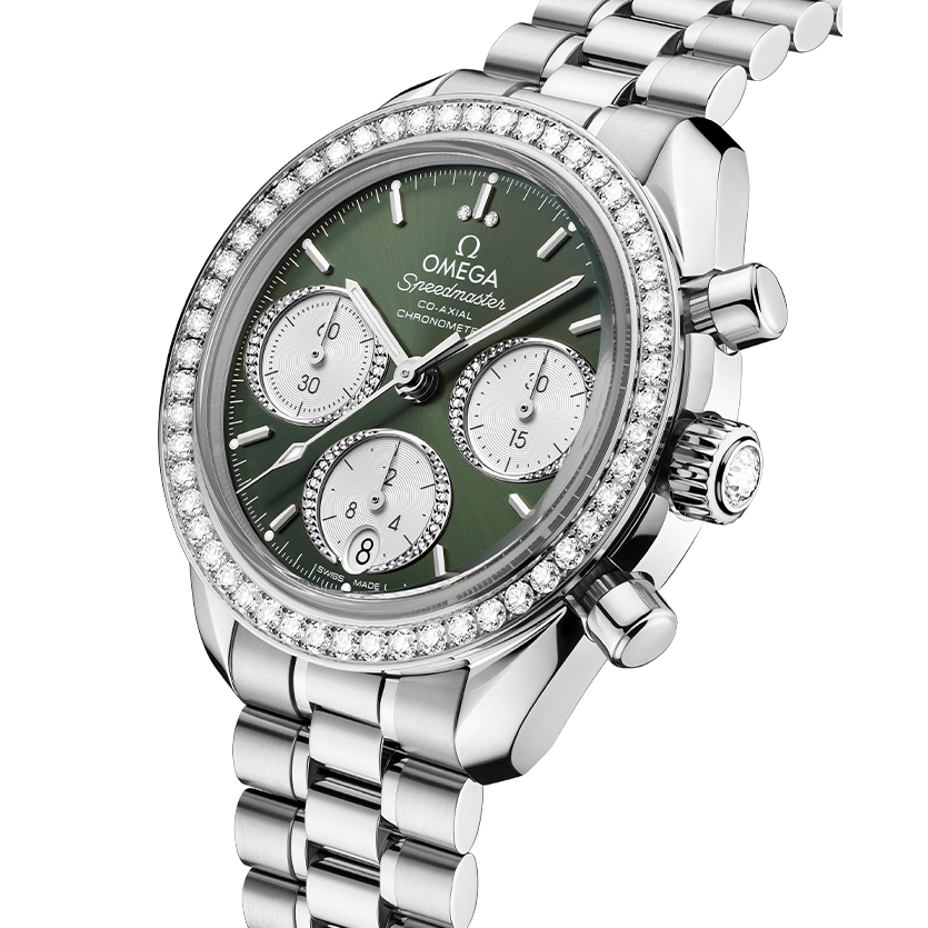 Dieses Modell mit einem vollständig polierten Gehäuse aus Edelstahl besitzt eine mit 52 Diamanten besetzte Lünette und eine polierte Krone, in die ein einzelner Diamant gefasst wurde. Das Zifferblatt mit grüner PVD-Beschichtung verfügt über horizontal ovale Hilfszifferblätter mit silberfarbener Beschichtung und ein vertikal ovales Datumsfenster bei 6 Uhr. Die Zeiger für Stunden und Minuten sind diamantpoliert, rhodiniert und mit weißer, grün leuchtender Super-LumiNova gefüllt. Am Handgelenk gehalten wird die Uhr von einem polierten und gebürsteten Armband aus Edelstahl mit OMEGAs patentiertem Komfortverschluss. Ihr verschraubter Gehäuseboden ist mit einem eingeprägten Seepferdchen-Medaillon versehen. Für den Antrieb sorgt das OMEGA Co-Axial Kaliber 3330.