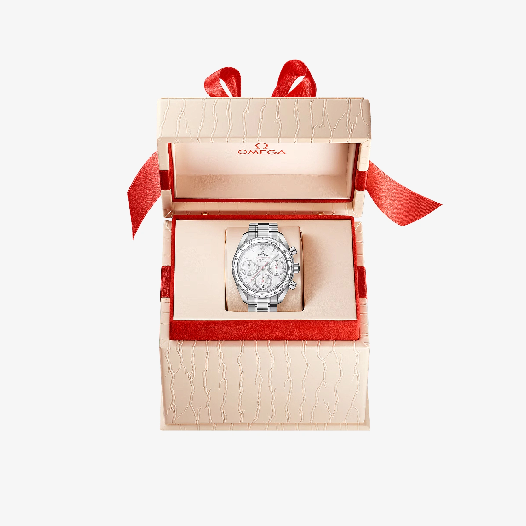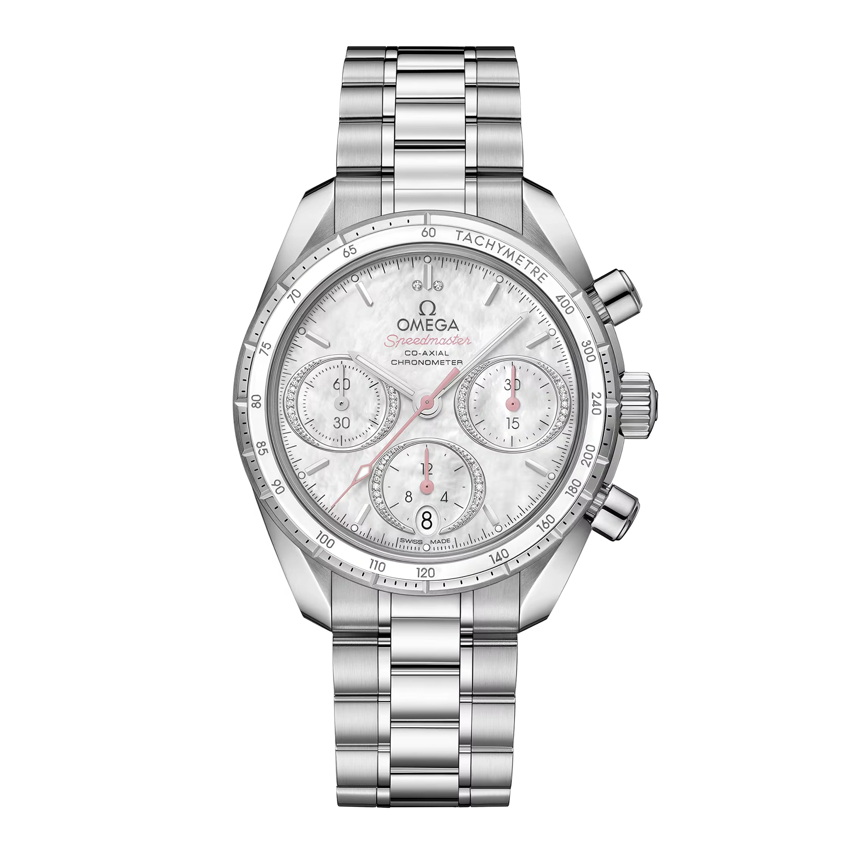 Dieses Modell verfügt über ein Gehäuse aus Edelstahl und eine Lünette, zu der eine Tachymeterskala auf einem weißen Keramikring gehört. Das weiße Perlmuttzifferblatt ist mit horizontal ausgerichteten ovalen und diamantbesetzten Hilfszifferblättern und einem vertikal ausgerichteten ovalen Datumsfenster bei 6 Uhr bestückt. Während die Indizes rhodiniert sind, sind die Zeiger entweder ebenfalls rhodiniert oder aber rosa. Die Uhr wartet mit einem Edelstahlarmband sowie einem Seepferdchen-Medaillon auf dem Gehäuseboden auf und wird von OMEGAs Co-Axial Kaliber 3330 angetrieben.