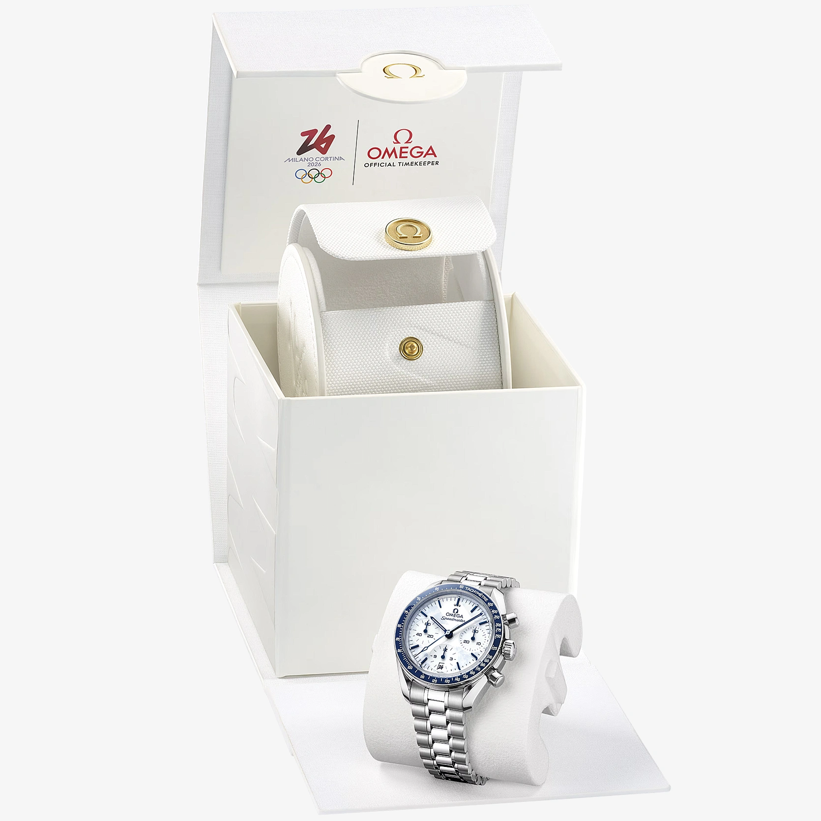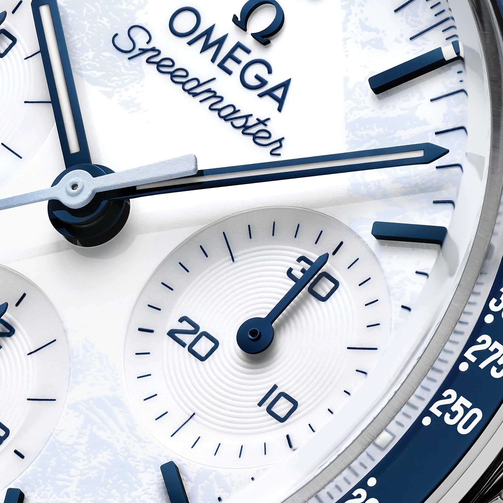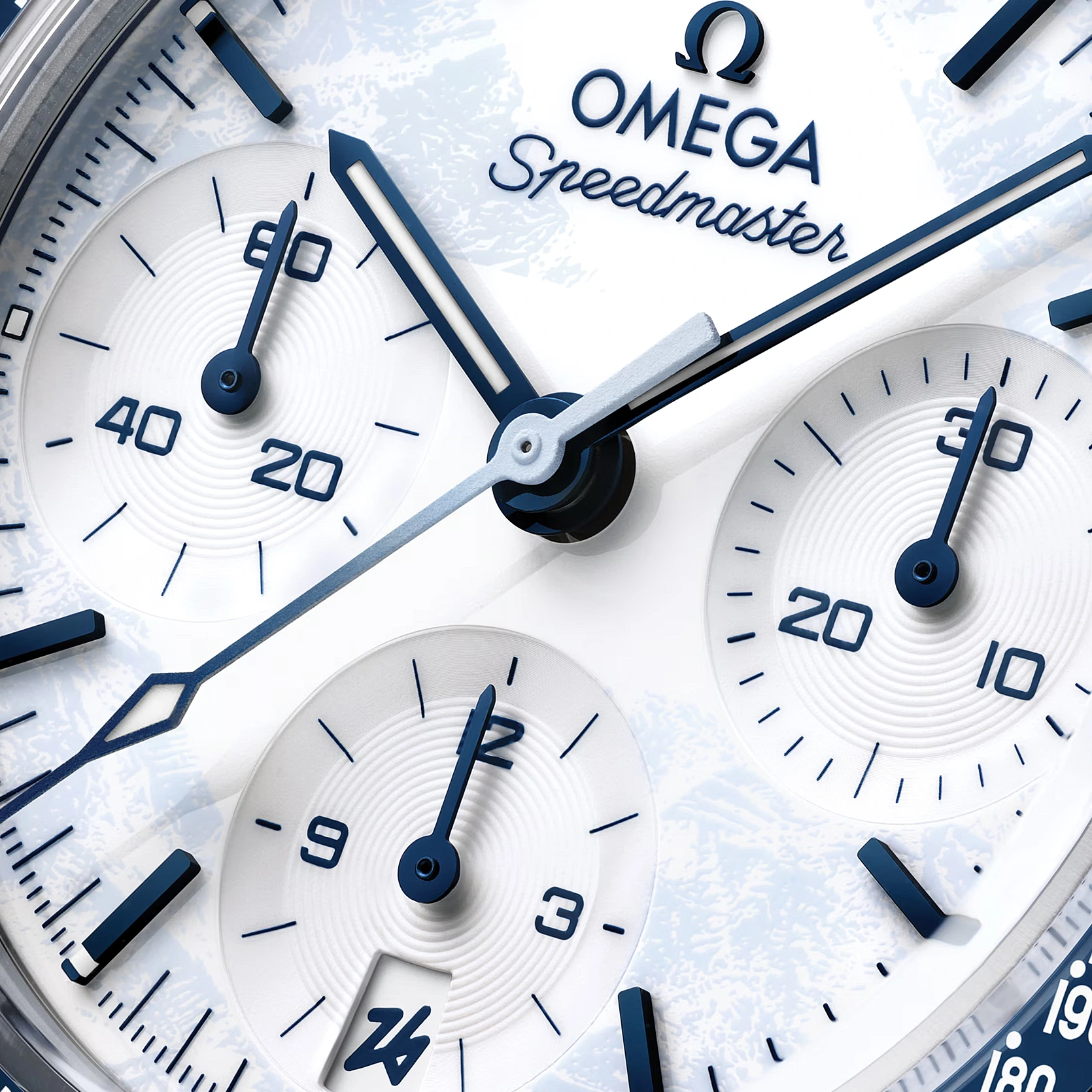 Ref. 522.30.38.50.04.001 - Um OMEGAs Rolle als offizieller Zeitnehmer der Olympischen Winterspiele zu feiern, kombiniert dieser exklusive Zeitmesser das zeitlose Design der Speedmaster mit einzigartigen Details als Hommage an Milano Cortina 2026. Die 38 mm große Uhr ist aus Edelstahl gefertigt und verfügt über eine blaue Keramiklünette mit einer Tachymeterskala aus weißer Emaille. Für einen winterlichen Look ist das lackierte weiße Zifferblatt mit einem mattierten blauen Aufsatz und einem Fingerabdruckmuster versehen, inspiriert vom Emblem der Milano Cortina 2026. Die weißen Hilfszifferblätter sind ebenfalls lackiert, mit einer speziellen Azurage-Veredelung, die an eine präparierte Skipiste erinnert. Weitere interessante Details sind der zentrale Sekundenzeiger mit seinem blauen Farbverlauf sowie die dunkelblaue Typografie der Milano Cortina, die im Datumsfenster erscheint. Auf dem Gehäuseboden befindet sich ein geprägtes Milano Cortina 2026 Medaillon. Diese Uhr wird vom automatischen Co-Axial Kaliber 3330 angetrieben und in einer besonderen Präsentationsbox verkauft.