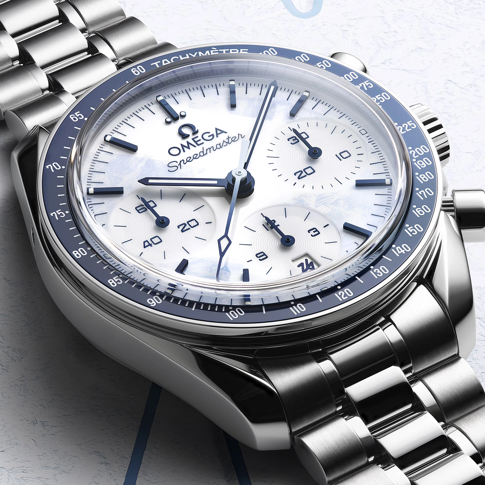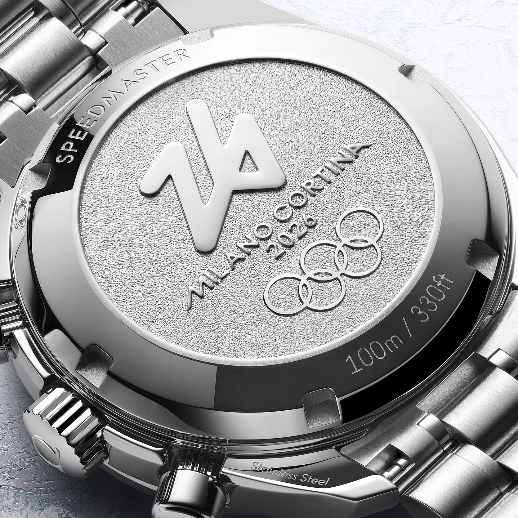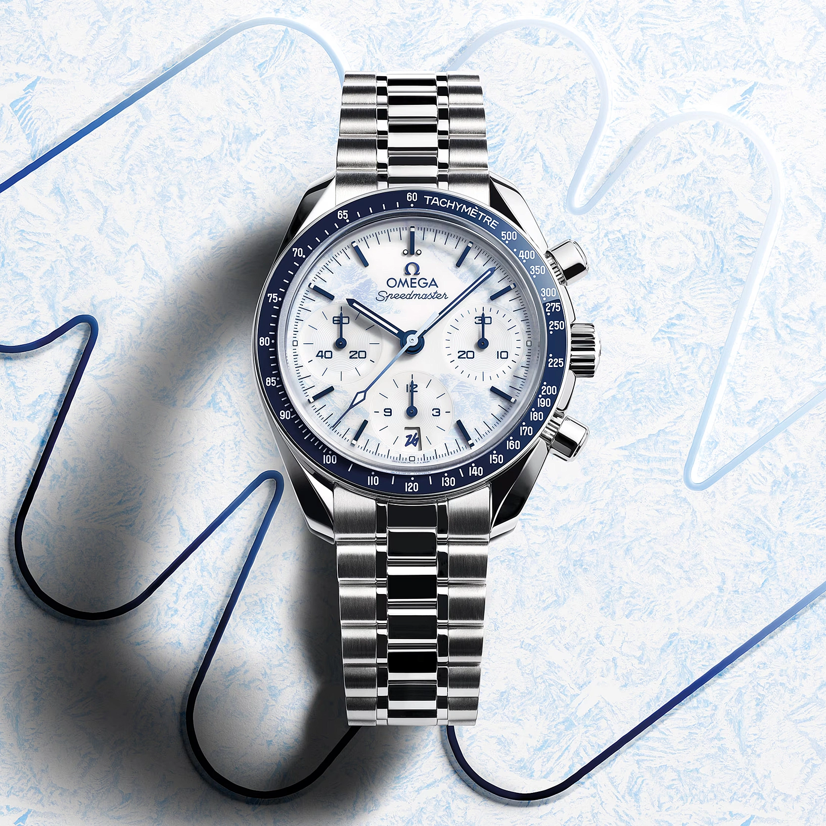 Ref. 522.30.38.50.04.001 - Um OMEGAs Rolle als offizieller Zeitnehmer der Olympischen Winterspiele zu feiern, kombiniert dieser exklusive Zeitmesser das zeitlose Design der Speedmaster mit einzigartigen Details als Hommage an Milano Cortina 2026. Die 38 mm große Uhr ist aus Edelstahl gefertigt und verfügt über eine blaue Keramiklünette mit einer Tachymeterskala aus weißer Emaille. Für einen winterlichen Look ist das lackierte weiße Zifferblatt mit einem mattierten blauen Aufsatz und einem Fingerabdruckmuster versehen, inspiriert vom Emblem der Milano Cortina 2026. Die weißen Hilfszifferblätter sind ebenfalls lackiert, mit einer speziellen Azurage-Veredelung, die an eine präparierte Skipiste erinnert. Weitere interessante Details sind der zentrale Sekundenzeiger mit seinem blauen Farbverlauf sowie die dunkelblaue Typografie der Milano Cortina, die im Datumsfenster erscheint. Auf dem Gehäuseboden befindet sich ein geprägtes Milano Cortina 2026 Medaillon. Diese Uhr wird vom automatischen Co-Axial Kaliber 3330 angetrieben und in einer besonderen Präsentationsbox verkauft.