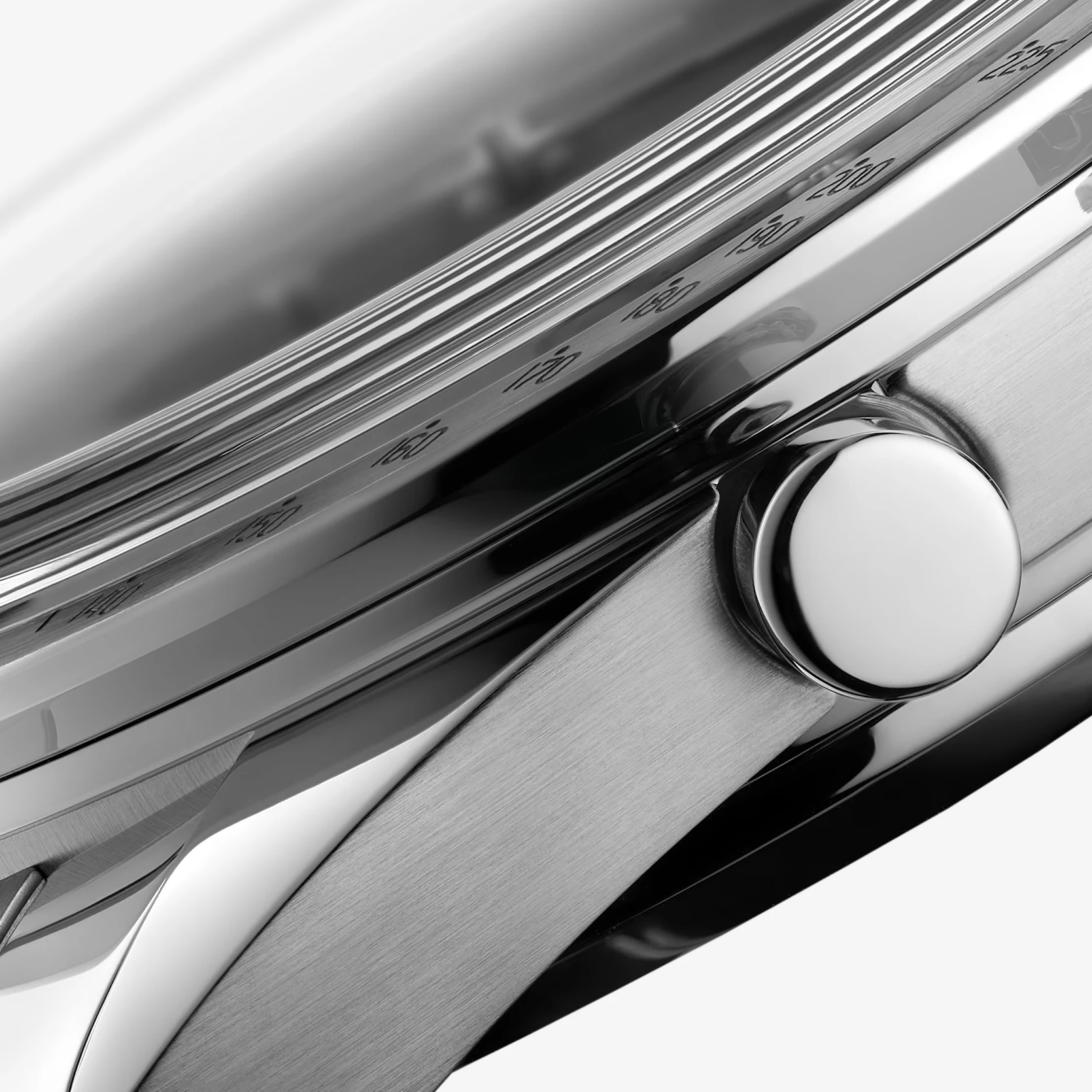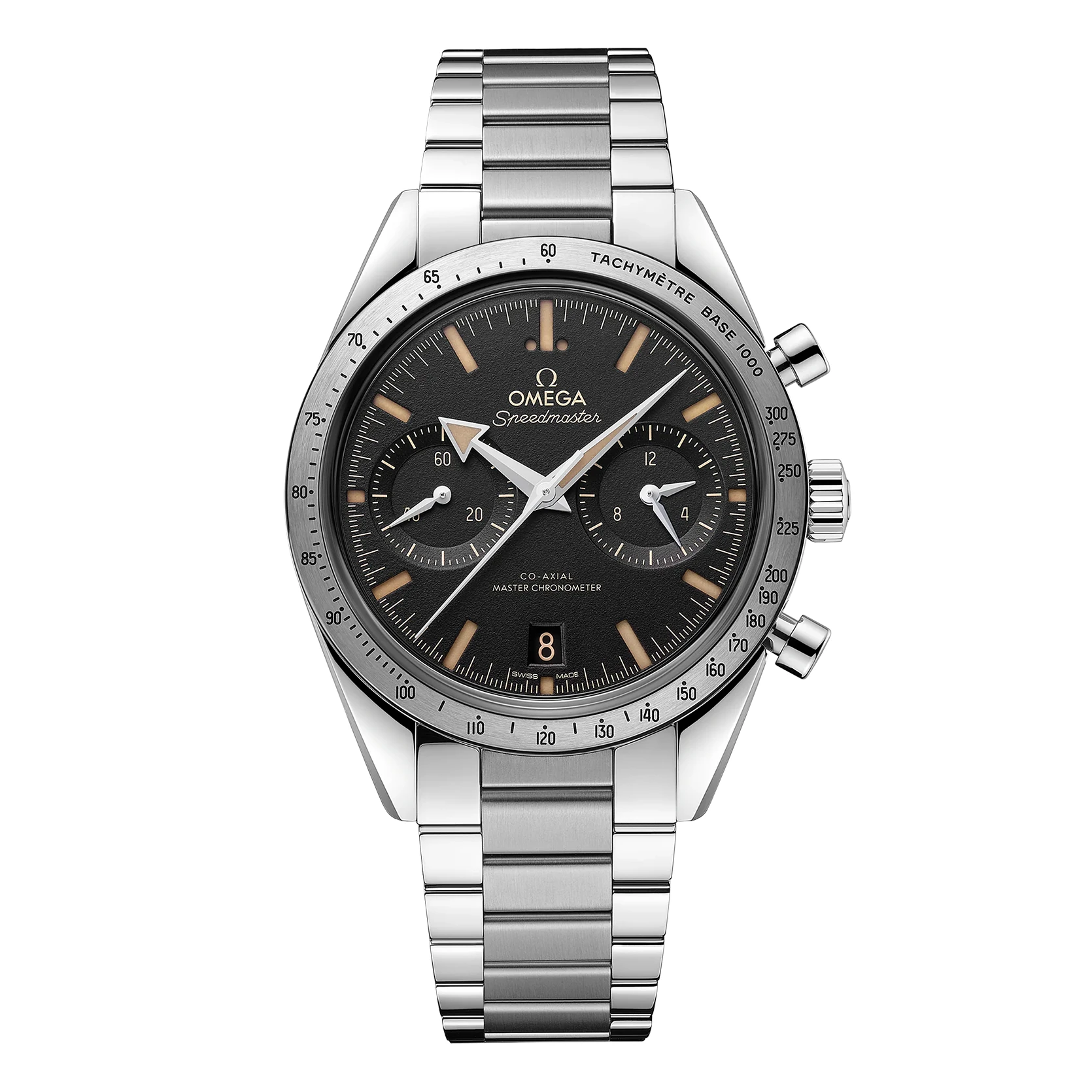 Dieses 40,5-mm-Modell, das von dem legendären Original aus dem Jahr 1957 inspiriert ist, besitzt ein Gehäuse aus Edelstahl und ein schwarzes Zifferblatt mit vertieften Stundenindizes und Vintage-Super-LumiNova. Neben den rhodinierten „Broad-Arrow“-Zeigern sind bei 6 Uhr ein Datumsfenster, bei 9 Uhr ein Hilfszifferblatt für die kleine Sekunde und bei 3 Uhr ein 12-Stunden- und ein 60-Minuten-Chronographenzähler zu sehen. Die gebürstete Lünette ist mit einer geschwärzten Tachymeterskala versehen, während der Gehäuseboden die Gravur „Speedmaster ‘57“ aufweist. Das flache Saphirglas wurde beidseitig entspiegelt. Die Uhr wird von einem passenden Armband mit OMEGAs patentiertem Komfortverschluss am Handgelenk gehalten und von dem OMEGA Co-Axial Master Chronometer Kaliber 9906 mit Handaufzug angetrieben.