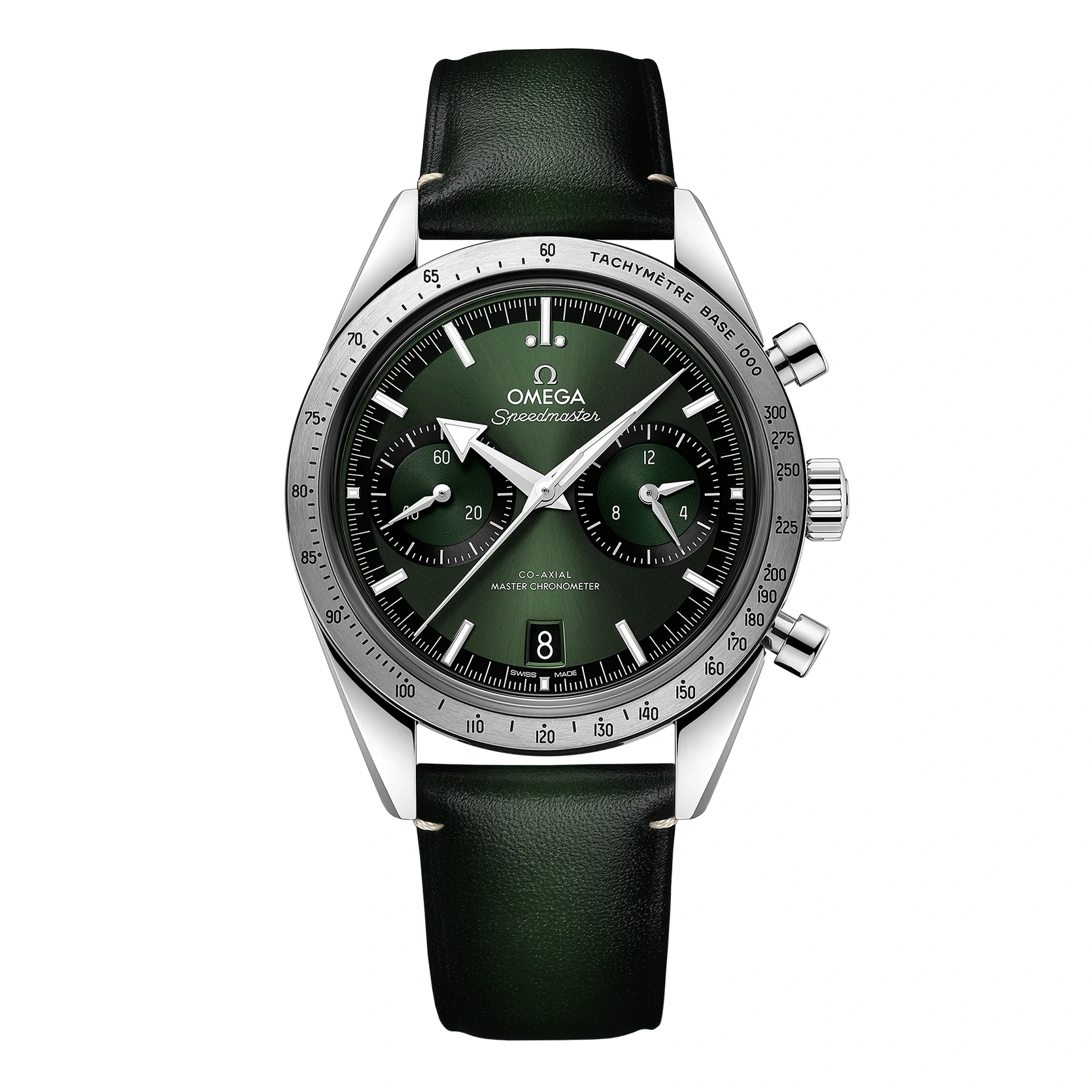 Dieses 40,5-mm-Modell, das von dem legendären Original aus dem Jahr 1957 inspiriert ist, besitzt ein Gehäuse aus Edelstahl und ein grünes Zifferblatt mit rhodinierten Stundenindizes und „Broad-Arrow“-Zeigern, die allesamt mit Super-LumiNova versehen sind. Bei 6 Uhr befindet sich ein Datumsfenster, bei 9 Uhr ein Hilfszifferblatt für die kleine Sekunde und bei 3 Uhr ein Hilfszifferblatt mit 12-Stunden- und 60-Minuten-Chronographenzählern. Die gebürstete Lünette ist mit einer geschwärzten Tachymeterskala versehen, während der Gehäuseboden die Gravur „Speedmaster ‘57“ aufweist. Das flache Saphirglas wurde beidseitig entspiegelt. Die Uhr wird von einem grünen Lederarmband mit OMEGA Logo in positivem Relief auf der Schließe am Handgelenk gehalten und von dem OMEGA Co-Axial Master Chronometer Kaliber 9906 mit Handaufzug angetrieben.