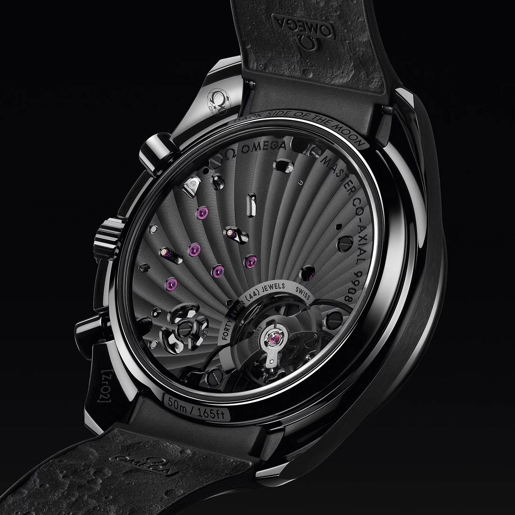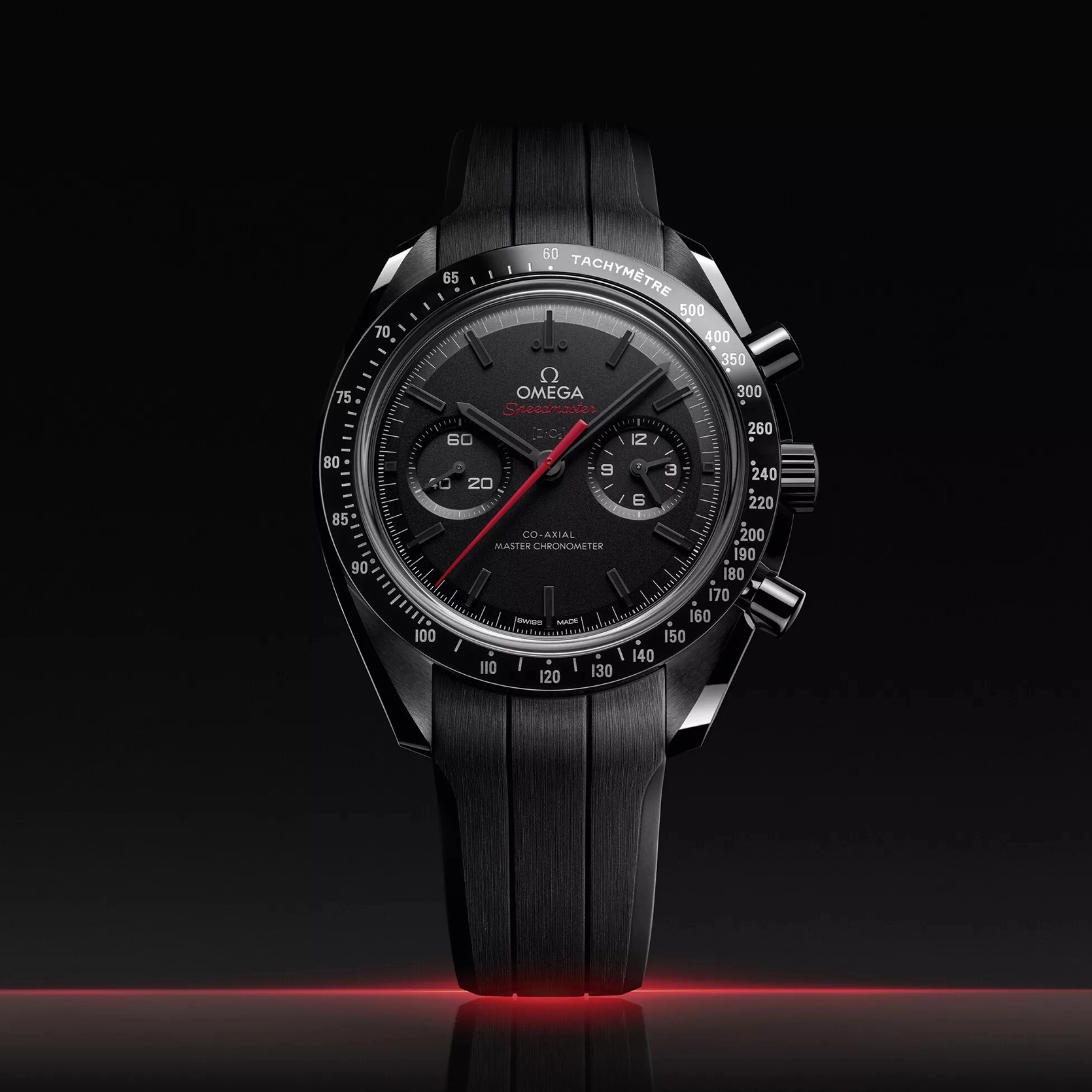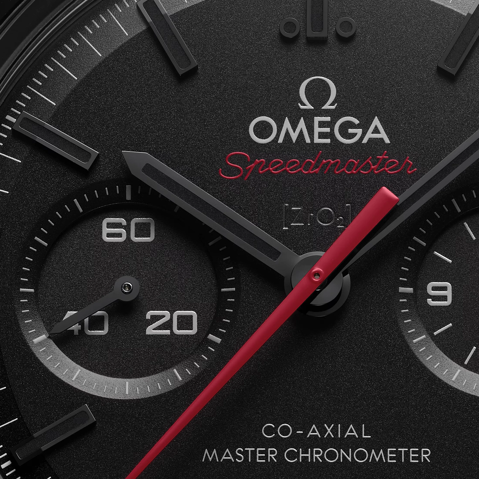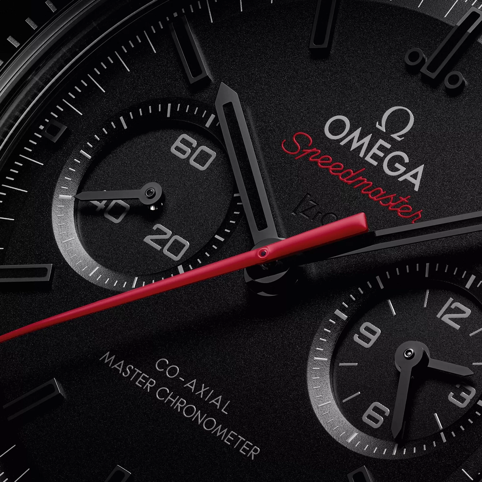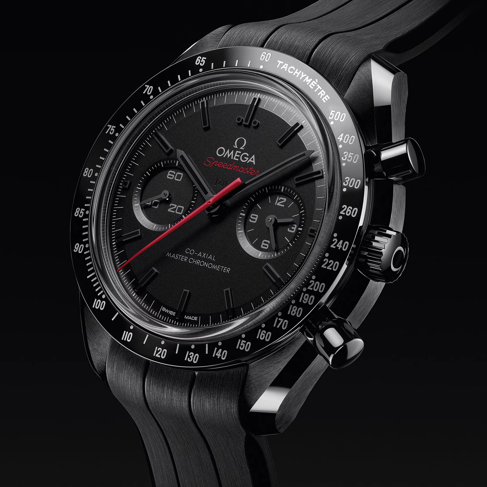 Ref. 31.092.44.51.01.001 - Als Hommage an OMEGAs Vermächtnis der Weltraumforschung verfügt diese Speedmaster Dark Side of the Moon über ein 44,25 mm großes Gehäuse aus polierter, schwarzer Keramik. Die polierte Lünette ist ebenfalls aus schwarzer Keramik gefertigt und verfügt über eine Tachymeterskala aus Liquidmetal™. Das Keramikzifferblatt unter dem vorderen Saphirglas ist mit einem Laser sandgestrahlt und besitzt eine kleine Sekundenanzeige bei 9 Uhr sowie einen 60-Minuten- und 12-Stunden-Zähler bei 3 Uhr. Die Stunden- und Minutenzeiger sowie die abgeschrägten Indizes sind alle geschwärzt und mit schwarzem Super-LumiNova (grün leuchtend) gefüllt. Der zentrale Chronographenzeiger ist für ein unverwechselbares Aussehen rot lackiert. Das durch den Gehäuseboden sichtbare OMEGA Co-Axial Master Chronometer Kaliber 9908 mit Handaufzug ist mit einer speziellen „Black Edition“-Veredelung versehen, die einen mattgeschwärzten Rotor, eine Hauptplatine und Brücken sowie schwarz lackierte Gravuren umfasst. Die Uhr wird an einem schwarzen Kautschukarmband mit einem Mondoberflächenmuster auf der Unterseite, einer Faltschließe aus Keramik und keramisiertem Titan getragen.