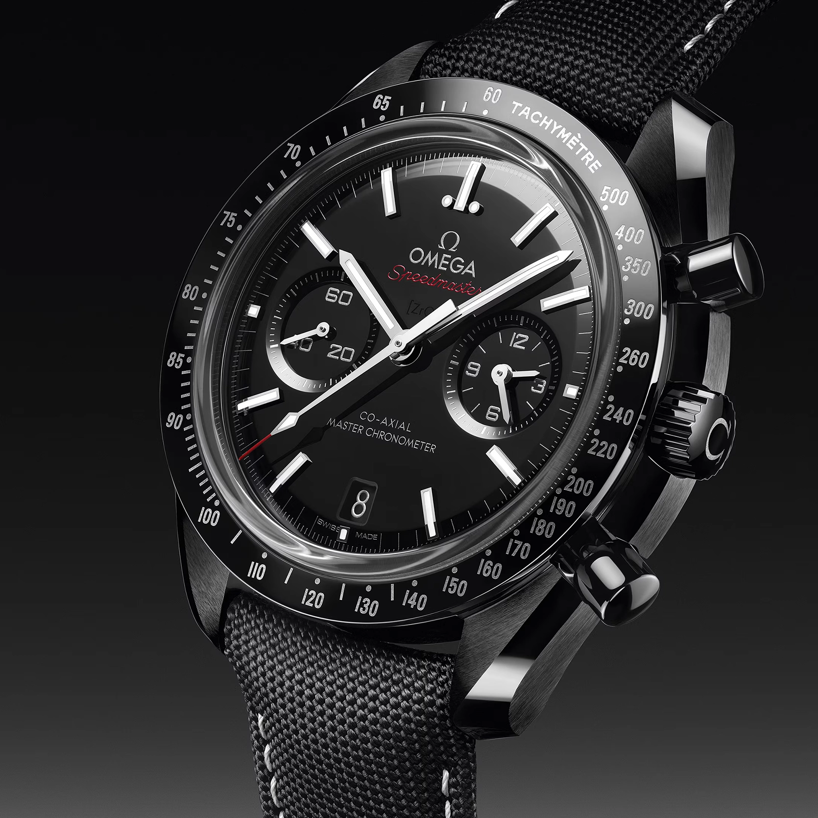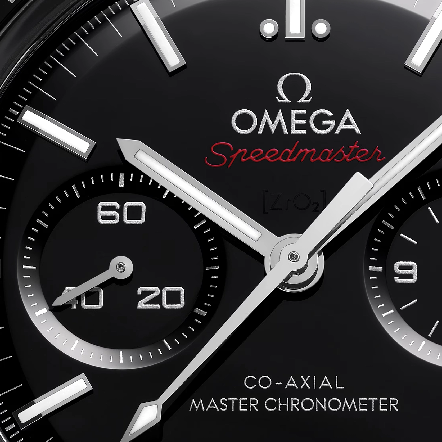 Ref. 310.92.44.51.01.002 - Als Hommage an OMEGAs Vermächtnis der Weltraumforschung verfügt diese Speedmaster Dark Side of the Moon über ein 44,25 mm großes Gehäuse aus polierter, schwarzer Keramik. Die polierte Lünette ist ebenfalls aus schwarzer Keramik gefertigt und verfügt über eine Tachymeterskala aus Liquidmetal™. Unter dem Saphirglas der Vorderseite bietet das polierte Keramikzifferblatt eine kleine Sekundenanzeige bei 9 Uhr, einen 60-Minuten- und 12-Stunden-Zähler bei 3 Uhr und ein Datumsfenster bei 6 Uhr. Die Stunden- und Minutenzeiger sowie die abgeschrägten Indizes und Hilfszifferblattzeiger sind alle aus 18 K Weißgold gefertigt und mit hellgrünem Super-LumiNova (grün leuchtend) gefüllt. Der zentrale Chronographenzeiger mit PVD-Weißgold-Beschichtung zeigt eine rote Spitze. Angetrieben von OMEGAs Co-Axial Master Chronometer Kaliber 9900 mit Automatikaufzug, ist dieser markante Zeitmesser mit einem schwarzen Nylonarmband mit Innenseite aus schwarzem Kautschuk, einer Faltschließe aus Keramik und Federklappen aus keramisiertem Titan ausgestattet.