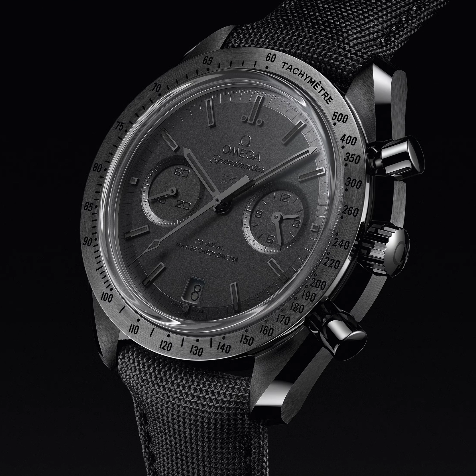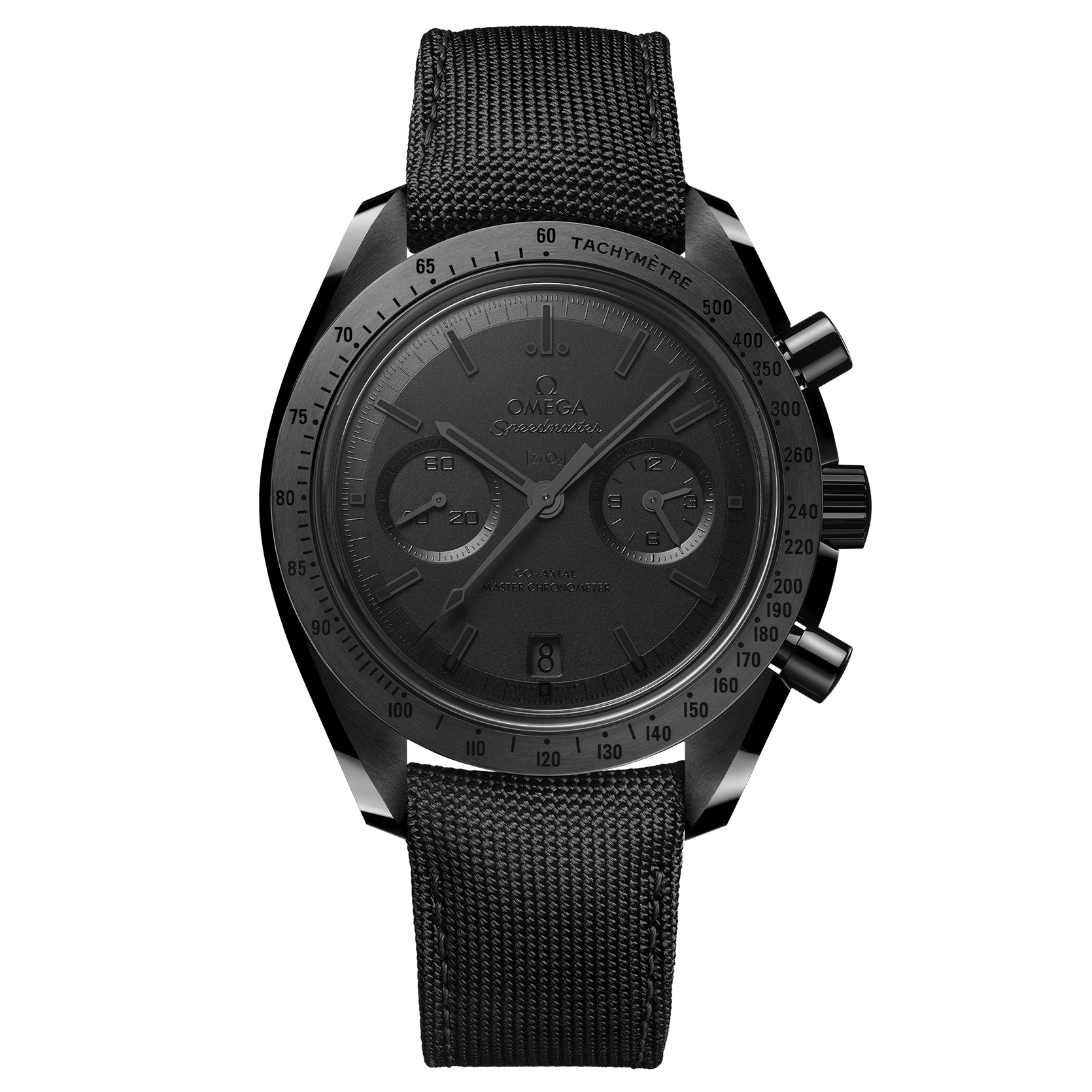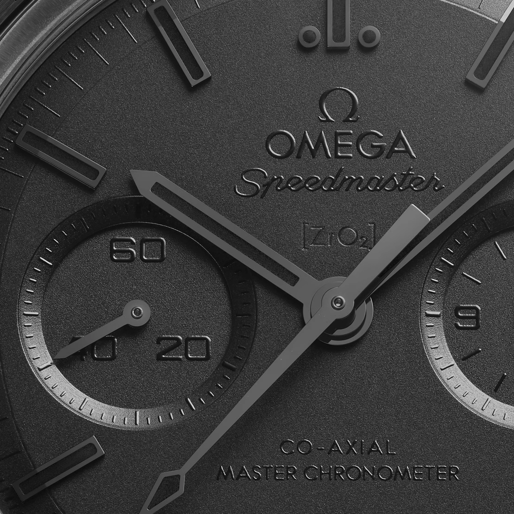 Ref. 310.92.44.51.01.003 - Diese Speedmaster Dark Side of the Moon „Black Black“ ist eine Hommage an OMEGAs Vermächtnis der Weltraumforschung. Sie besitzt ein 44,25 mm großes Gehäuse aus polierter, schwarzer Keramik. Die gebürstete Lünette ist ebenfalls aus schwarzer Keramik gefertigt und verfügt über eine lasergravierte, mit schwarzem „Grand Feu“-Email gefüllte Tachymeterskala. Das Keramikzifferblatt unter dem vorderen Saphirglas ist mit einem Laser sandgestrahlt und besitzt eine kleine Sekundenanzeige bei 9 Uhr, einen 60-Minuten- und 12-Stunden-Zähler bei 3 Uhr und ein Datumsfenster bei 6 Uhr. Alle Zeiger und abgeschrägten Indizes sind geschwärzt und mit schwarzem Super-LumiNova (grün leuchtend) gefüllt. Das durch den Gehäuseboden sichtbare OMEGA Co-Axial Master Chronometer Kaliber 9900 mit Automatikaufzug ist mit einem mattgeschwärzten Rotor, einer Hauptplatine und Brücken sowie schwarz lackierten Gravuren veredelt. Die Uhr wird an einem schwarzen Nylonarmband getragen und ist mit einer Faltschließe aus Keramik und Federklappen aus keramisiertem Titan ausgestattet.