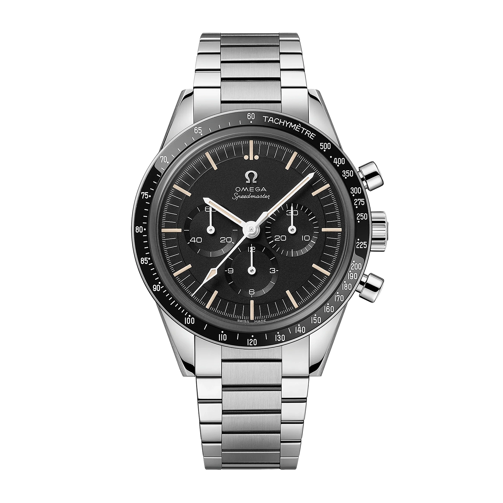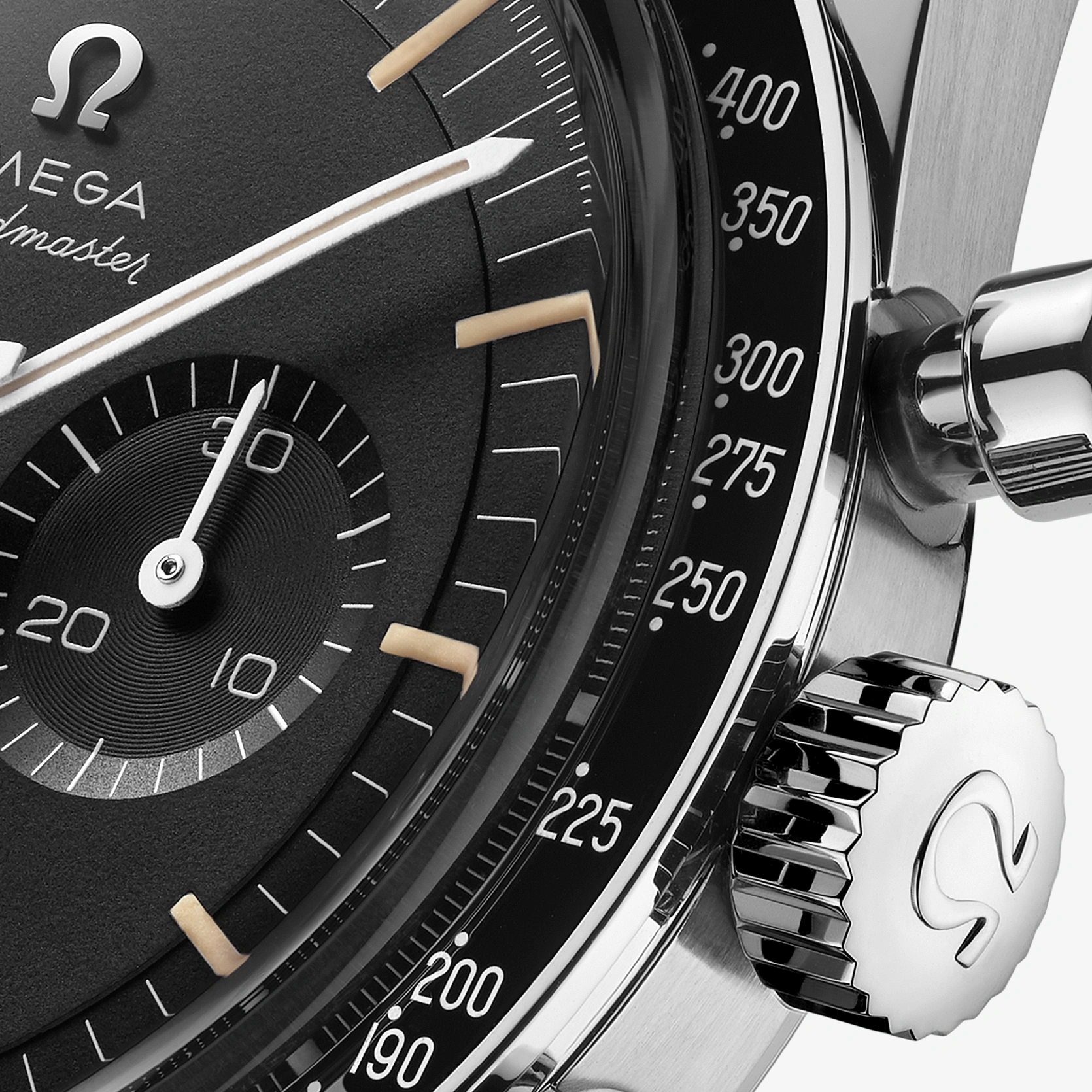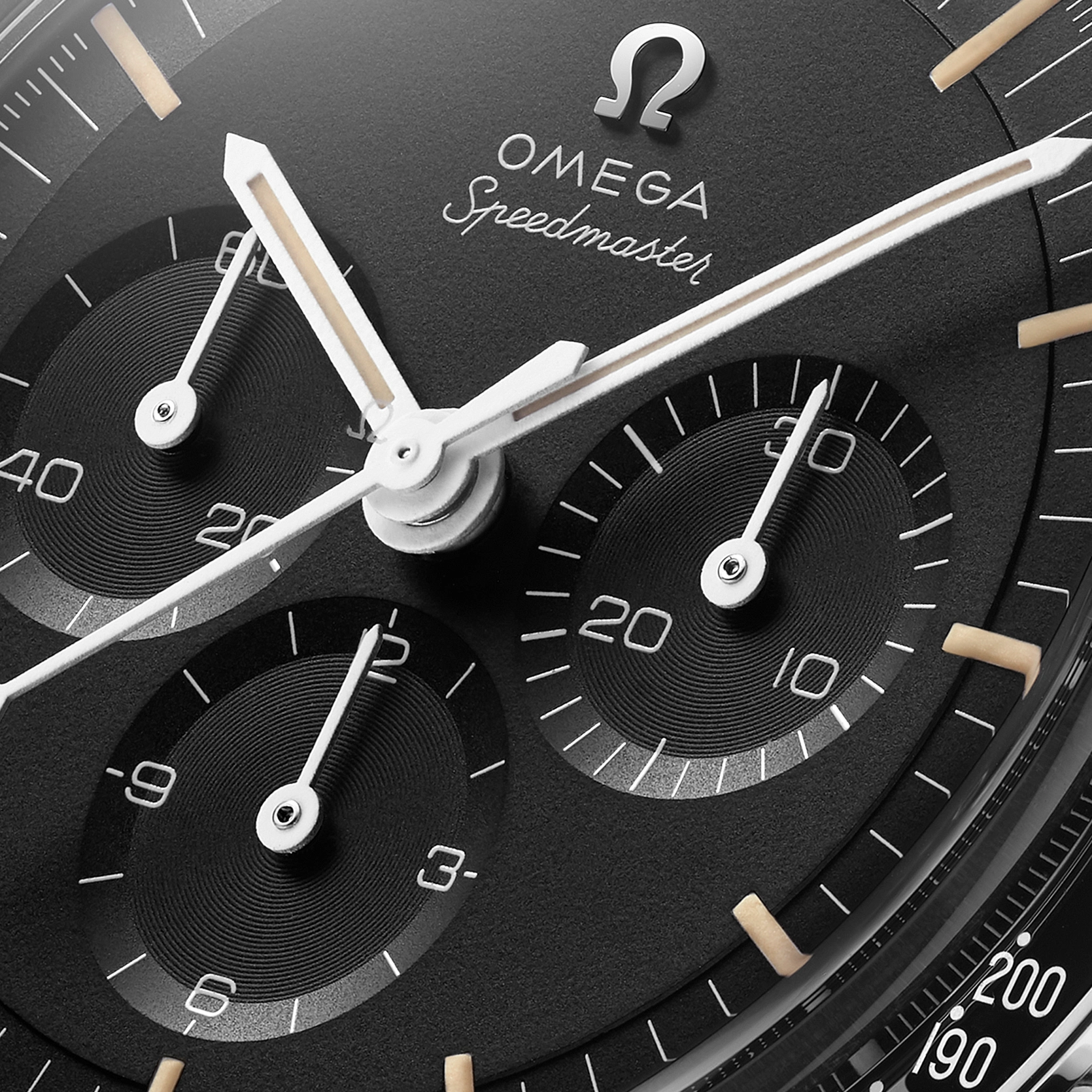 Ref. 311.30.40.30.01.001 - Die legendäre OMEGA Speedmaster, die bei allen sechs Mondmissionen dabei war, gehört zu den ikonischsten Zeitmessern der Welt. Dieses Modell ist mit dem berühmten Kaliber 321 ausgestattet, das eine bedeutende Rolle in der originalen Raumfahrtgeschichte der Speedmaster spielte. Das Edelstahlgehäuse mit einem Durchmesser von 39,70 mm schöpft seine Inspiration aus dem Stil der Speedmaster der 3. Generation, die während Amerikas erstem Weltraumspaziergang im Jahr 1965 getragen wurde. Außerdem besitzt der Zeitmesser einen Lünettenring aus polierter, schwarzer Keramik [ZrO2] mit einer Tachymeterskala aus weißem Email. Das abgestufte Zifferblatt ist mit den berühmten Moonwatch-Zeigern, einem OMEGA Vintage-Logo sowie einem Hilfszifferblatt für die kleine Sekunde, einem 30-Minuten-Zähler und einem 12-Stunden-Zähler zusammen mit einem zentralen Chronographenzeiger ausgestattet. Durch den Gehäuseboden aus Saphirglas ist das Kaliber 321 im Inneren sichtbar.
