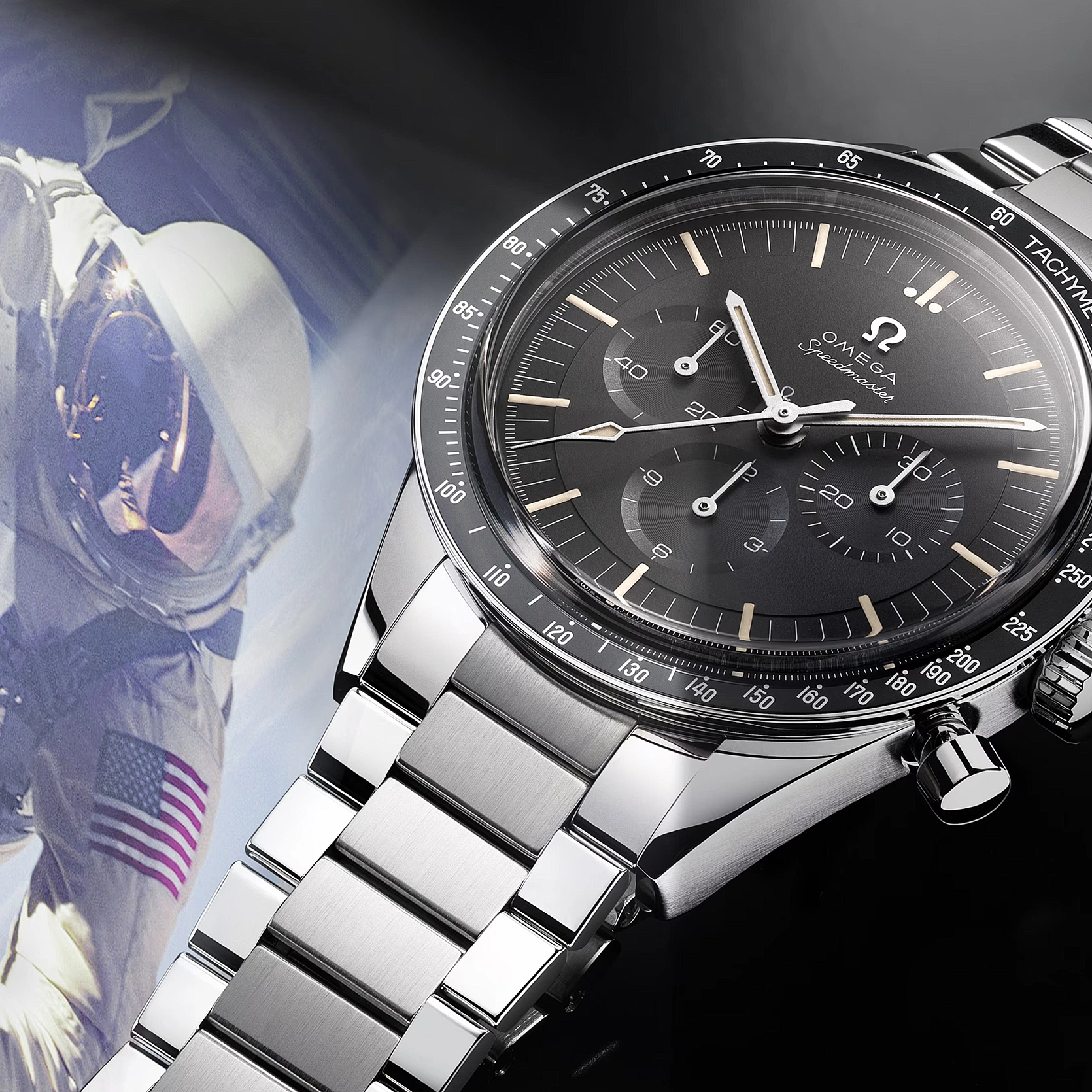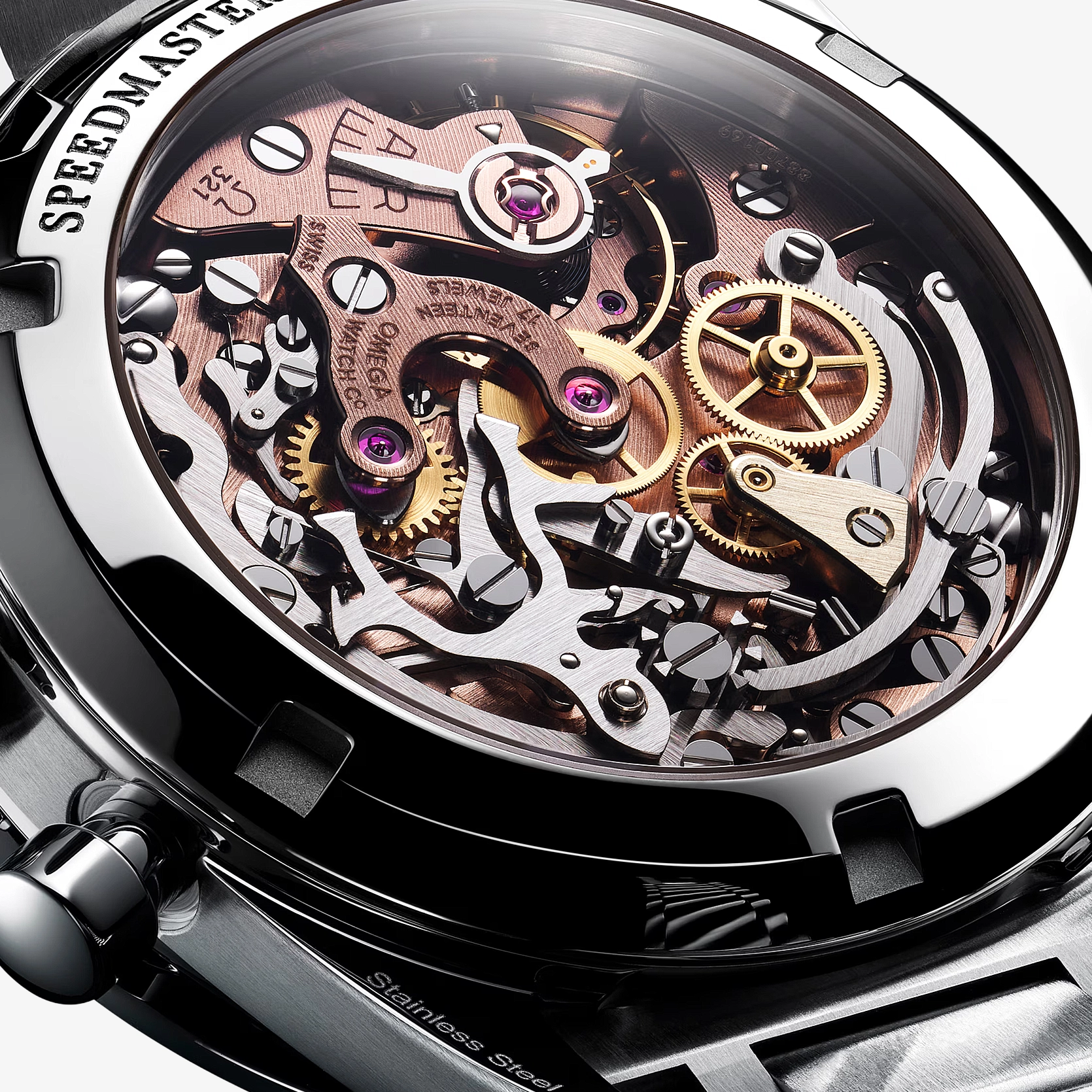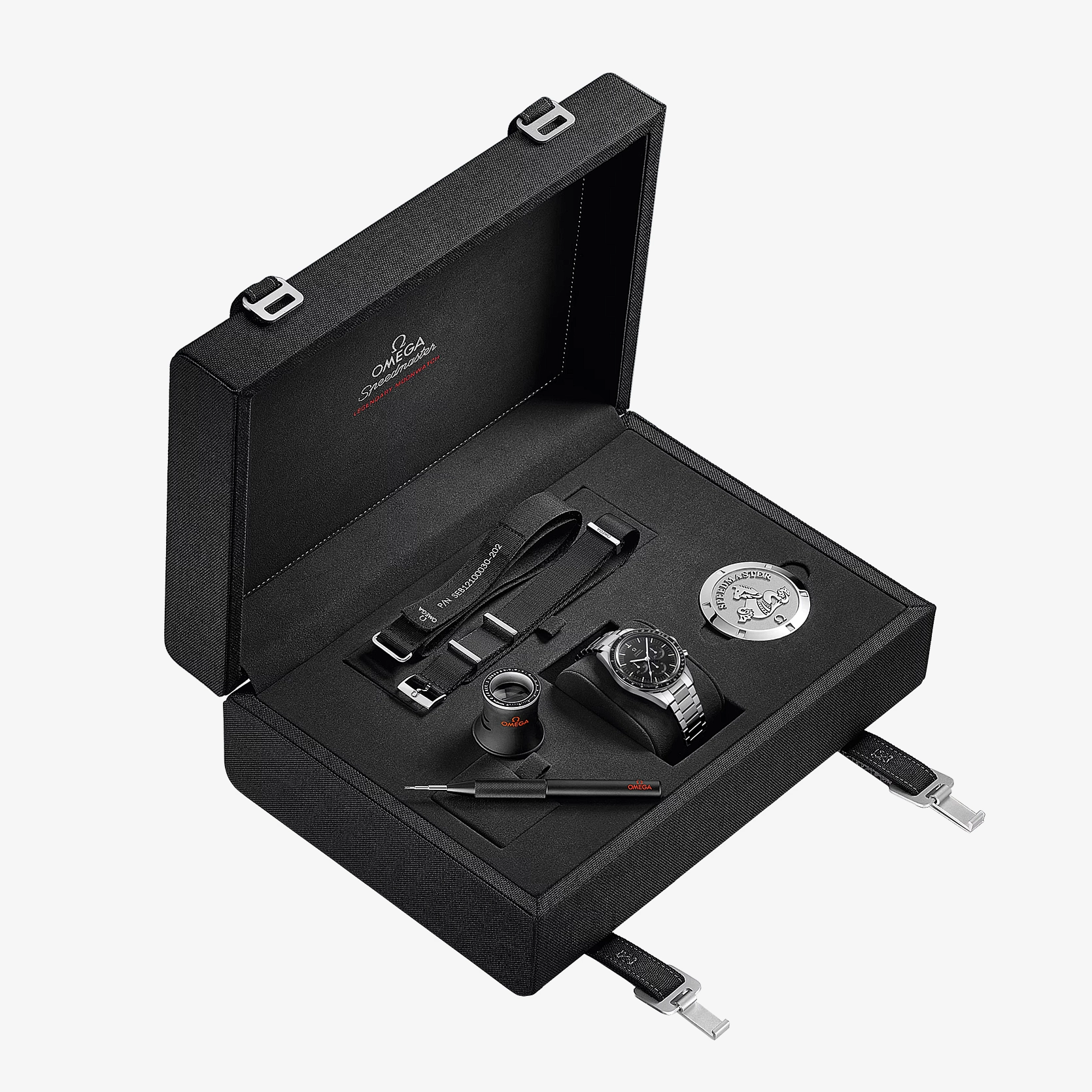 Ref. 311.30.40.30.01.001 - Die legendäre OMEGA Speedmaster, die bei allen sechs Mondmissionen dabei war, gehört zu den ikonischsten Zeitmessern der Welt. Dieses Modell ist mit dem berühmten Kaliber 321 ausgestattet, das eine bedeutende Rolle in der originalen Raumfahrtgeschichte der Speedmaster spielte. Das Edelstahlgehäuse mit einem Durchmesser von 39,70 mm schöpft seine Inspiration aus dem Stil der Speedmaster der 3. Generation, die während Amerikas erstem Weltraumspaziergang im Jahr 1965 getragen wurde. Außerdem besitzt der Zeitmesser einen Lünettenring aus polierter, schwarzer Keramik [ZrO2] mit einer Tachymeterskala aus weißem Email. Das abgestufte Zifferblatt ist mit den berühmten Moonwatch-Zeigern, einem OMEGA Vintage-Logo sowie einem Hilfszifferblatt für die kleine Sekunde, einem 30-Minuten-Zähler und einem 12-Stunden-Zähler zusammen mit einem zentralen Chronographenzeiger ausgestattet. Durch den Gehäuseboden aus Saphirglas ist das Kaliber 321 im Inneren sichtbar.