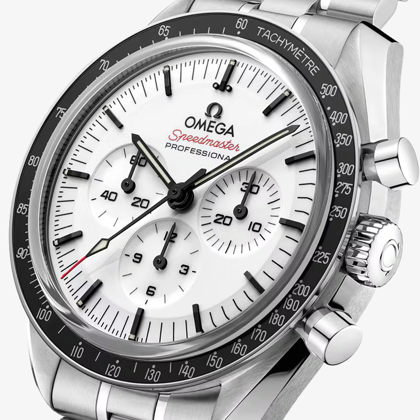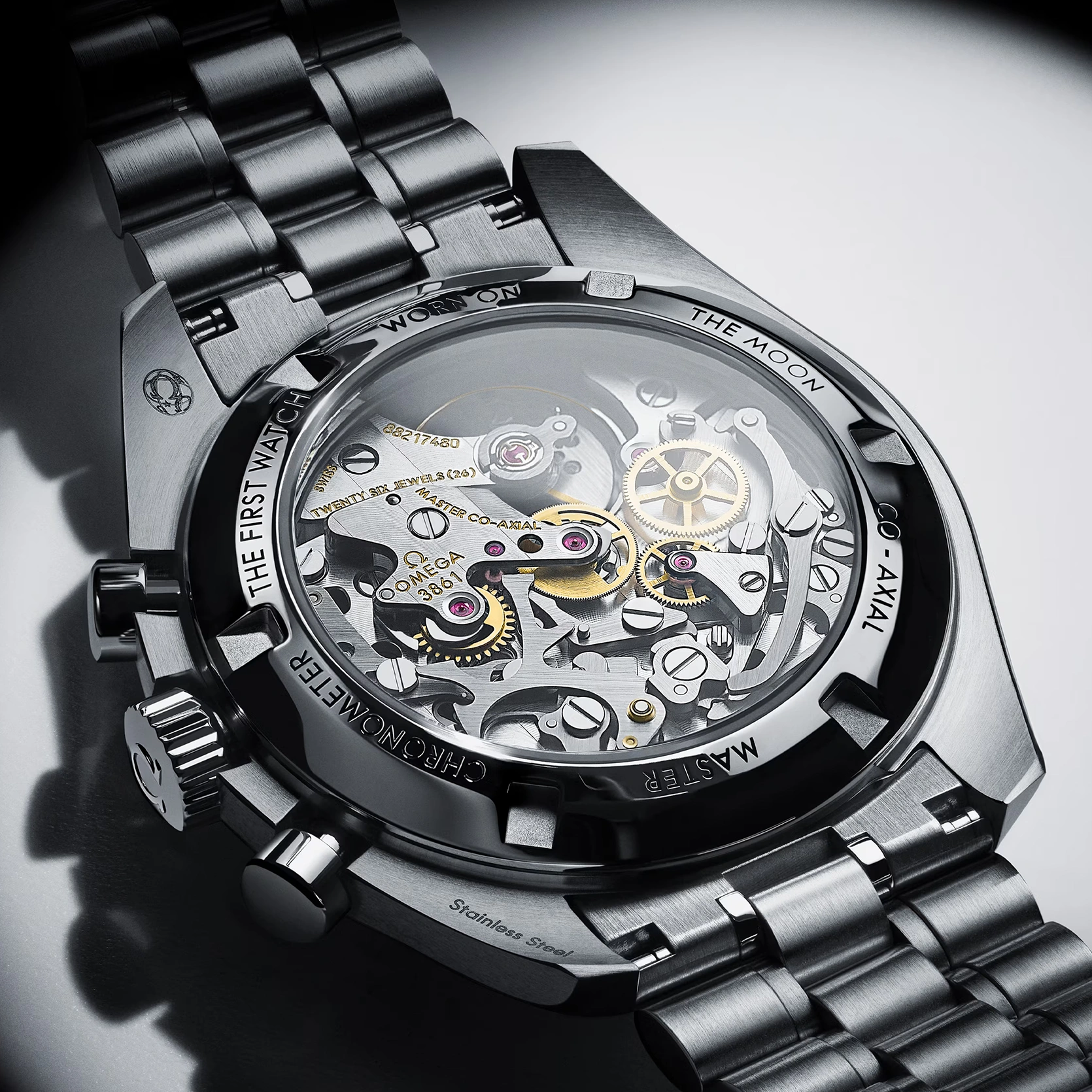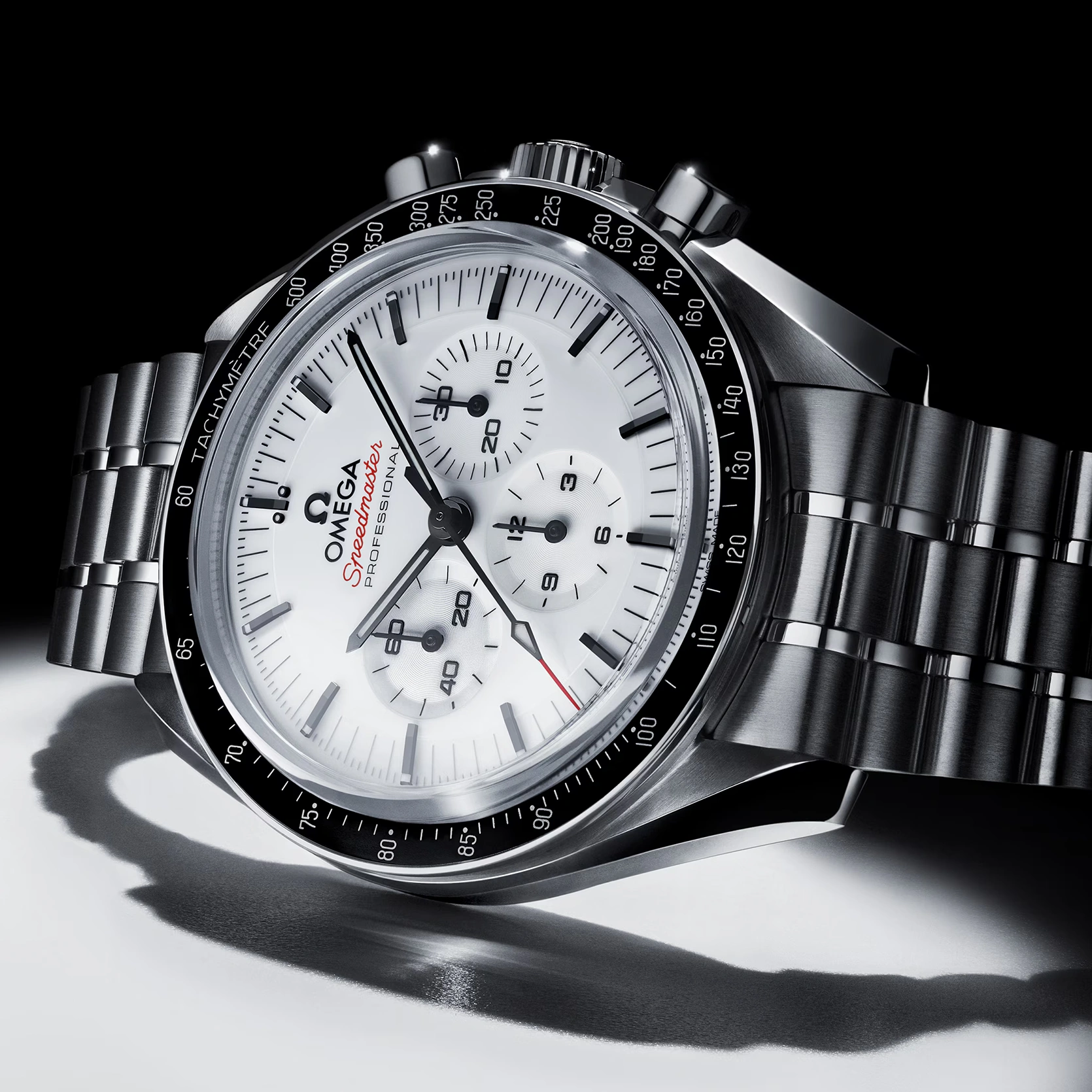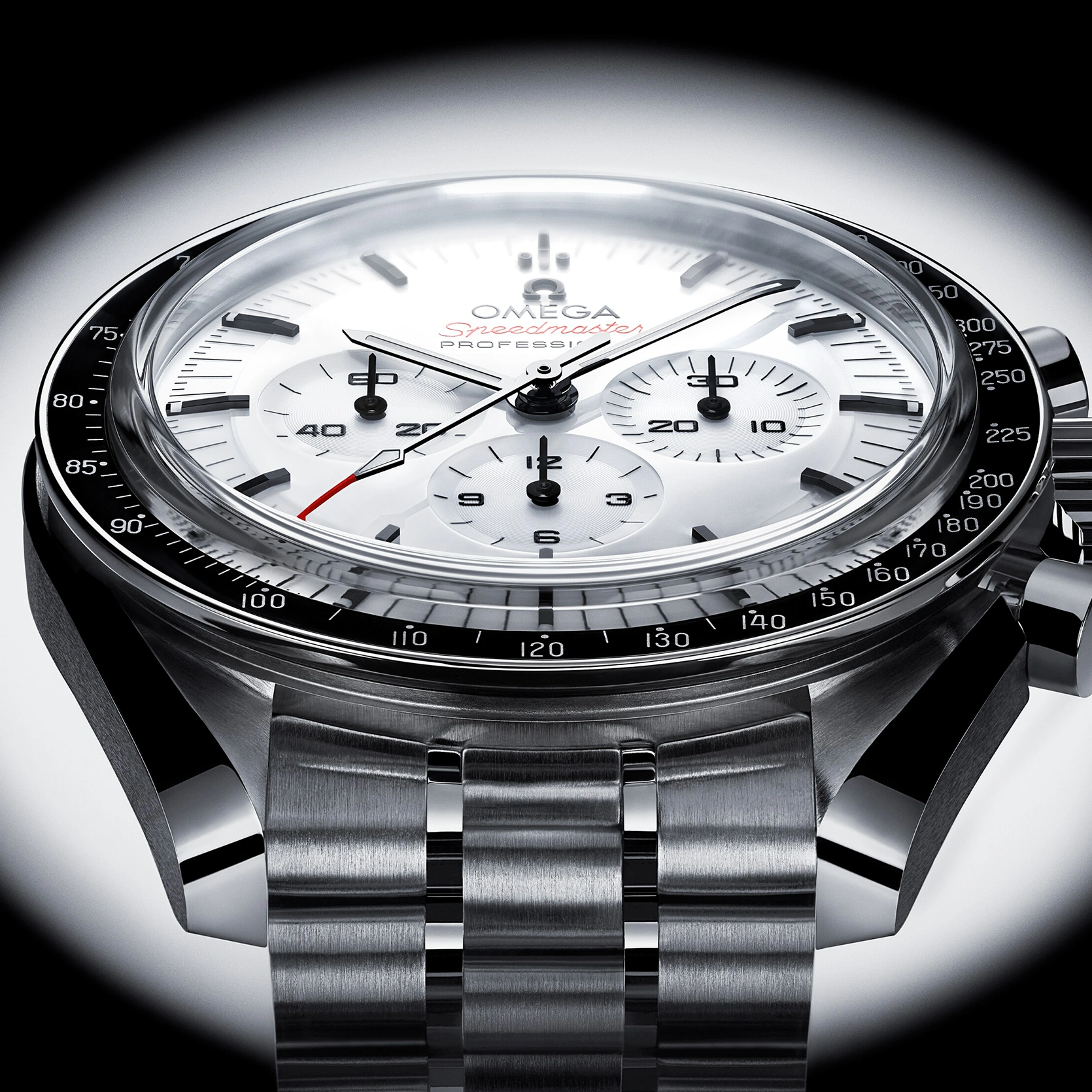 Diese 42-mm-Moonwatch aus Edelstahl wird von einem polierten und gebürsteten Metallarmband am Handgelenk gehalten. Als Uhrglas und Gehäuseboden dient Saphirglas. Inspiriert von der 4. Generation der Speedmaster, die auf dem Mond getragen wurde, besitzt das Modell auch ein asymmetrisches Gehäuse, ein weiß lackiertes, abgestuftes Zifferblatt mit appliziertem OMEGA Logo und applizierten Indizes, Zeiger im Moonwatch-Stil und den berühmten Punkt über der 90 auf dem Lünettenring aus schwarzem, eloxiertem Aluminium. Angetrieben wird die Uhr von dem OMEGA Co-Axial Master Chronometer Kaliber 3861, das neben der zentralen Chronographenfunktion über eine kleine Sekunde, einen 30-Minuten-Zähler und einen 12-Stunden-Zähler verfügt.