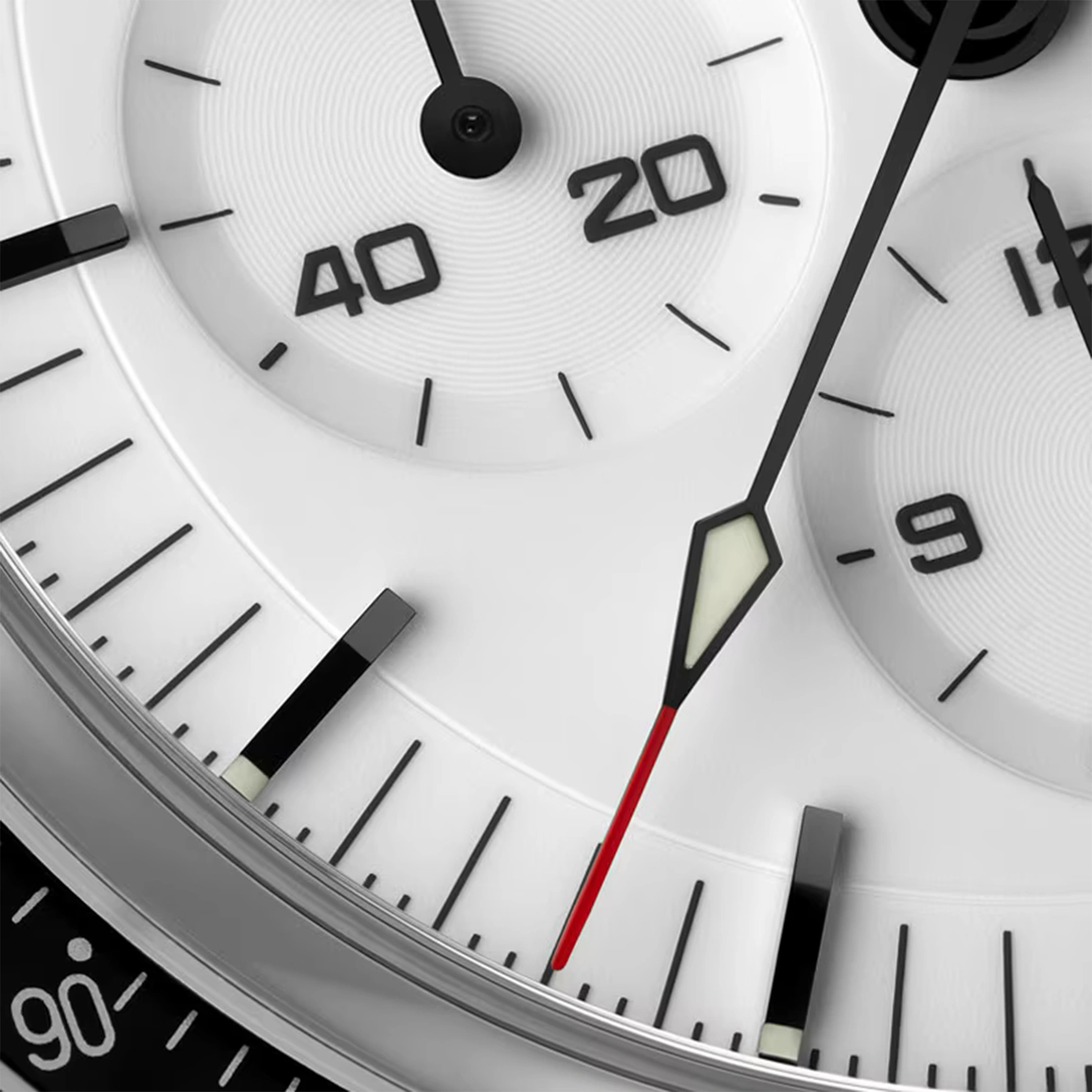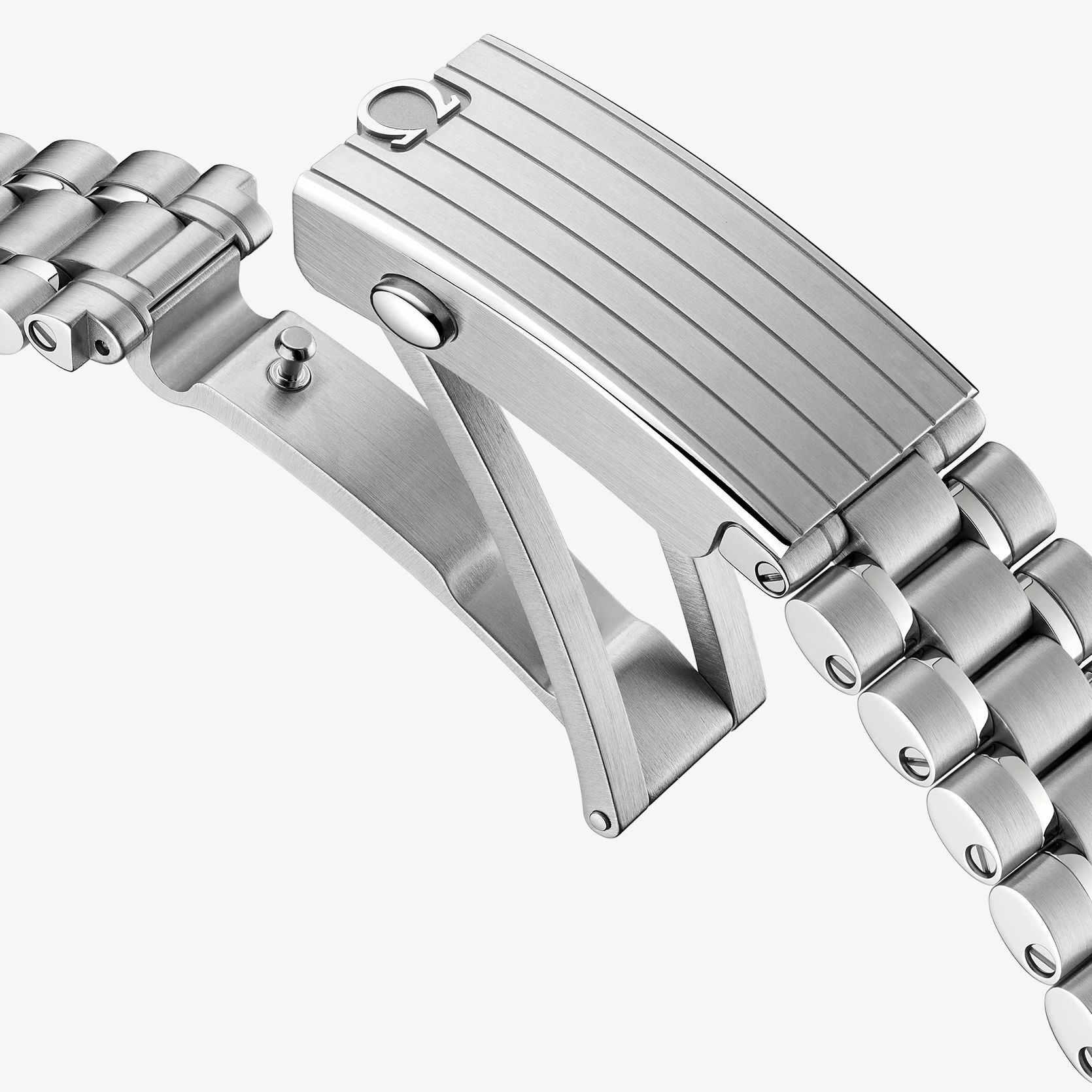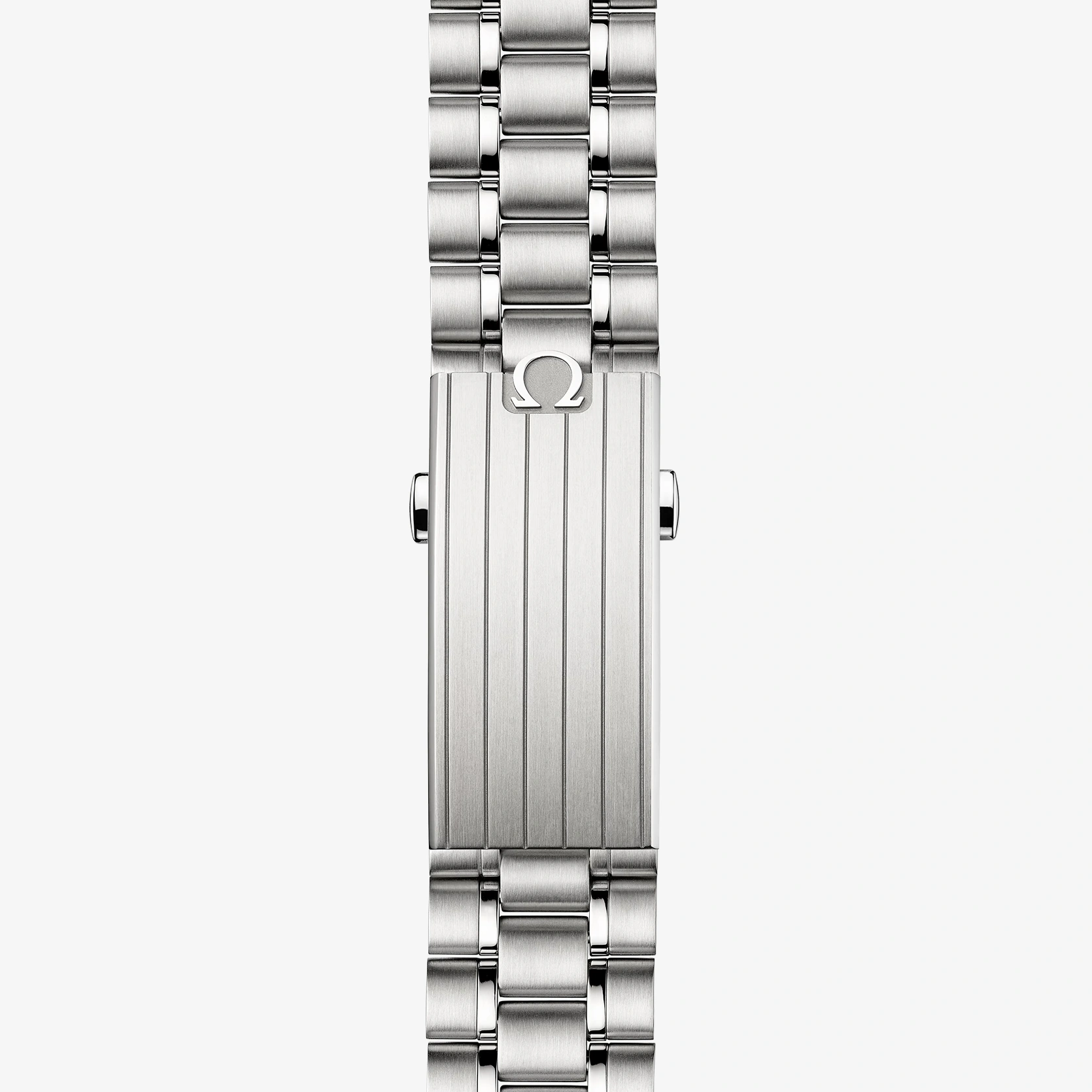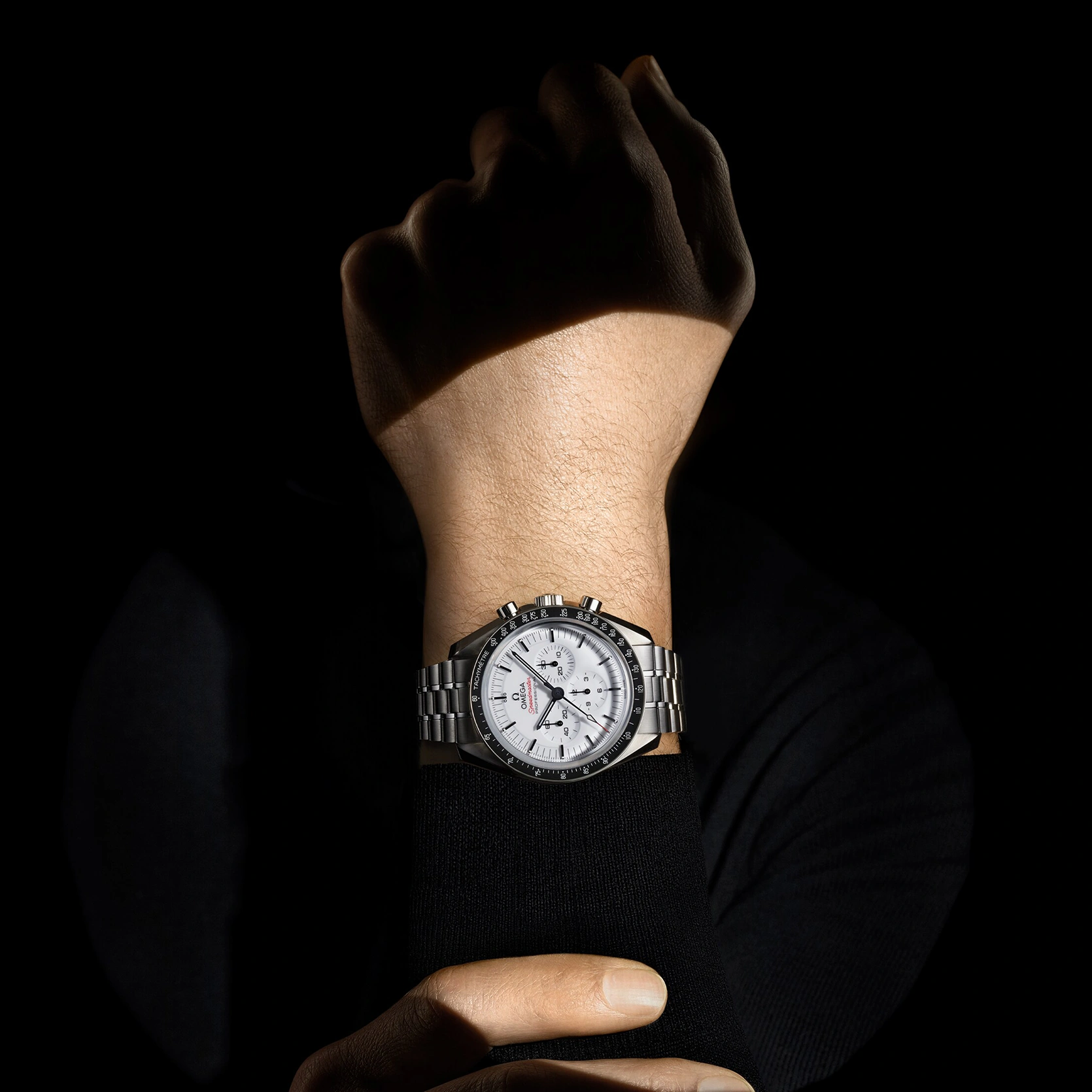 Diese 42-mm-Moonwatch aus Edelstahl wird von einem polierten und gebürsteten Metallarmband am Handgelenk gehalten. Als Uhrglas und Gehäuseboden dient Saphirglas. Inspiriert von der 4. Generation der Speedmaster, die auf dem Mond getragen wurde, besitzt das Modell auch ein asymmetrisches Gehäuse, ein weiß lackiertes, abgestuftes Zifferblatt mit appliziertem OMEGA Logo und applizierten Indizes, Zeiger im Moonwatch-Stil und den berühmten Punkt über der 90 auf dem Lünettenring aus schwarzem, eloxiertem Aluminium. Angetrieben wird die Uhr von dem OMEGA Co-Axial Master Chronometer Kaliber 3861, das neben der zentralen Chronographenfunktion über eine kleine Sekunde, einen 30-Minuten-Zähler und einen 12-Stunden-Zähler verfügt.