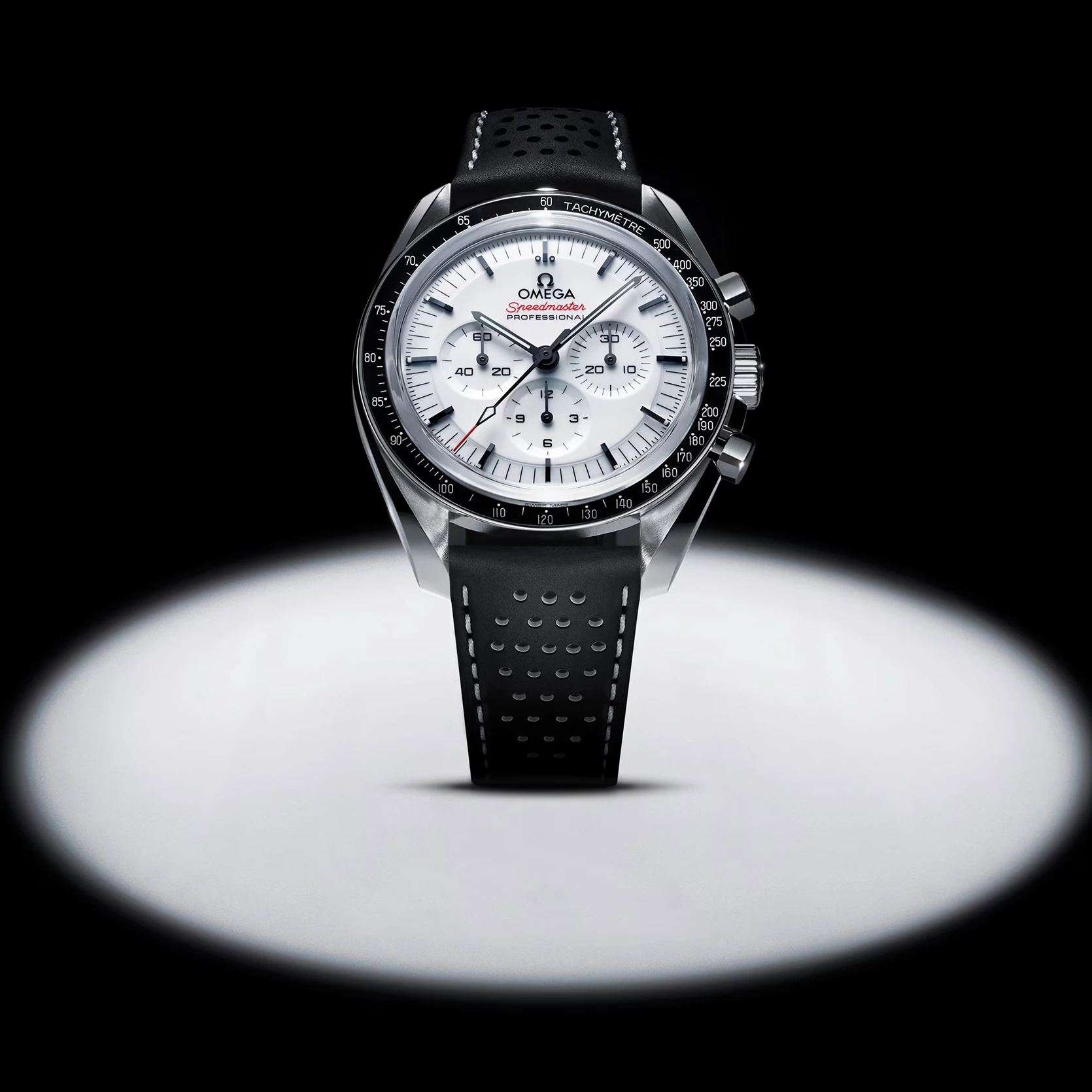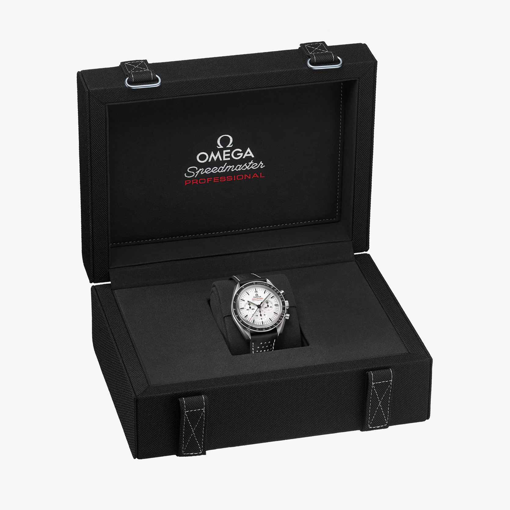 Ref. 310.32.42.50.04.002 - Die Speedmaster Moonwatch gehört zu den legendärsten Zeitmessern der Welt. Der beeindruckende Chronograph, der bei allen sechs Mondlandungen dabei war, verkörpert perfekt den risikofreudigen Pioniergeist der Marke. Diese 42-mm-Moonwatch aus Edelstahl wird von einem mikroperforierten, schwarzen Lederarmband mit rot-weißer Naht am Handgelenk gehalten. Als Uhrglas und Gehäuseboden dient Saphirglas. Inspiriert von der 4. Generation der Speedmaster, die auf dem Mond getragen wurde, besitzt das Modell auch ein asymmetrisches Gehäuse, ein weiß lackiertes, abgestuftes Zifferblatt mit appliziertem OMEGA Logo und applizierten Indizes, Zeiger im Moonwatch-Stil und den berühmten Punkt über der 90 auf dem Lünettenring aus schwarzem, eloxiertem Aluminium. Angetrieben wird die Uhr von dem OMEGA Co-Axial Master Chronometer Kaliber 3861, das neben der zentralen Chronographenfunktion über eine kleine Sekunde, einen 30-Minuten-Zähler und einen 12-Stunden-Zähler verfügt.