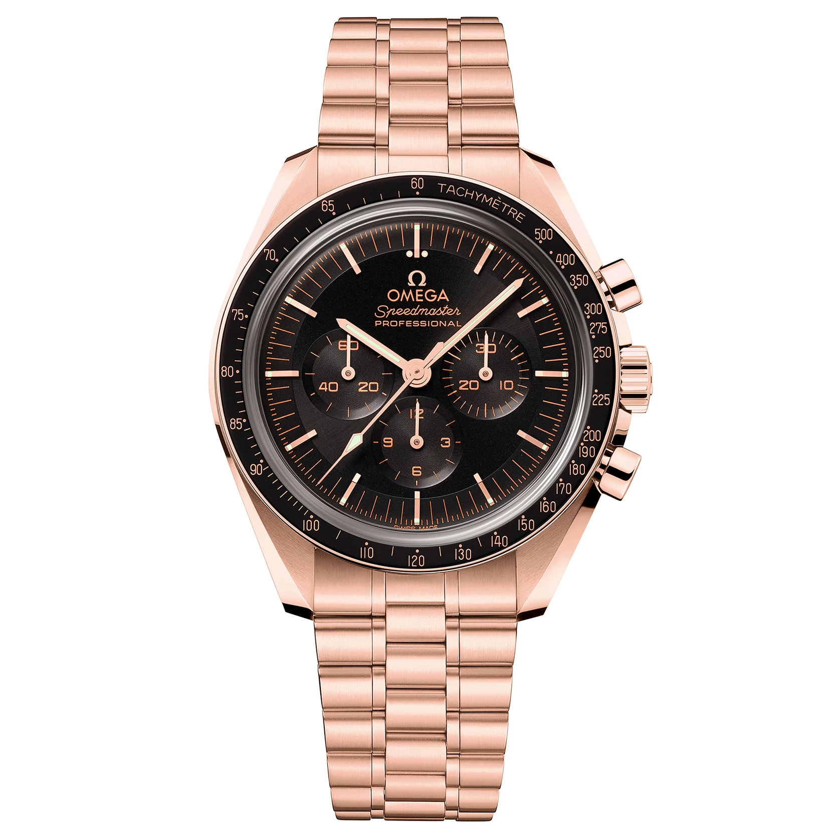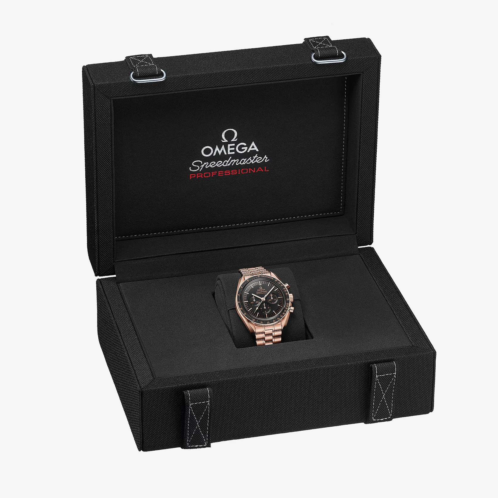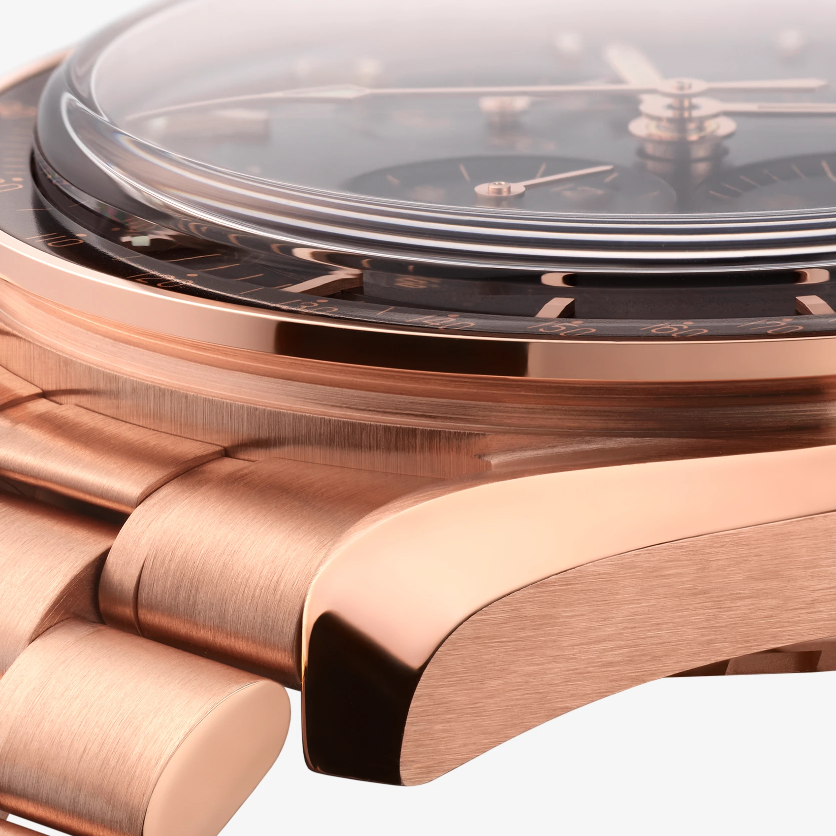 Das Armband dieser 42-mm-Moonwatch aus 18 K Sedna™-Gold weist ein Design mit fünf gebogenen Gliedern pro Reihe auf. Als Uhrglas und Gehäuseboden dient Saphirglas. Inspiriert von der 4. Generation der Speedmaster, die auf dem Mond getragen wurde, besitzt das Modell auch ein asymmetrisches Gehäuse, ein schwarz abgestuftes Zifferblatt und den berühmten Punkt über der 90 auf dem Lünettenring aus eloxiertem Aluminium. Angetrieben wird die Uhr von dem OMEGA Co-Axial Master Chronometer Kaliber 3861, das neben der zentralen Chronographenfunktion über eine kleine Sekunde, einen 30-Minuten-Zähler und einen 12-Stunden-Zähler verfügt.
