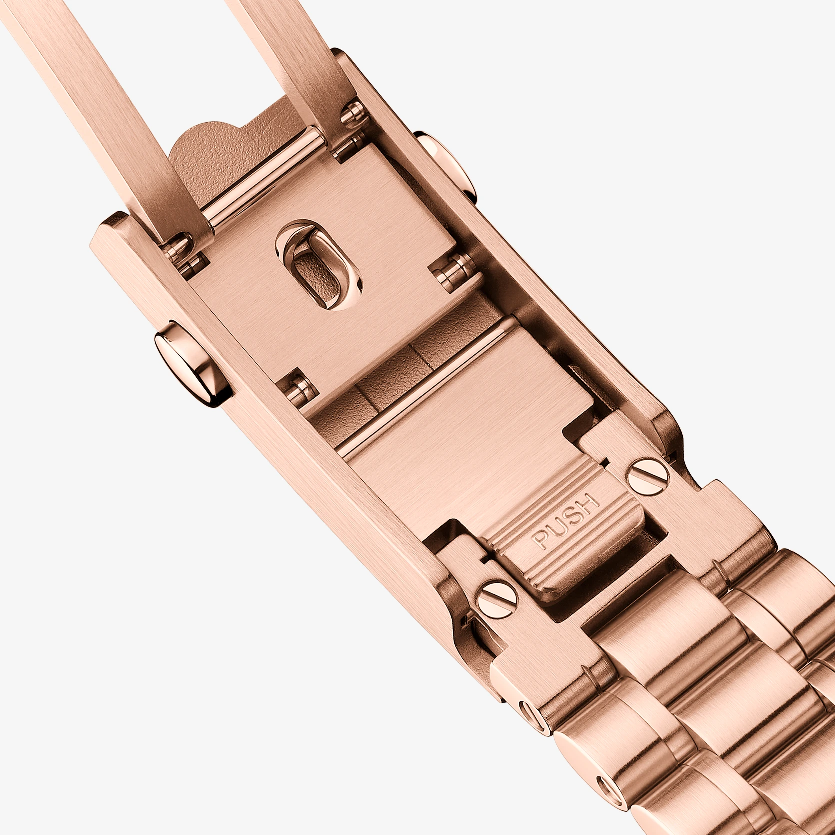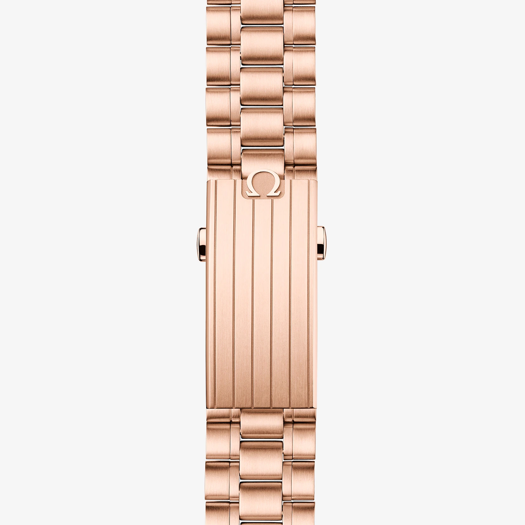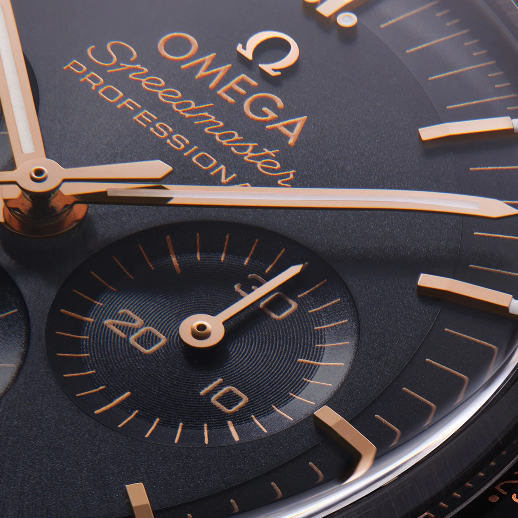 Das Armband dieser 42-mm-Moonwatch aus 18 K Sedna™-Gold weist ein Design mit fünf gebogenen Gliedern pro Reihe auf. Als Uhrglas und Gehäuseboden dient Saphirglas. Inspiriert von der 4. Generation der Speedmaster, die auf dem Mond getragen wurde, besitzt das Modell auch ein asymmetrisches Gehäuse, ein schwarz abgestuftes Zifferblatt und den berühmten Punkt über der 90 auf dem Lünettenring aus eloxiertem Aluminium. Angetrieben wird die Uhr von dem OMEGA Co-Axial Master Chronometer Kaliber 3861, das neben der zentralen Chronographenfunktion über eine kleine Sekunde, einen 30-Minuten-Zähler und einen 12-Stunden-Zähler verfügt.