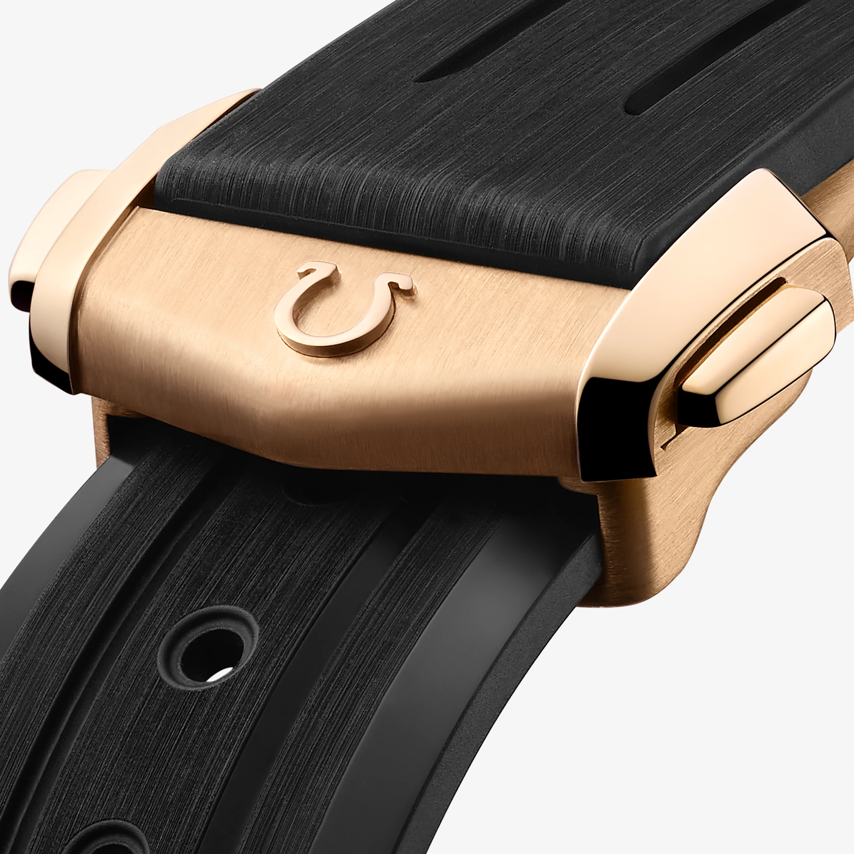 Die von der 4. Speedmaster Generation inspirierte 42-mm-Moonwatch aus 18 K Moonshine™-Gold hat ein „abgestuftes“ Zifferblatt aus 18 K Moonshine™-Gold mit Sonnenschliff und schwarzen Hilfszifferblättern und Indizes. ...Der schwarze Keramik-Lünettenring mit OMEGA Ceragold™-Tachymeterskala ist mit dem berühmten „Punkt über der 90“ versehen. Als Hommage an ihre Geschichte ist die Unterseite des integrierten schwarzen Kautschukarmbandes mit einem Mondoberflächenmuster in positivem Relief versehen. Der doppelt abgeschrägte Gehäuseboden aus poliertem 18 K Moonshine™-Gold ist mit den Worten FIRST WATCH WORN ON THE MOON in Schwarz graviert. Die Moonwatch wird von OMEGAs Co-Axial Master Chronometer Kaliber 3861 mit einem besonderen, luxuriösen Finish angetrieben.