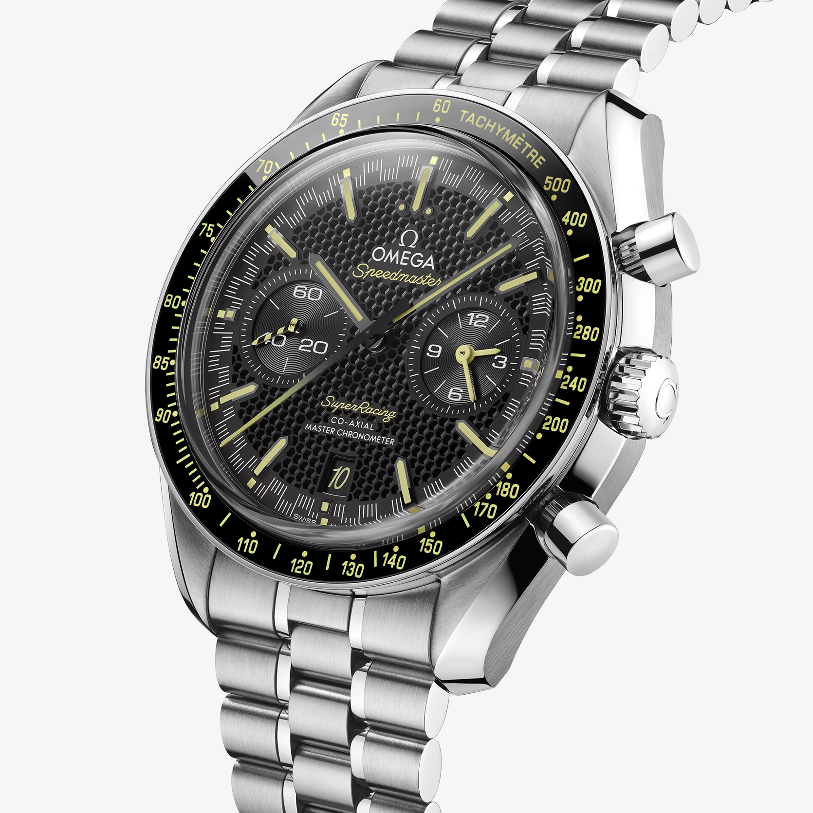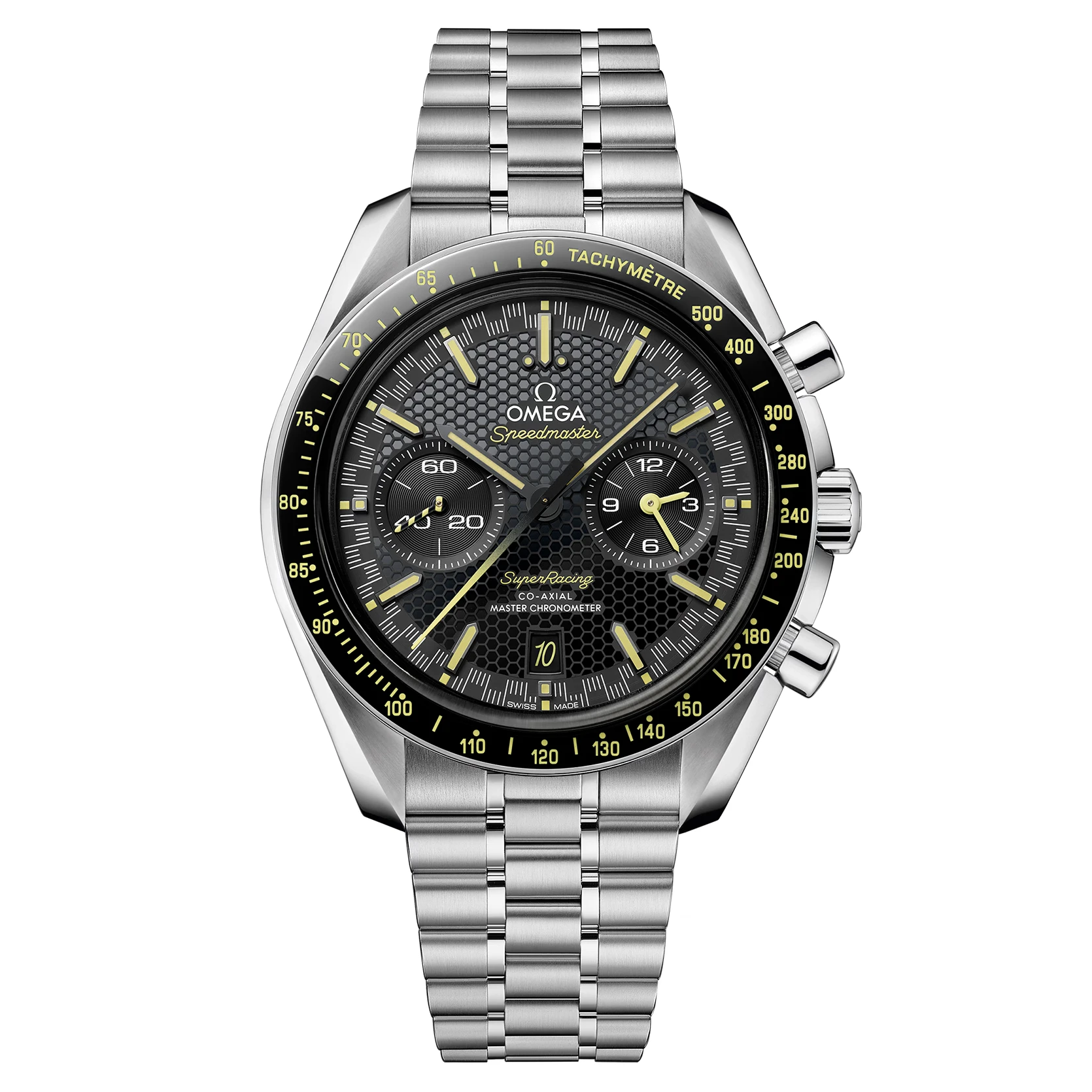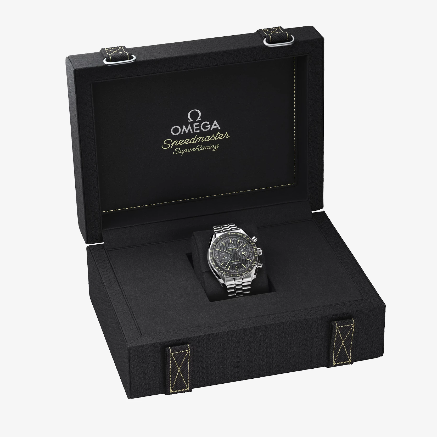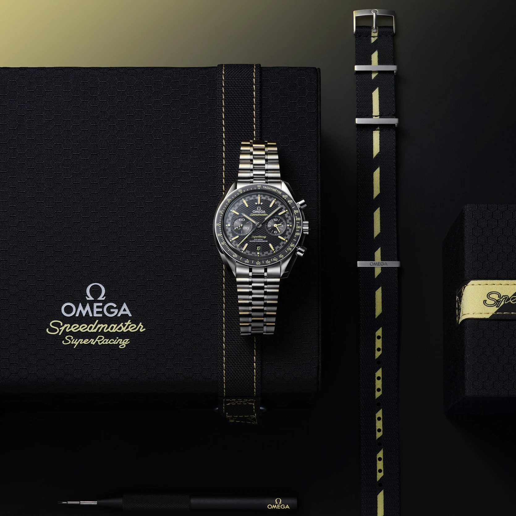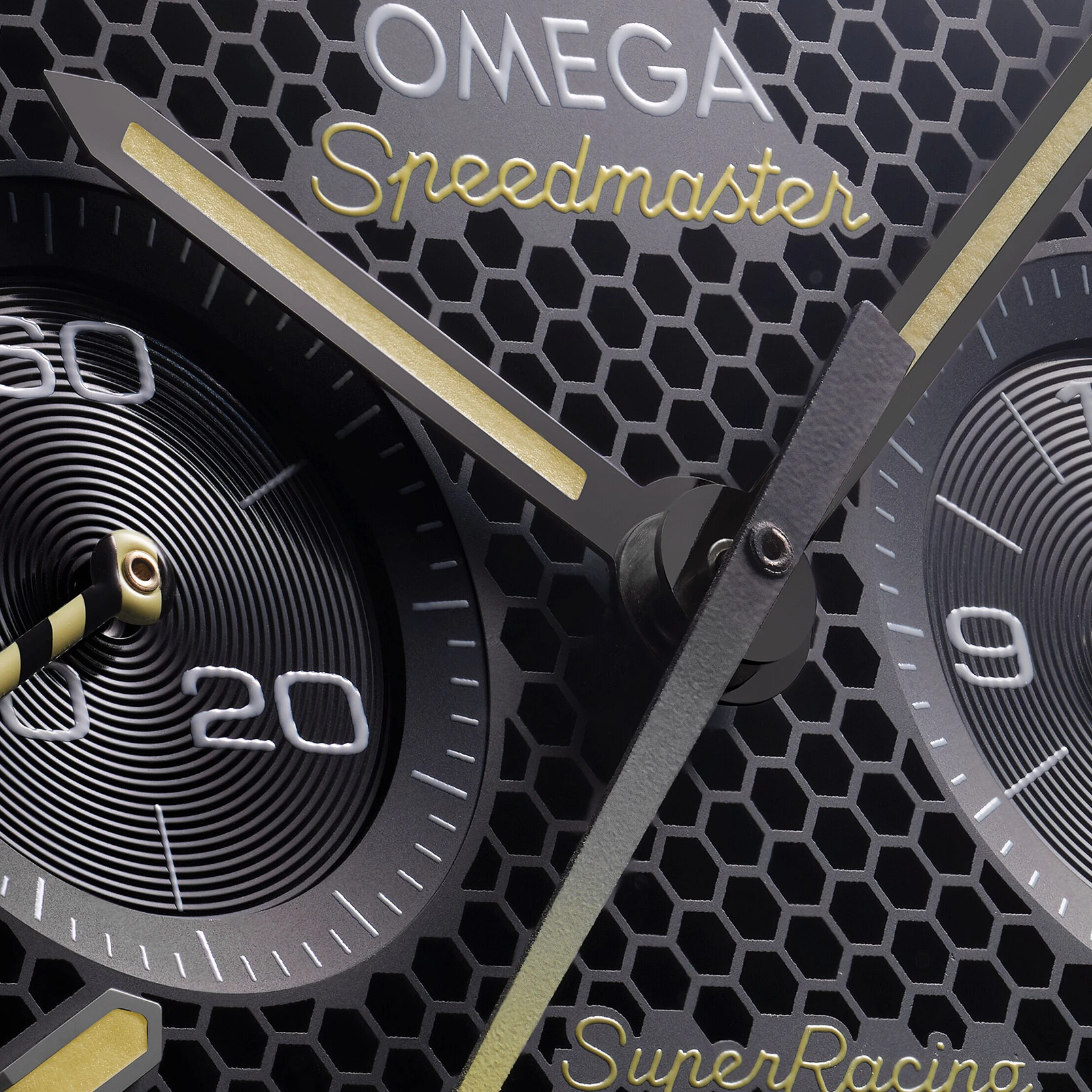 Die Uhr verfügt über ein schwarzes Sandwich-Zifferblatt mit Wabenmuster und einem Minutenring im Racing-Stil, dem sie ihren Namen verdankt. Das Zifferblatt wird von einem schwarzen Keramik-Lünettenring mit Tachymeterskala aus gelbem „Grand Feu“-Email umrahmt. Diese leuchtend gelbe Farbe wurde auch auf dem Chronographenzeiger mit Farbverlauf und dem gelb-schwarz gestreiften Sekundenzeiger auf dem Hilfszifferblatt bei 9 Uhr verwendet. Der 60-Minuten- und 12-Stunden-Zähler befindet sich auf dem gegenüberliegenden Hilfszifferblatt bei 3 Uhr, während bei 6 Uhr ein Datumsfenster angeordnet ist. Die „10“ der Datumsanzeige erscheint als Hommage an das Jubiläum der Seamaster Aqua Terra >15.000 GAUSS in der Schriftart des Speedmaster-Logos. Die diamantpolierten und abgeschrägten schwarzen Indizes mit Pfeilspitzen sind mit gelber Super-LumiNova gefüllt, die ein gelbes Leuchten erzeugt. Dieser Farbcode setzt sich auf den Schriftzügen Speedmaster und Super Racing auf dem Zifferblatt fort. Angetrieben wird die Uhr von OMEGAs Co-Axial Master Chronometer 9920, das von METAS nach dem höchsten Branchenstandard zertifiziert wurde. Das erste Uhrwerk der Welt mit OMEGAs zum Patent angemeldeten Spirate™-System. Der Zeitmesser wird in einer schwarzen Speedmaster Uhrenbox mit Wabenmuster und gelben Nähten geliefert, in der auch ein NATO-Armband aus recyceltem Nylon mit schwarzen und gelben Steifen enthalten ist.